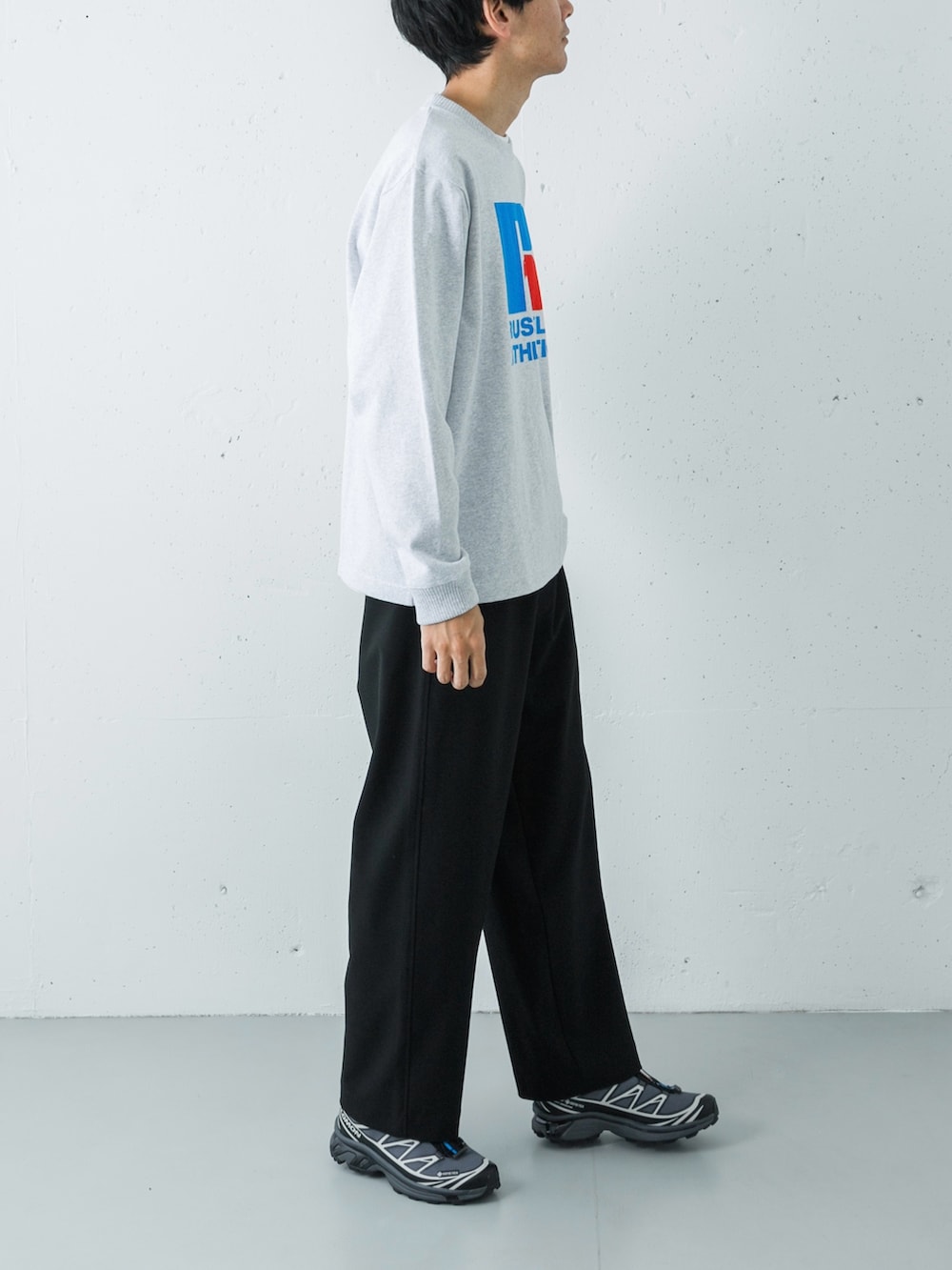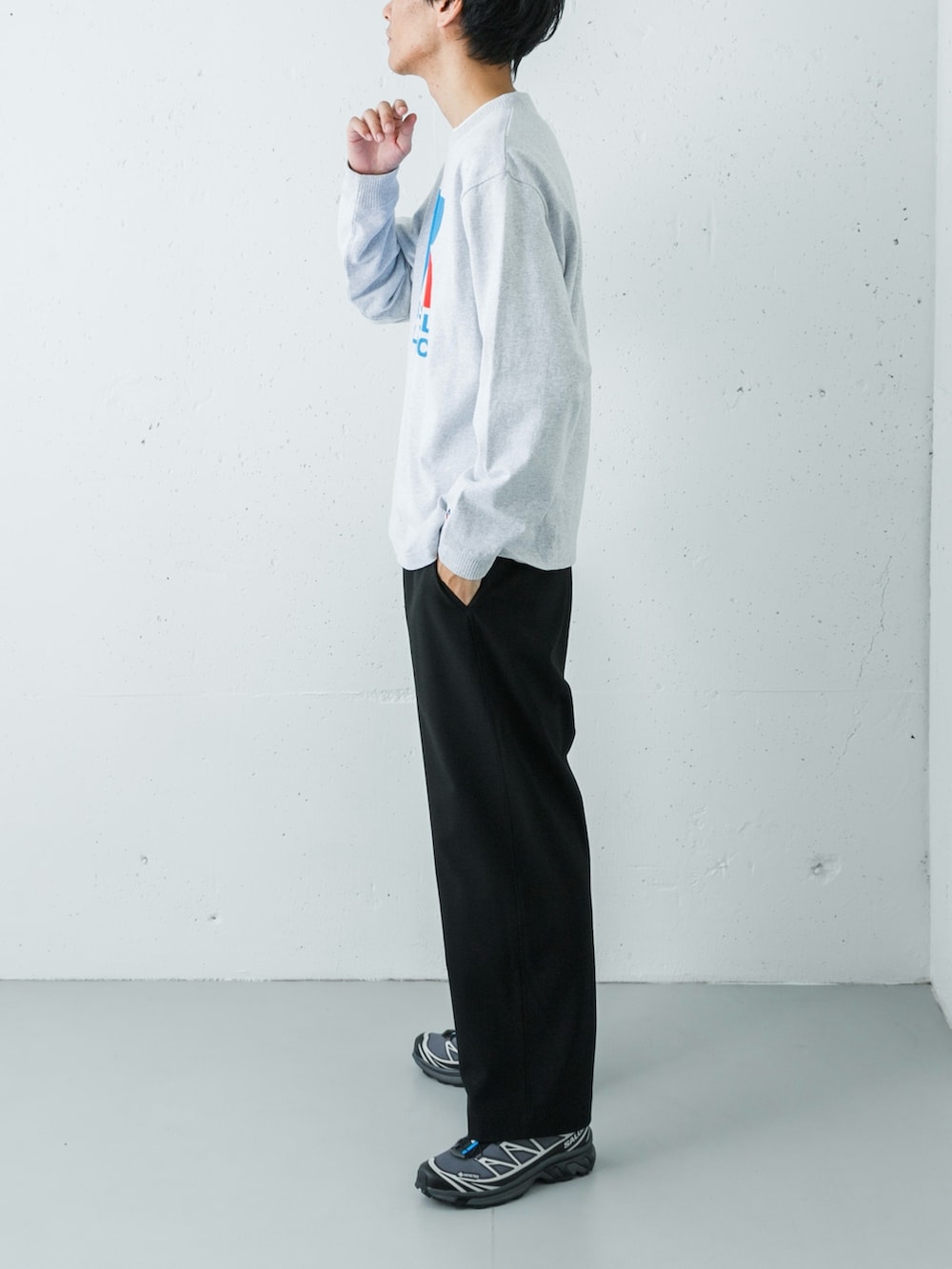 トップスは、ガシッとした肉厚な生地感が魅力のプリントヘビージャージーロンT。アッシュグレーの絶妙な掠れ感とプリントのアクセントが、一枚でも十分に主役級の存在感を放ちます。ヘビーウェイトならではの立体的なシルエットが、男らしいタフな印象を演出しています。