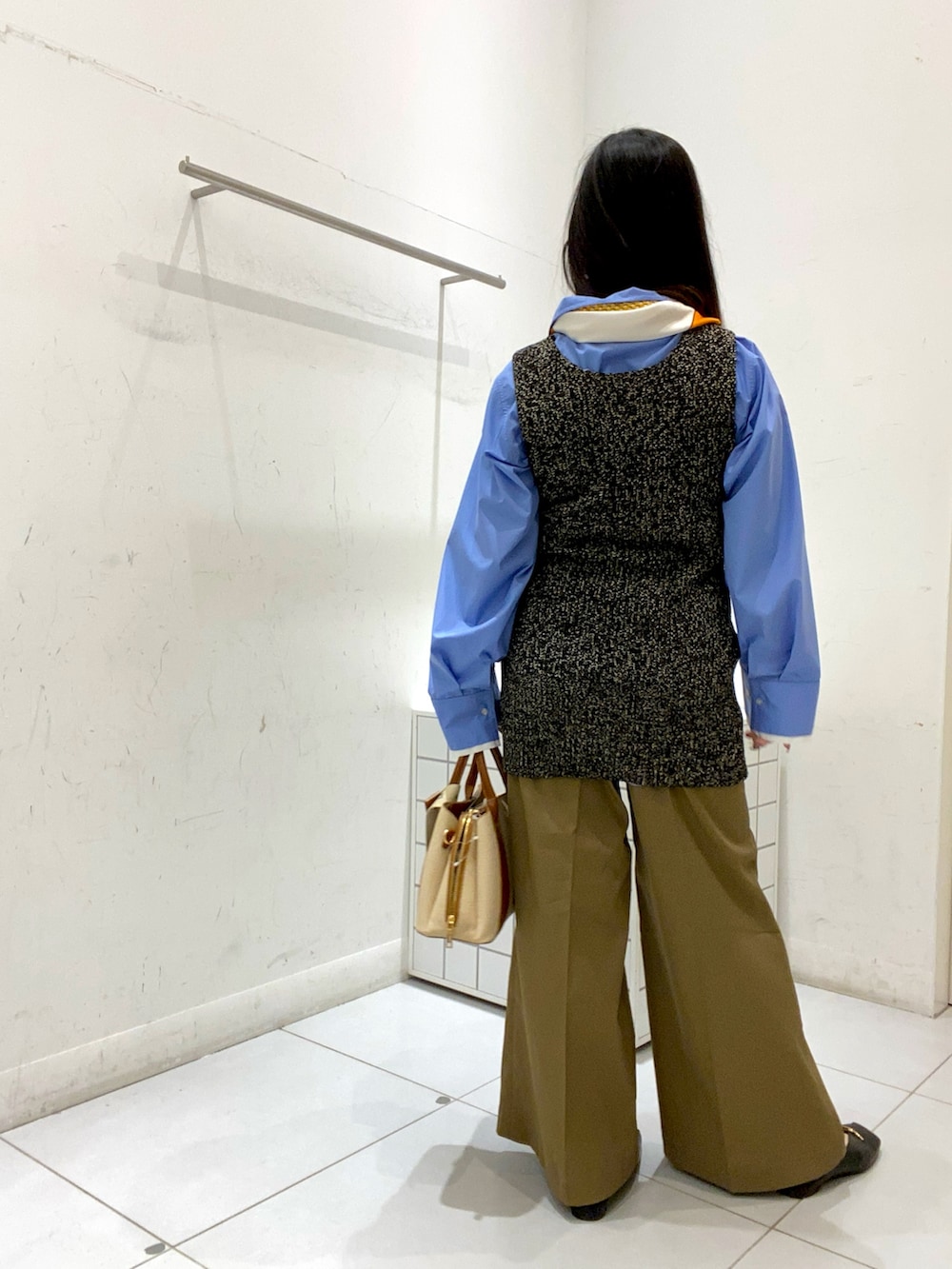 色を統一し、スカーフやバッグでオシャレに、こなれ感を。