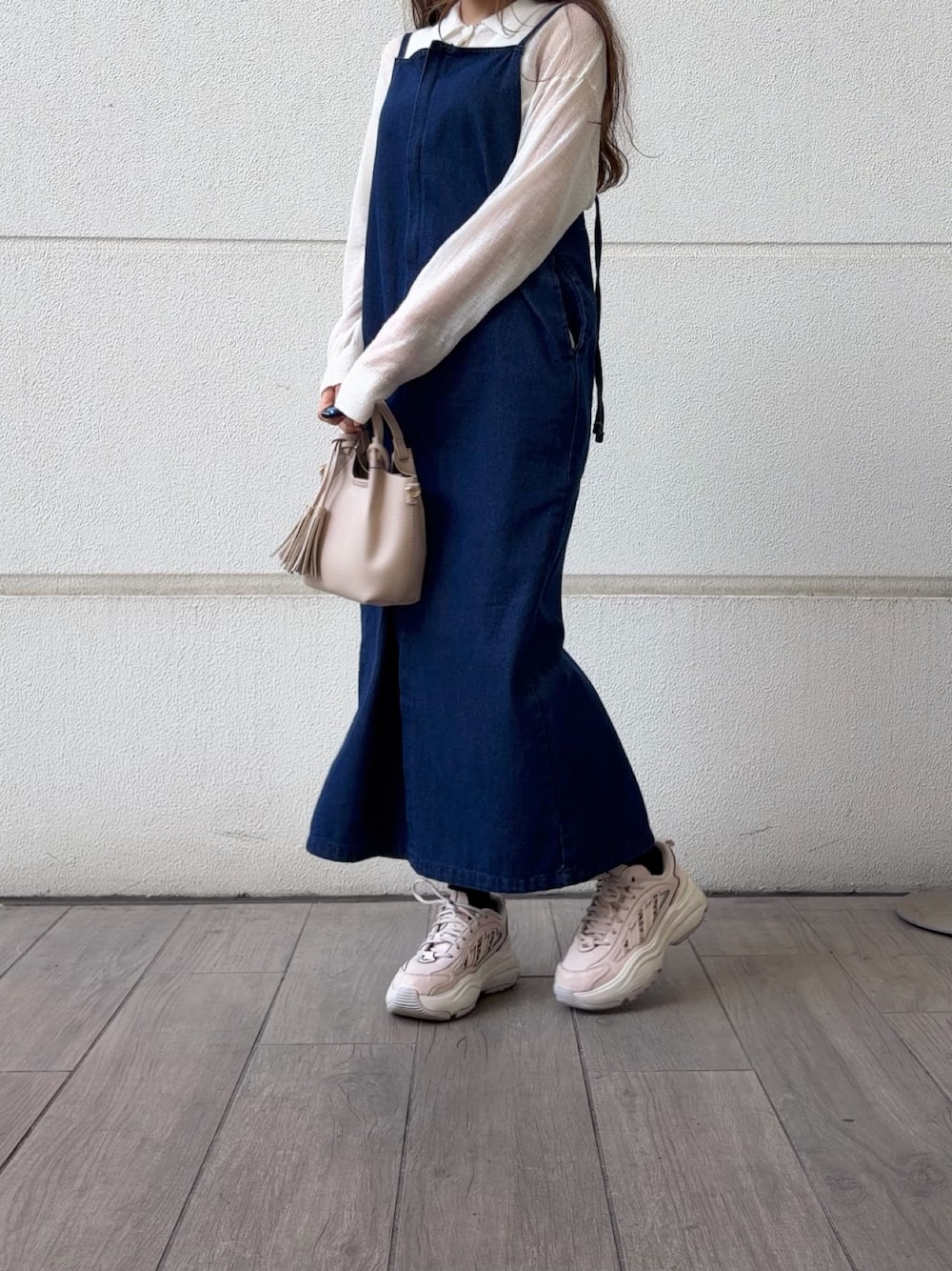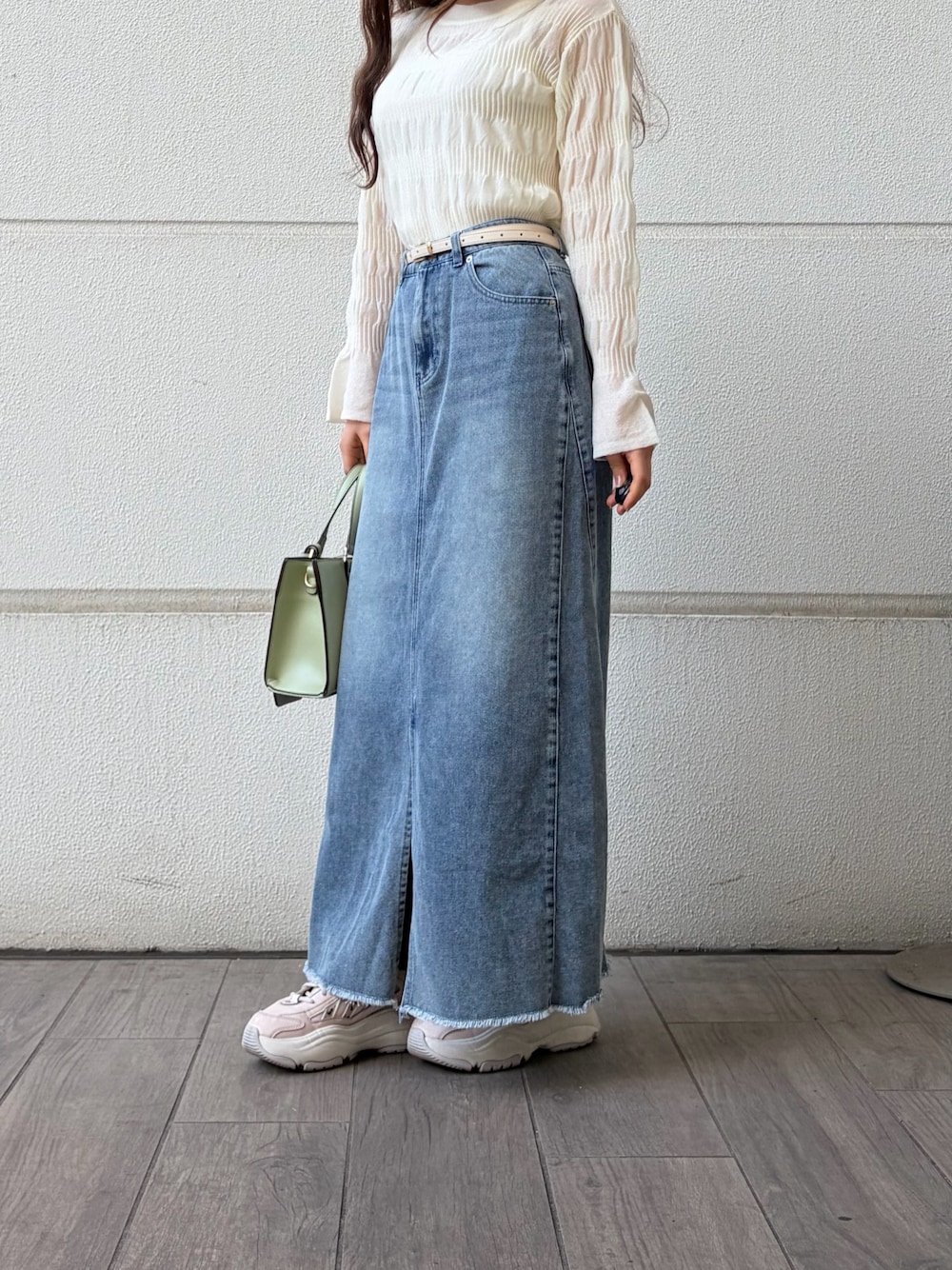アウターとバッグはホワイトでまとめ、軽やかに🤍