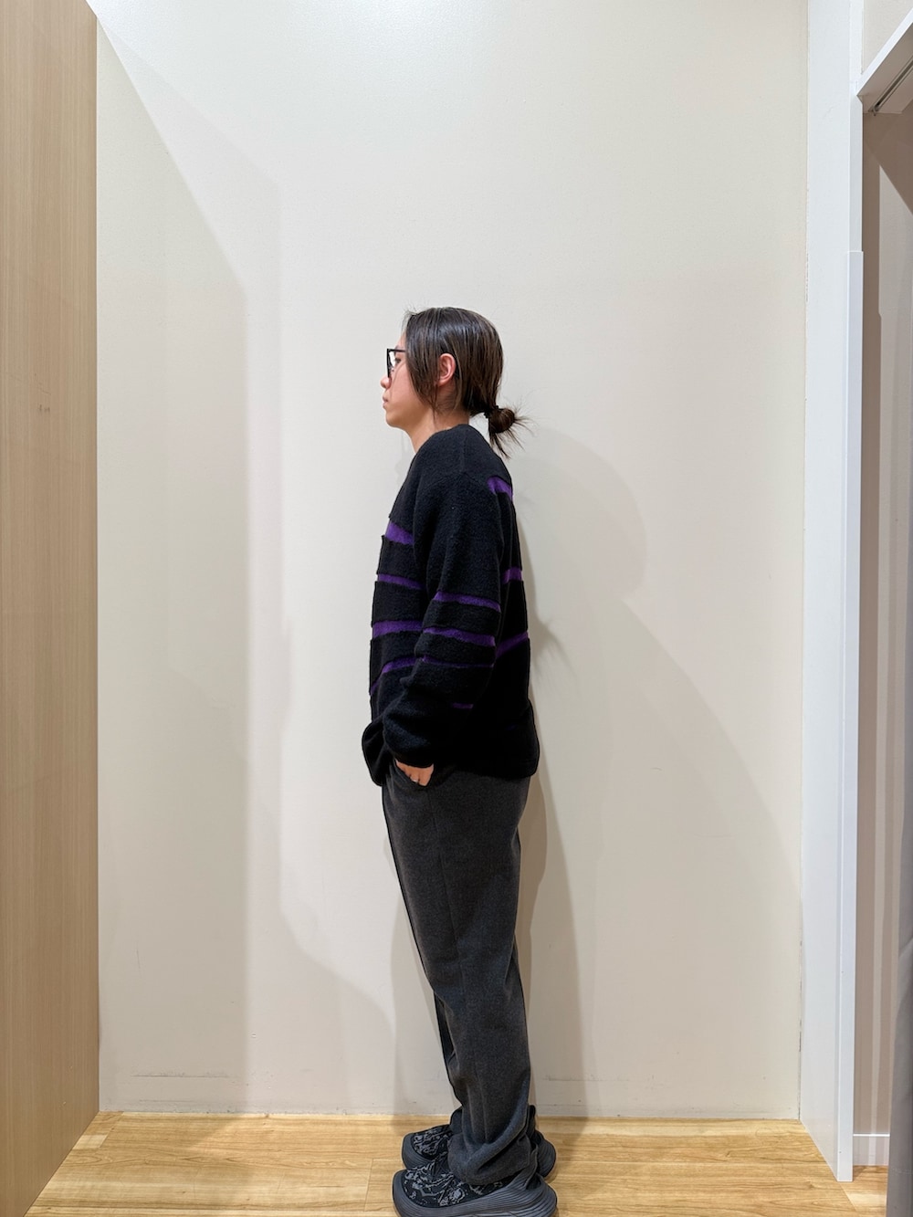 今回はランダムなボーダーが目を引く主役ニット。