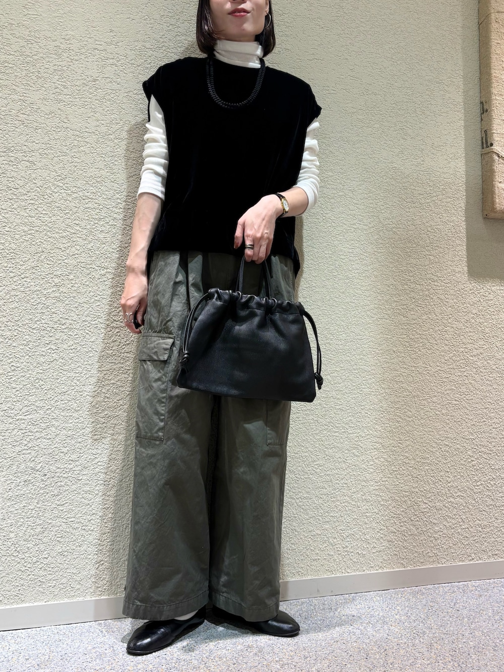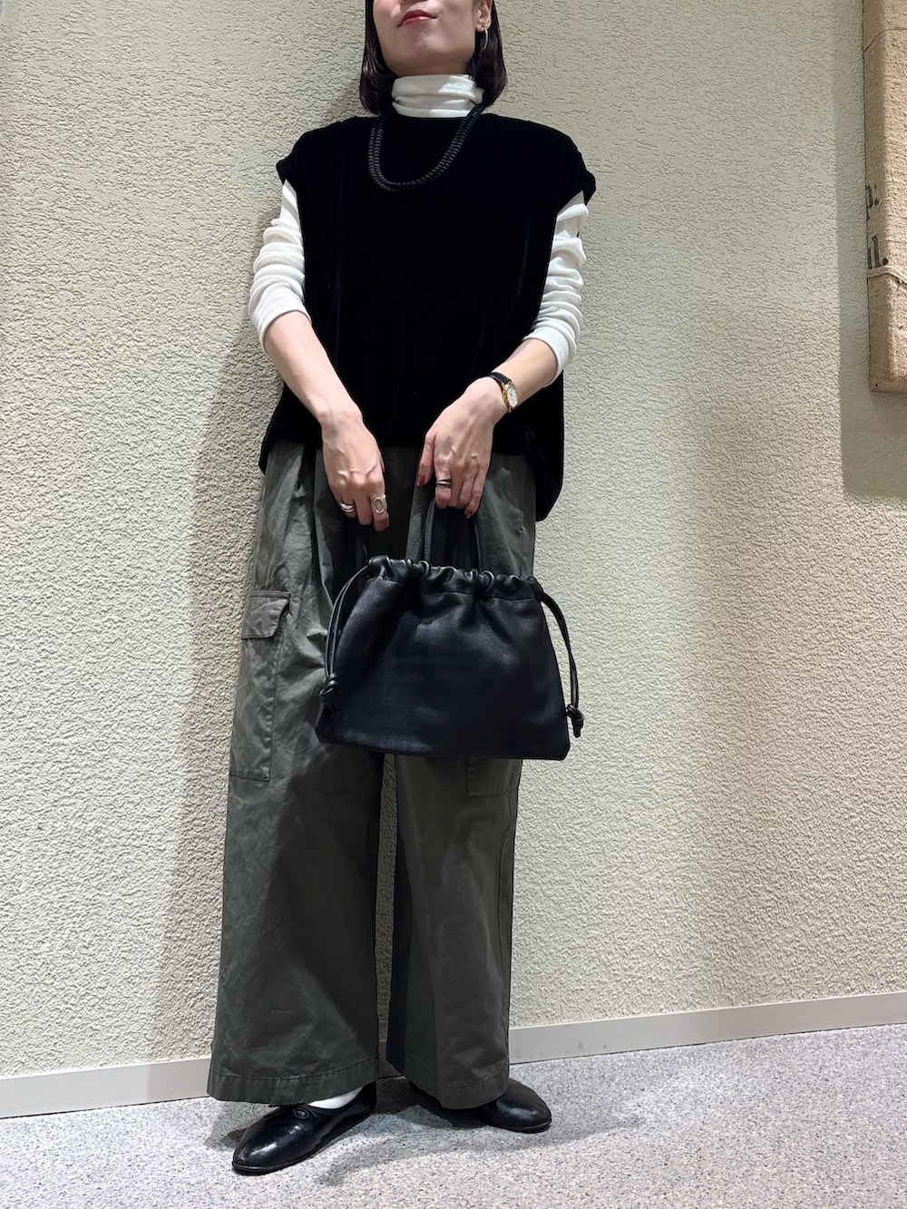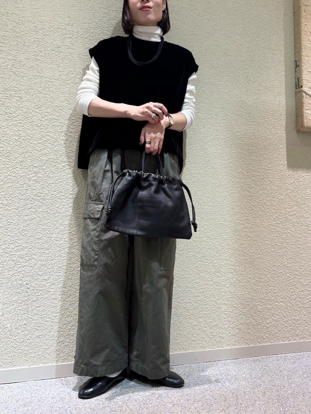 合わせたMORMYRUSの巾着バッグは私もリアルバイして愛用しております!シンプルでどんなお洋服とも相性が良く、見た目以上に物もしっかりと入るので、通勤時はほぼ毎日こちらを使用しています◎