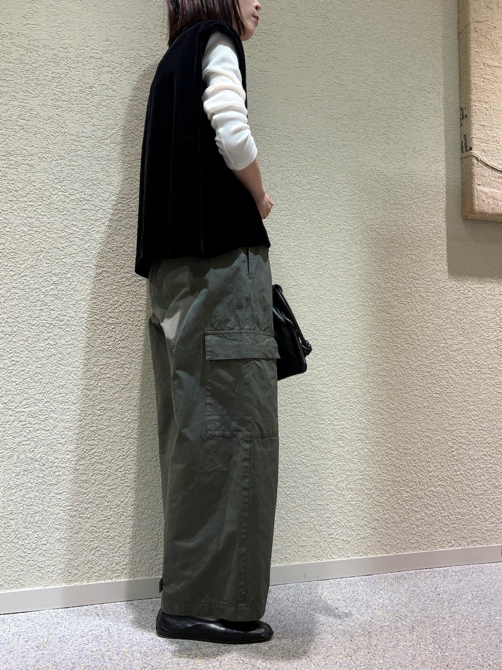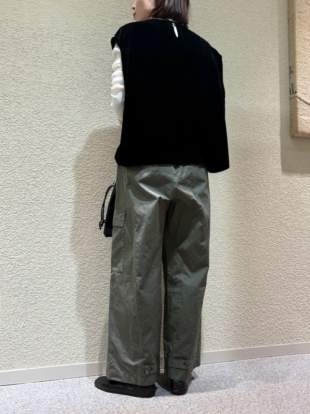 裾のボタン位置をかえるとテーパードシルエットに早変わりします。