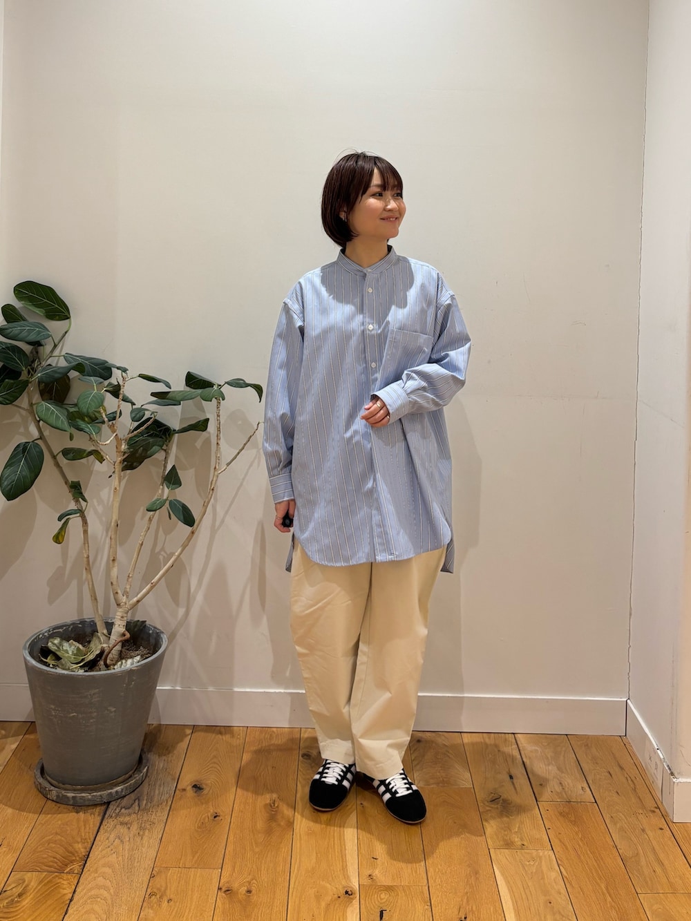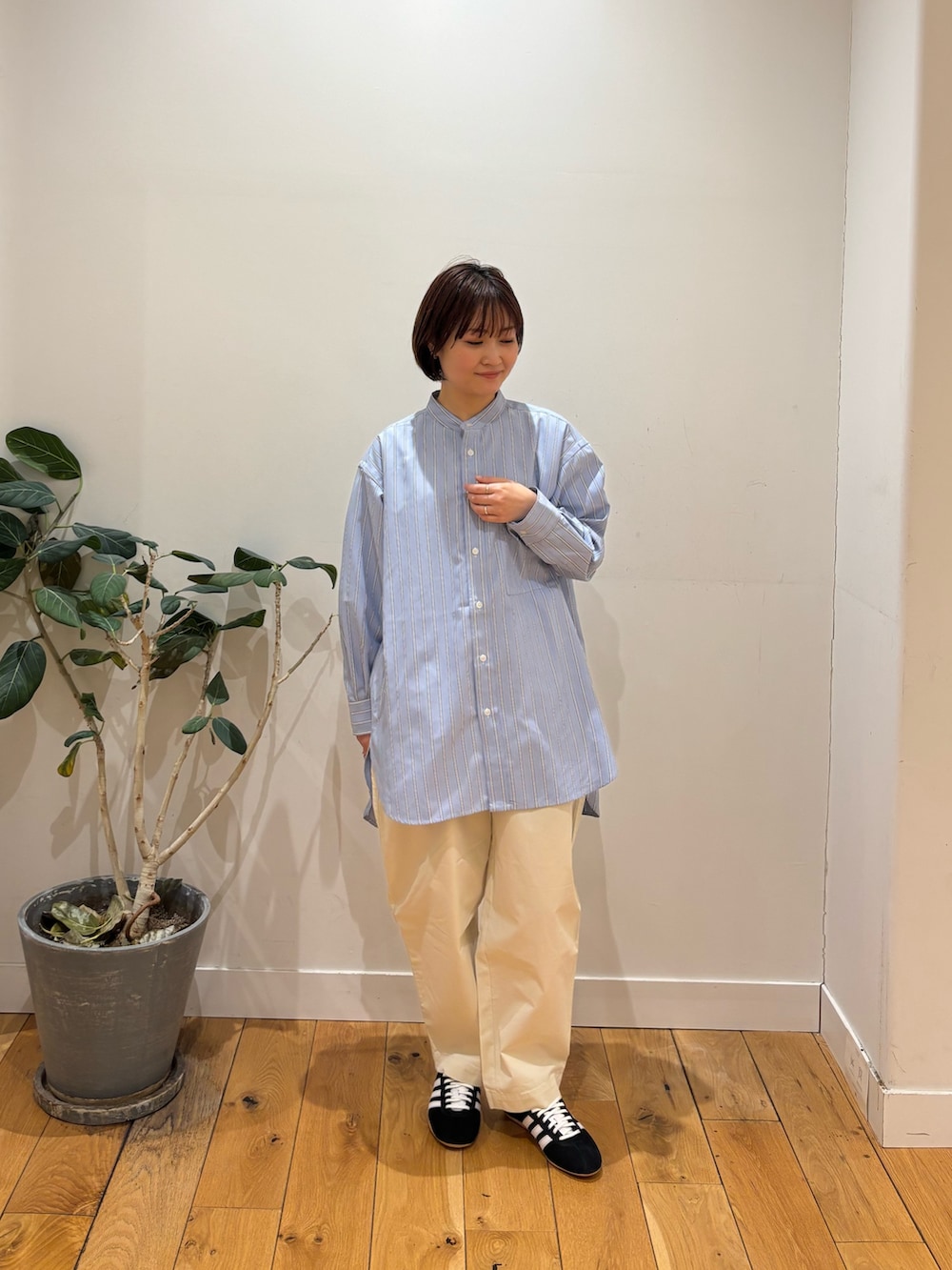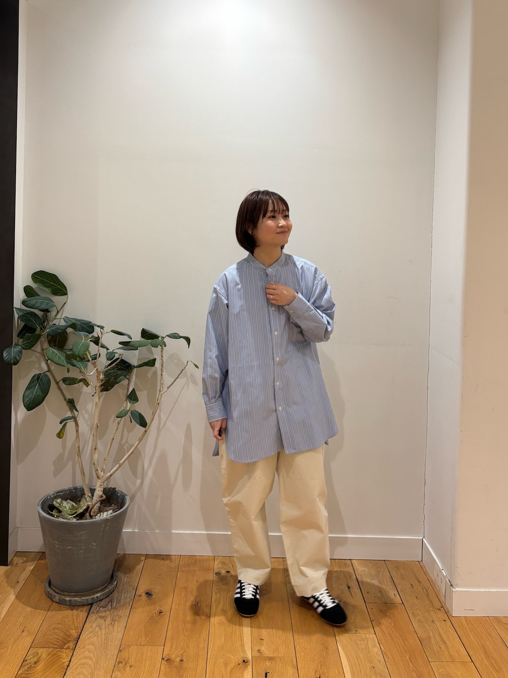 バンドカラーのシャツは158cmでお尻がしっかり隠れる長さです!