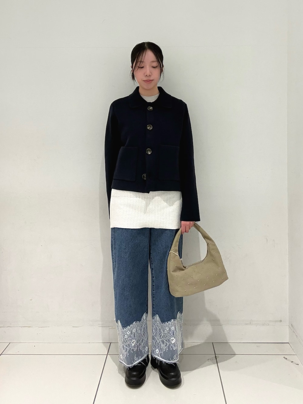 ネイビーのニットカーデを使ったお出かけコーデです❕