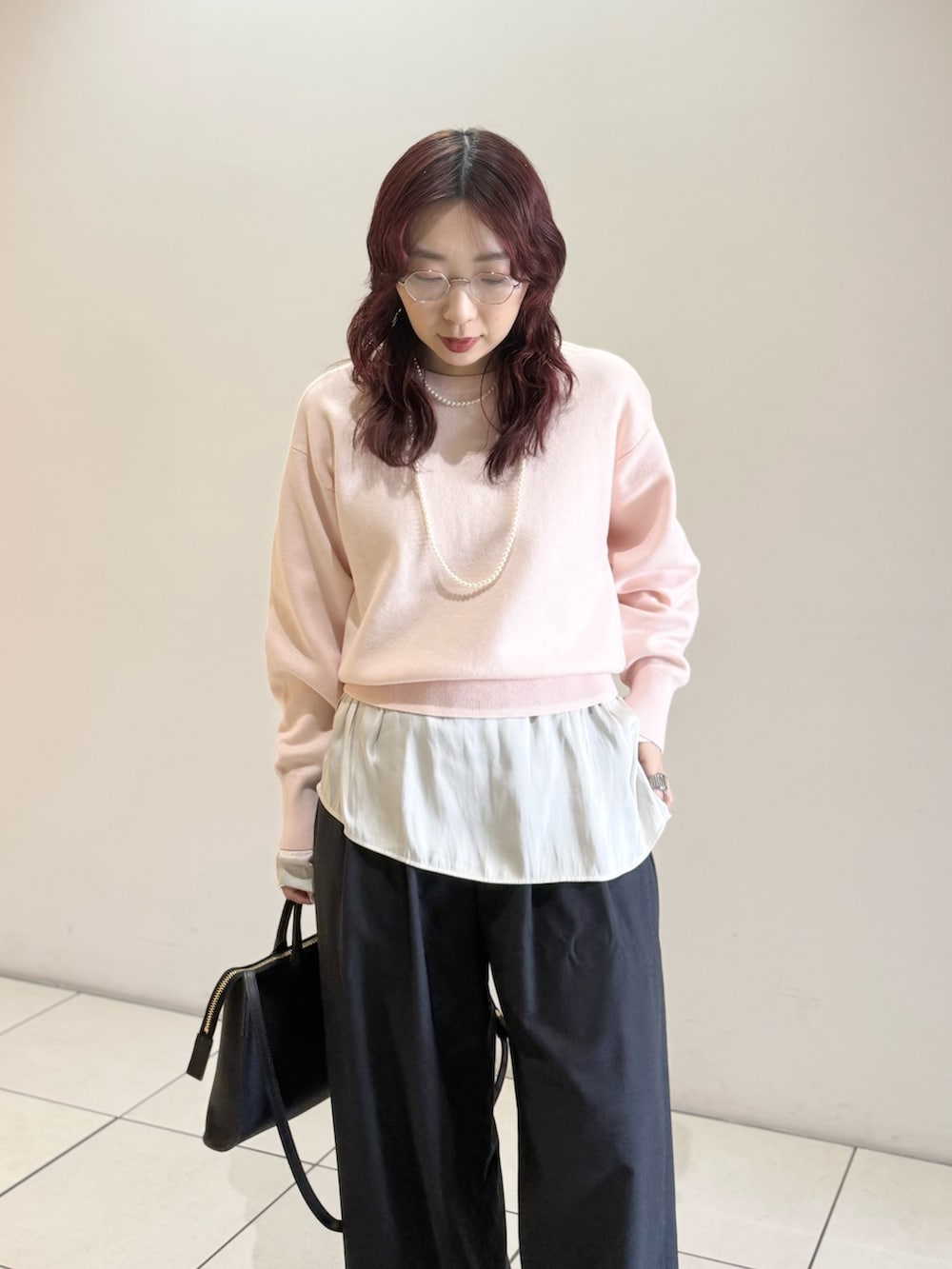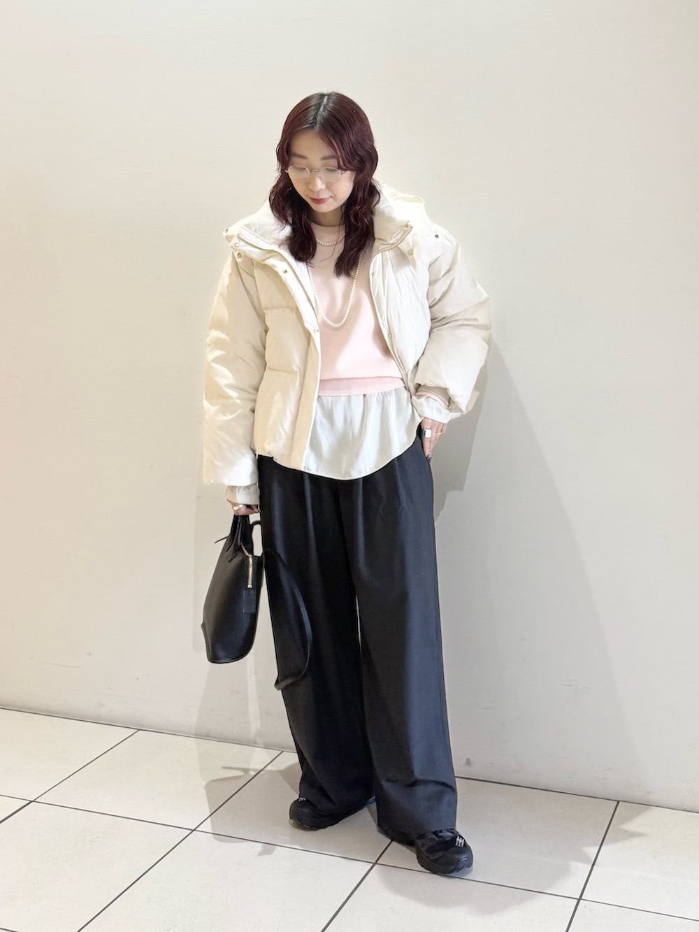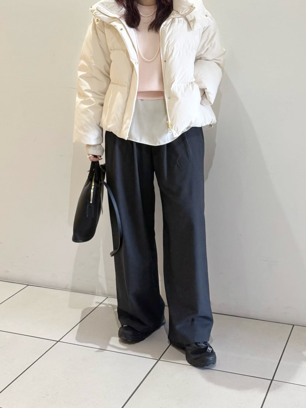 定番人気のウール混タックギャザーストレートパンツを合わせました。