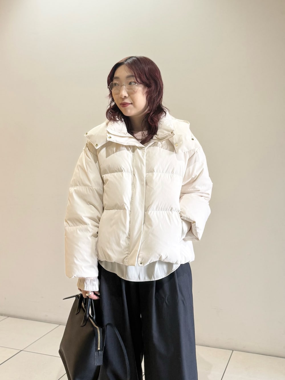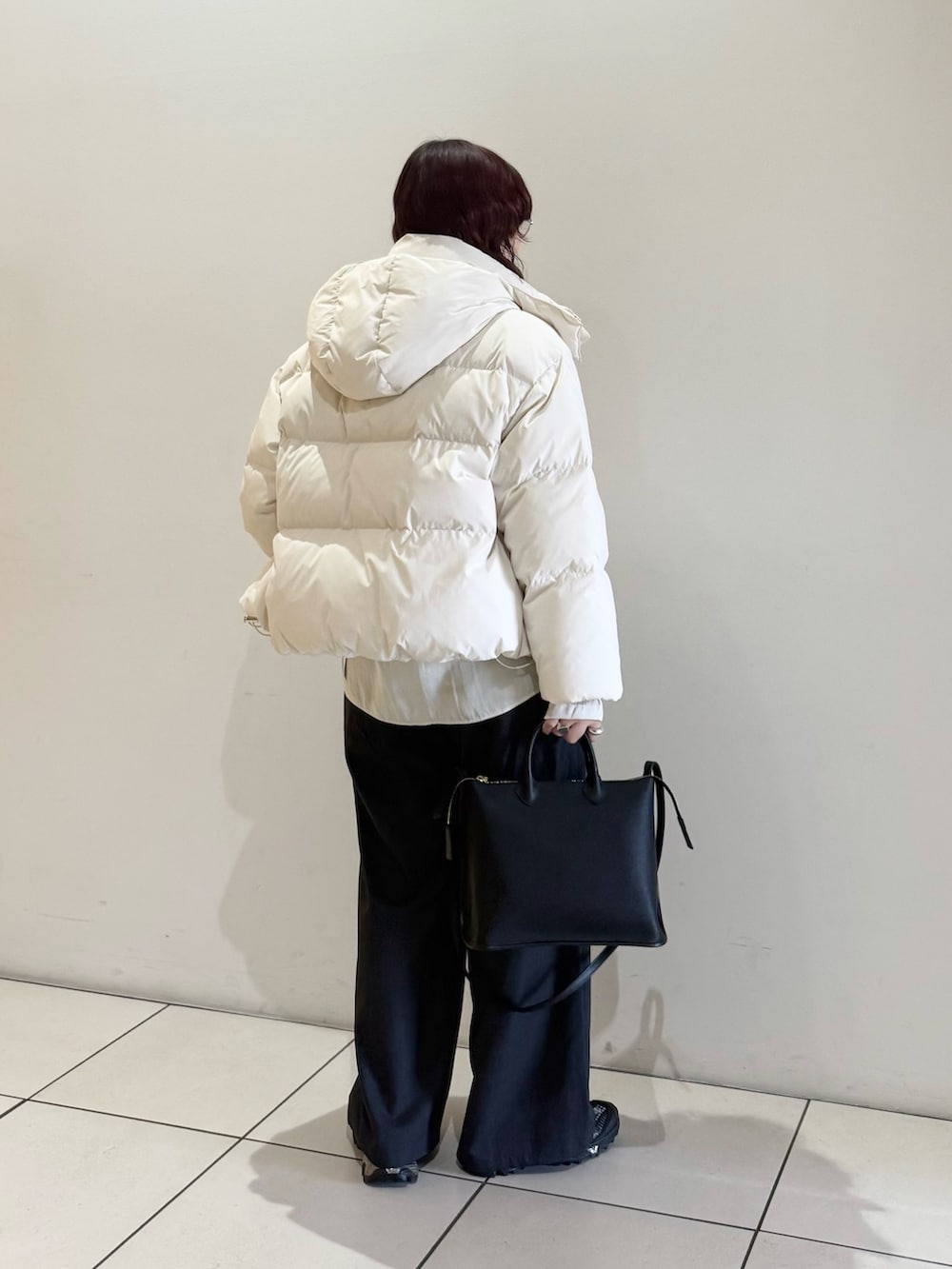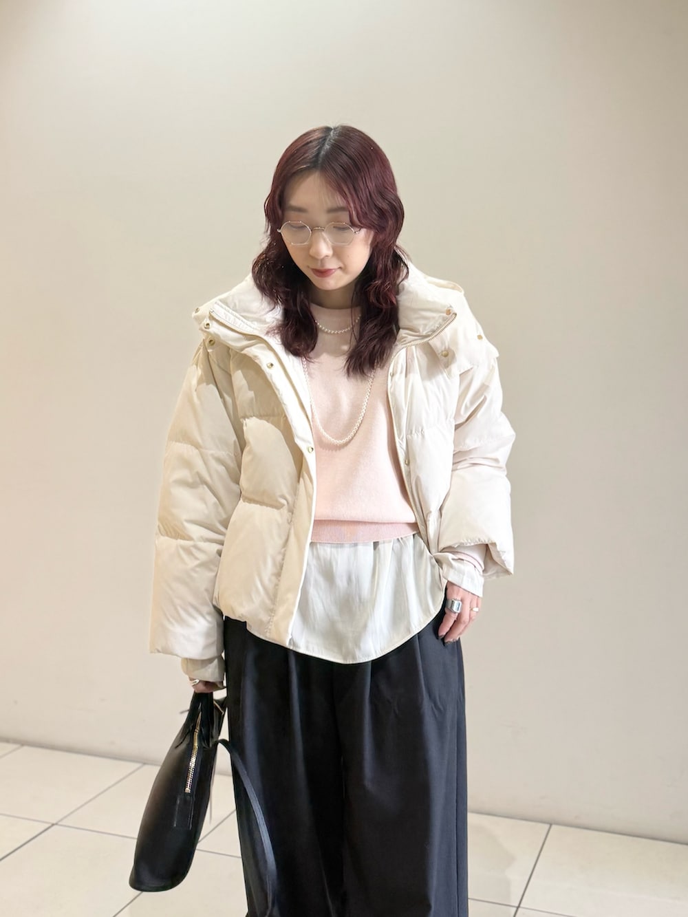 定番人気のウール混タックギャザーストレートパンツを合わせました。