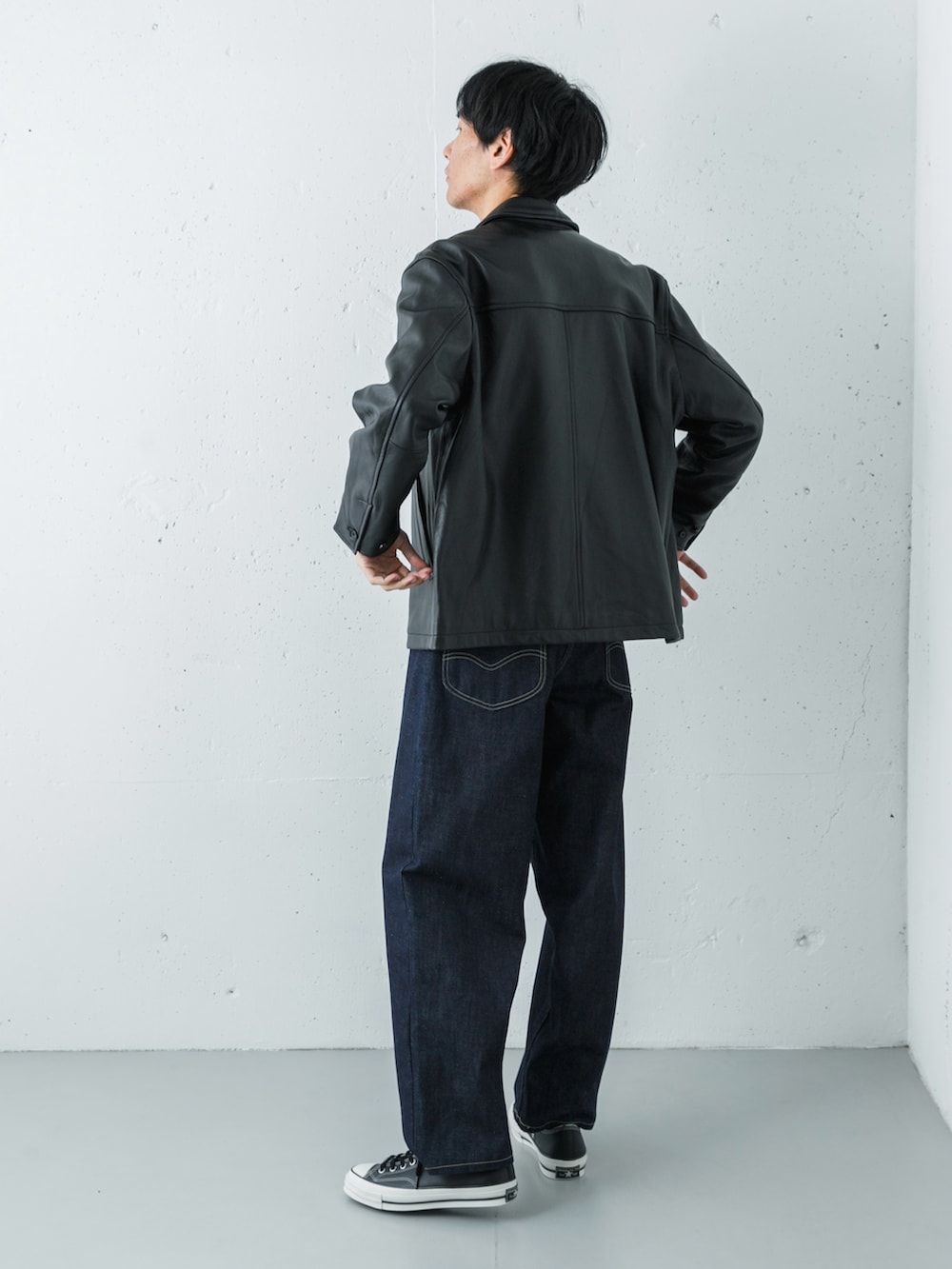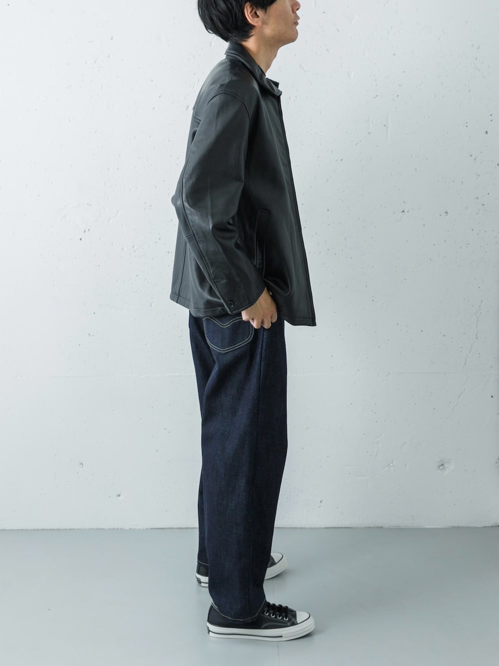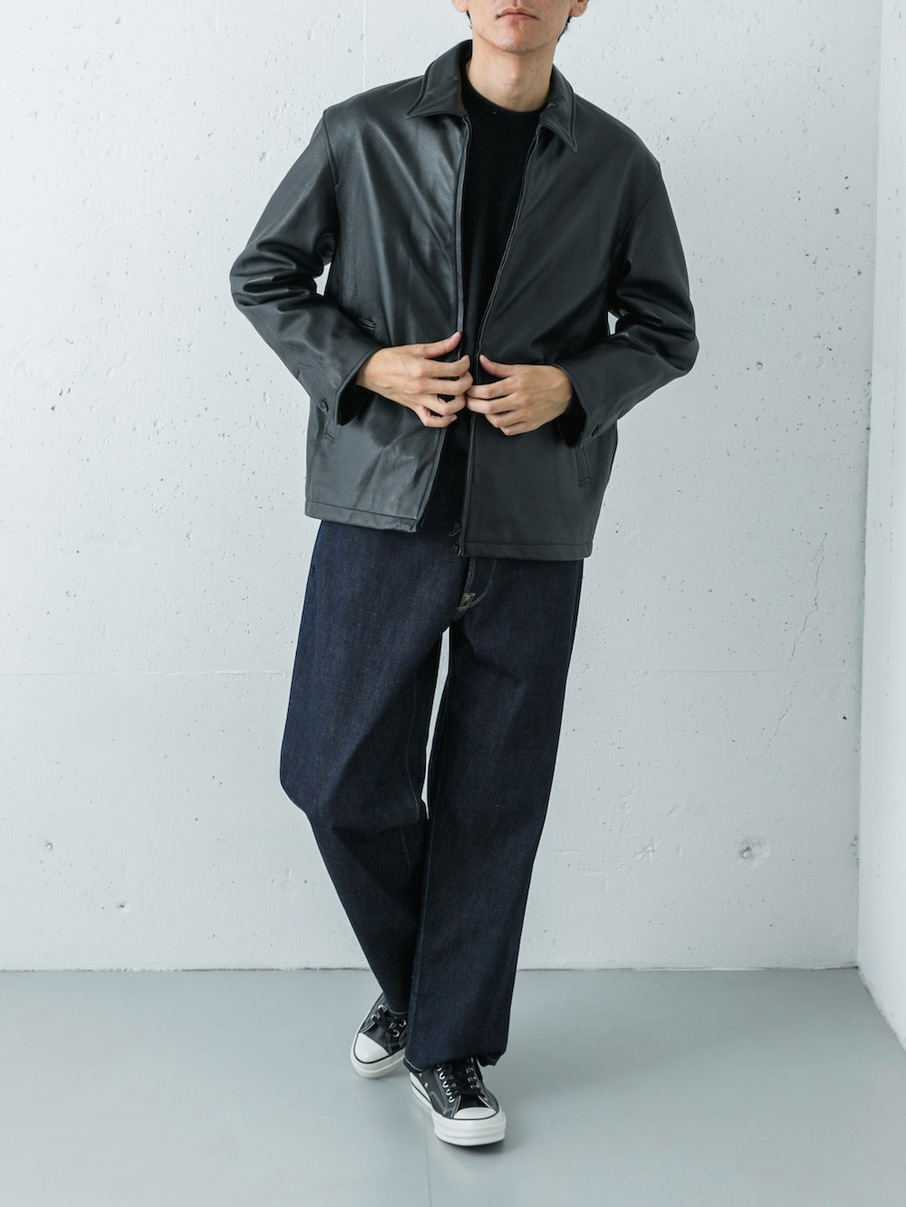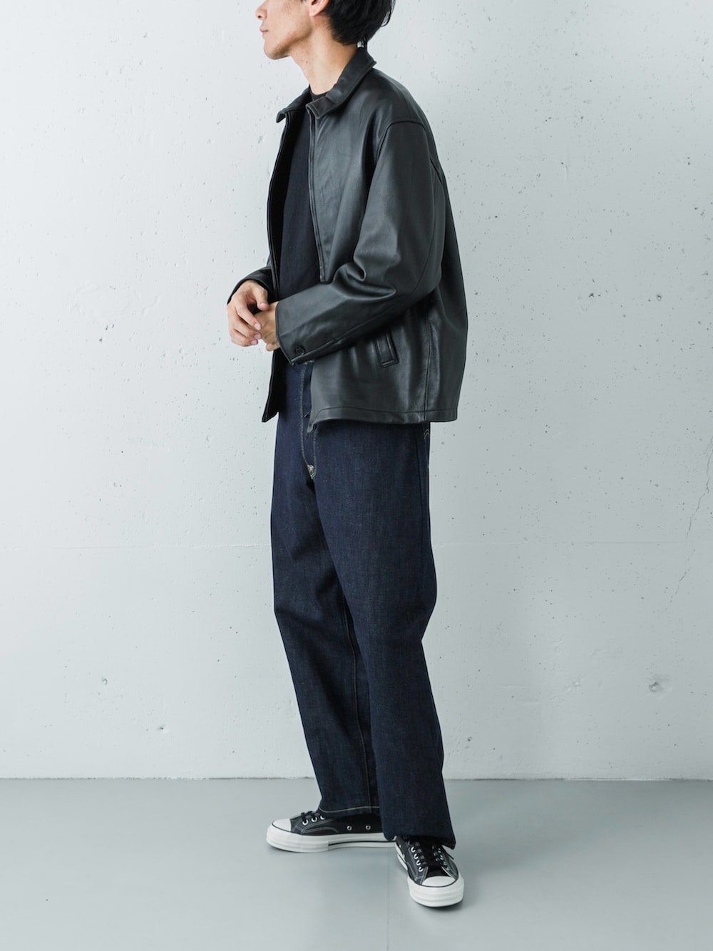 ボトムスには、このスタイリングの影の主役とも言えるLee101別注のCOWBOY PANTS (RIGID)を投入。ラムレザーの「柔」に対し、糊の効いた生デニムの「剛」という、質感のコントラストが圧倒的な奥行きを生んでいます。リジット特有の深い濃紺が、ブラックレザーと響き合い、ストイックなカラーバランスを構築しています。