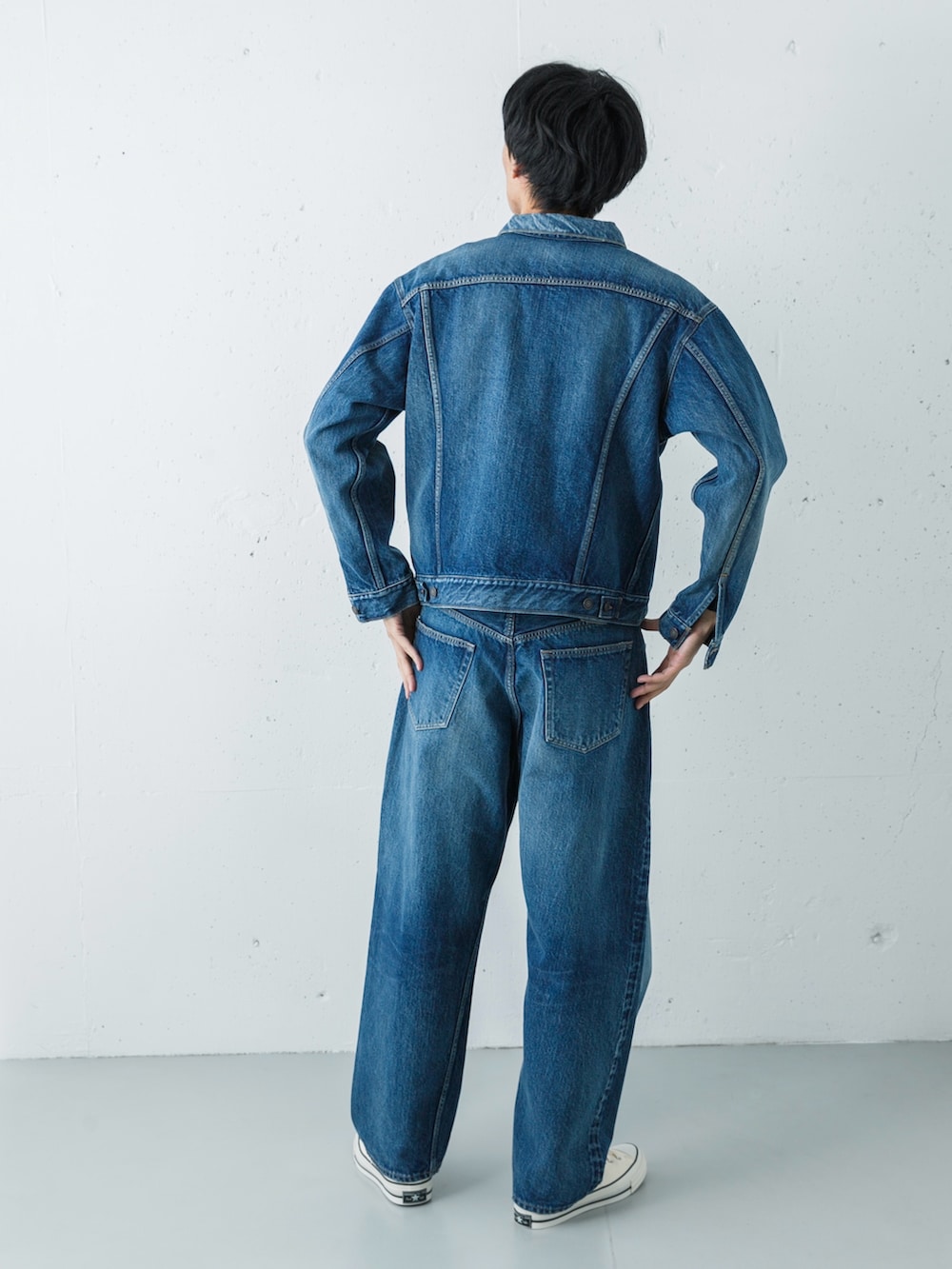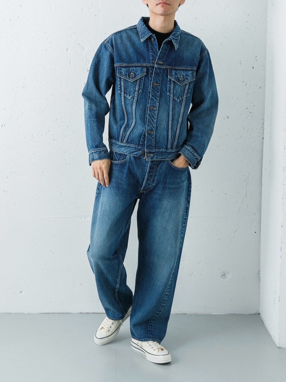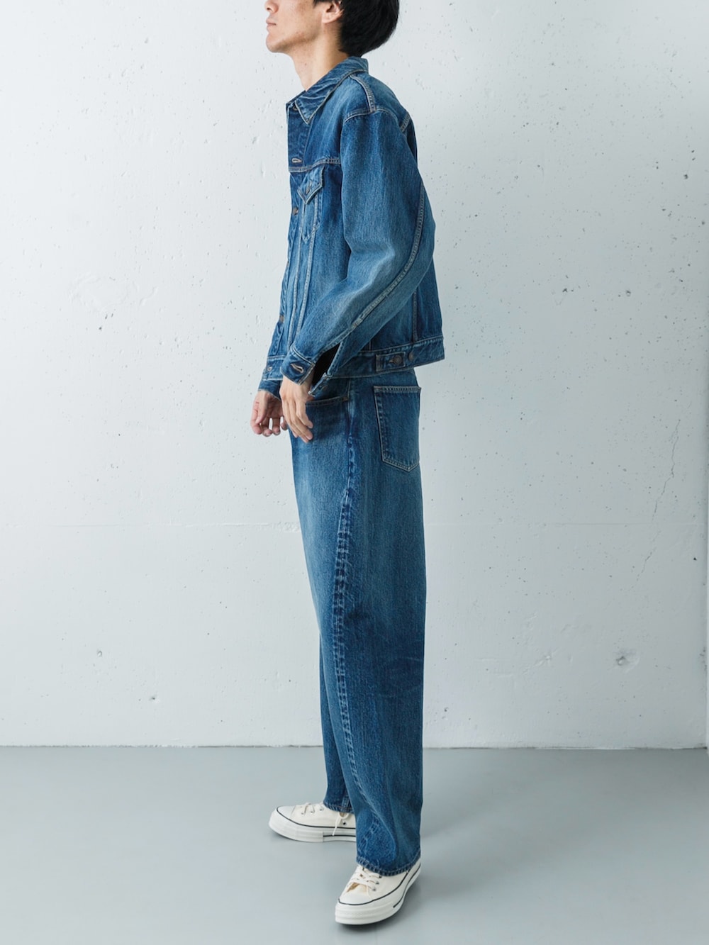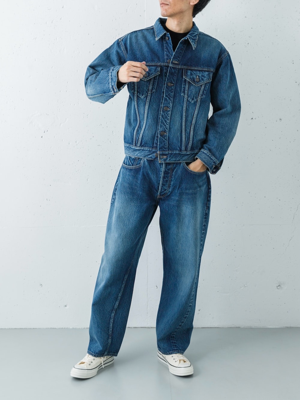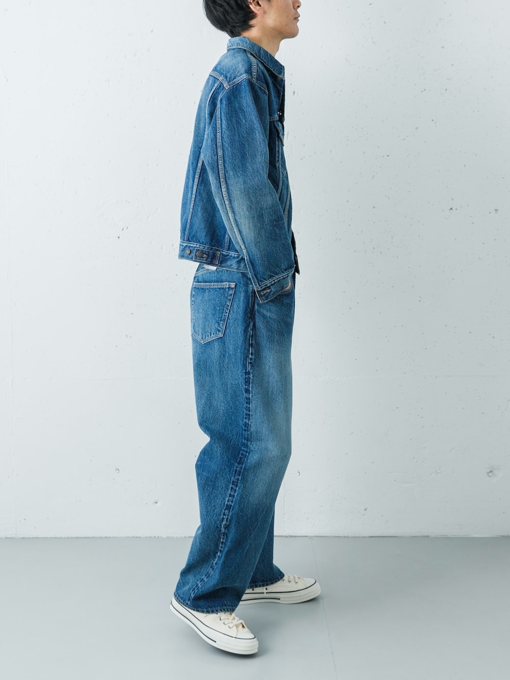 ボトムスにバギー(BAGGY)シルエットをセレクトしているのがポイントです。ジャケットのコンパクトな着丈に対し、パンツのボリューム感が強調され、非常に今っぽい「Aライン」のシルエットを構築しています。加工による奥行きのあるブルーが、セットアップ特有の「決まりすぎた感」を和らげ、リラックスしたムードを演出。