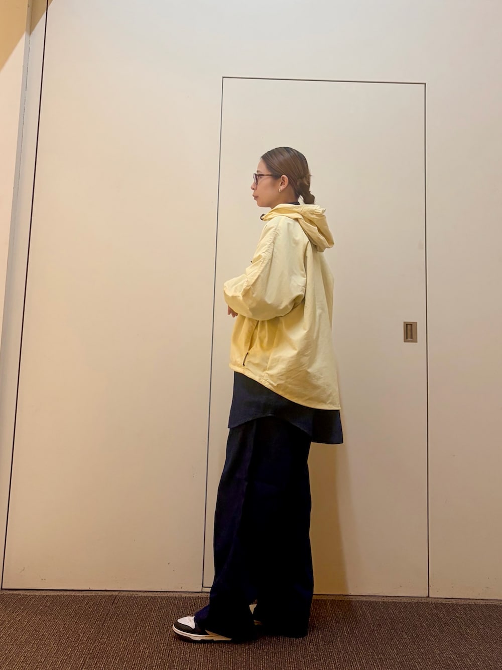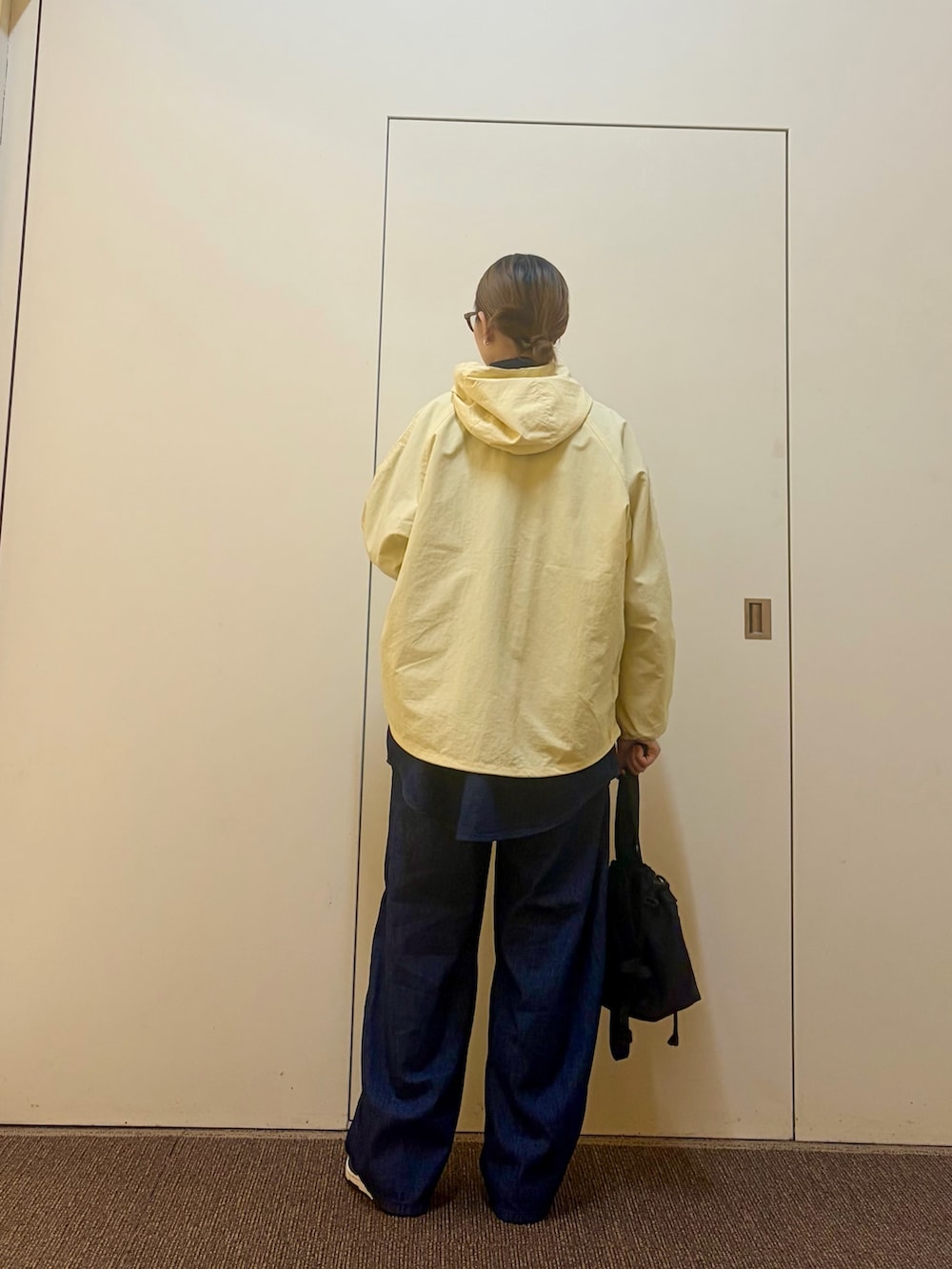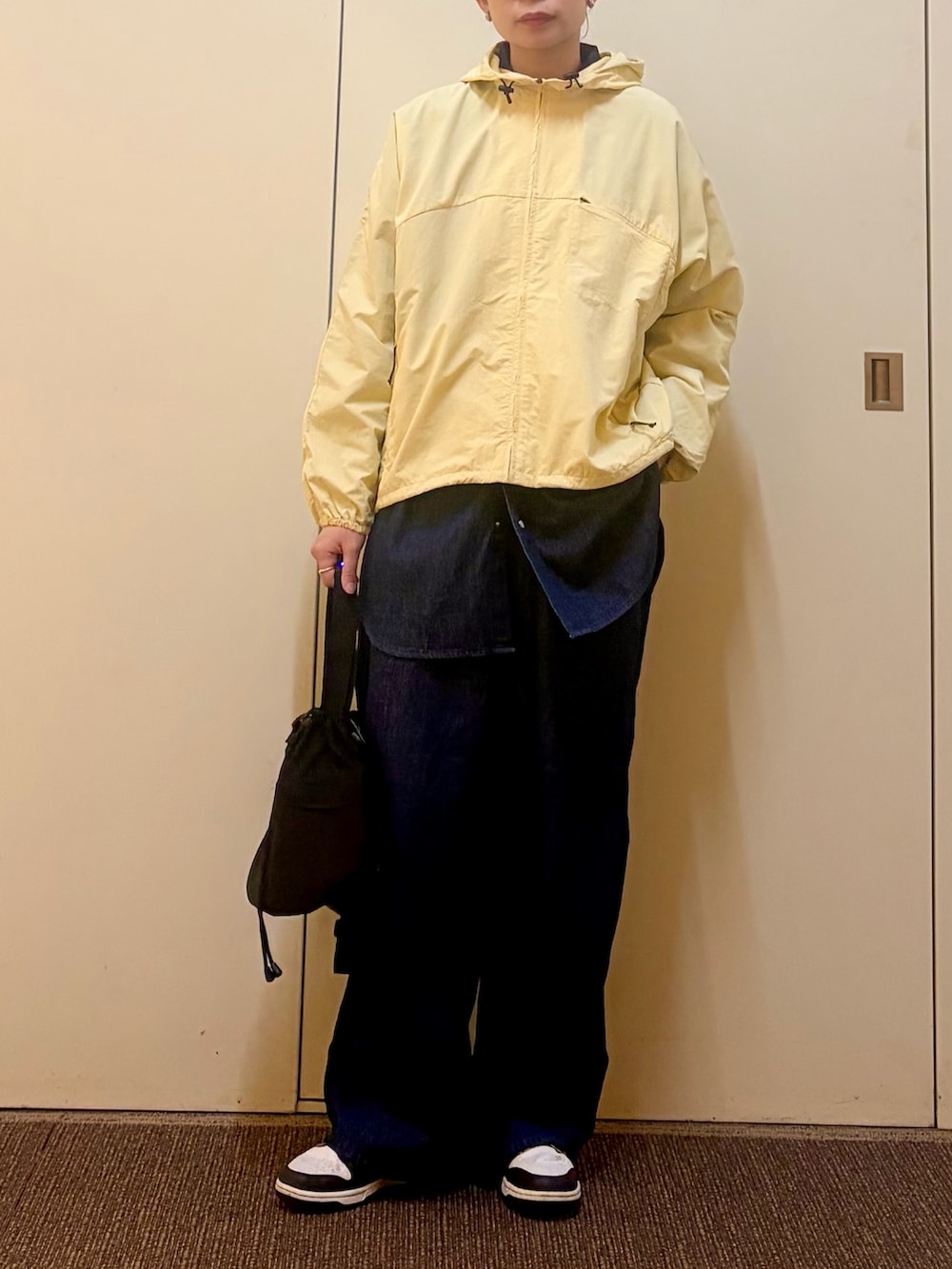 イエローのパーカーを合わせて