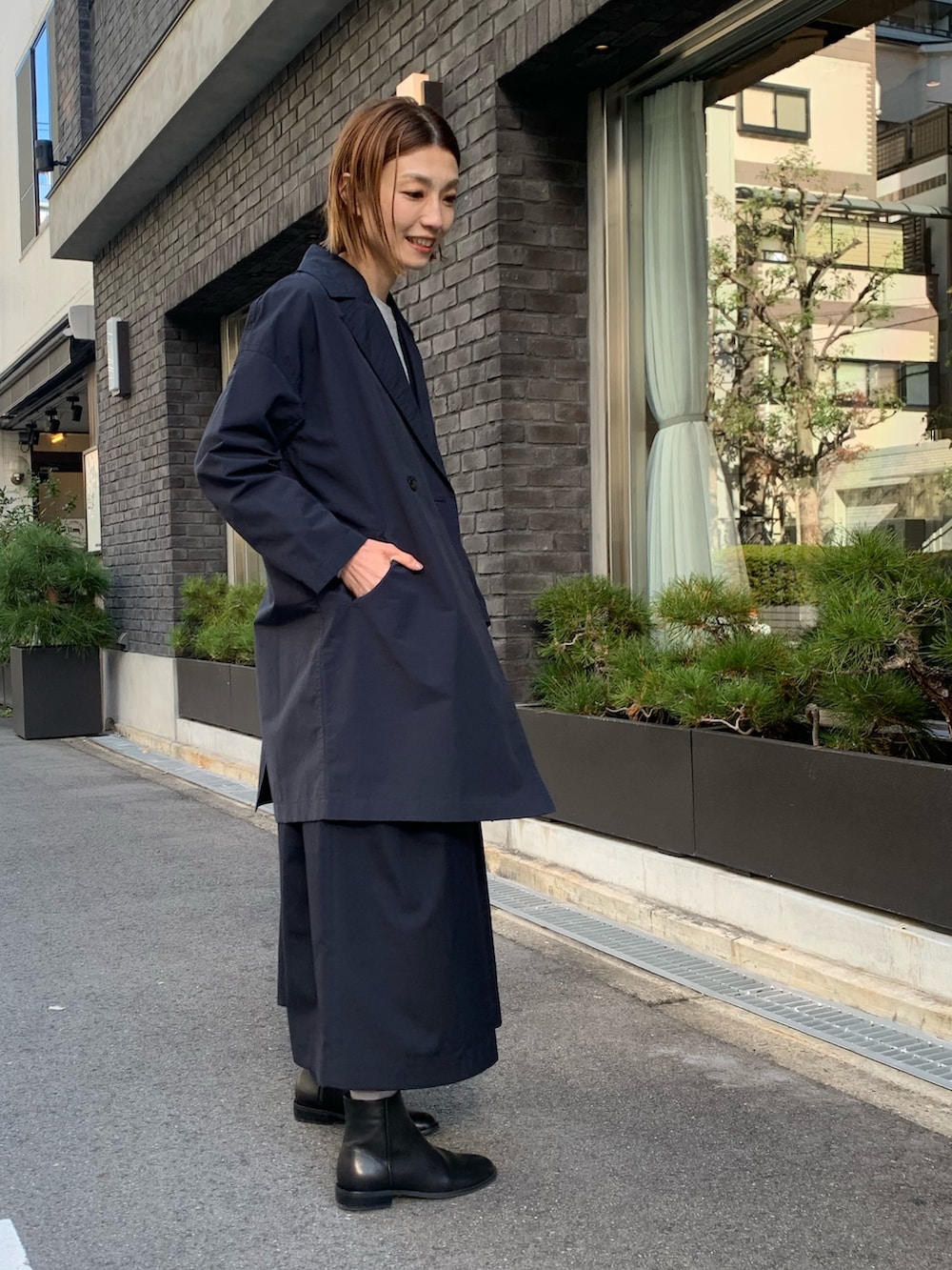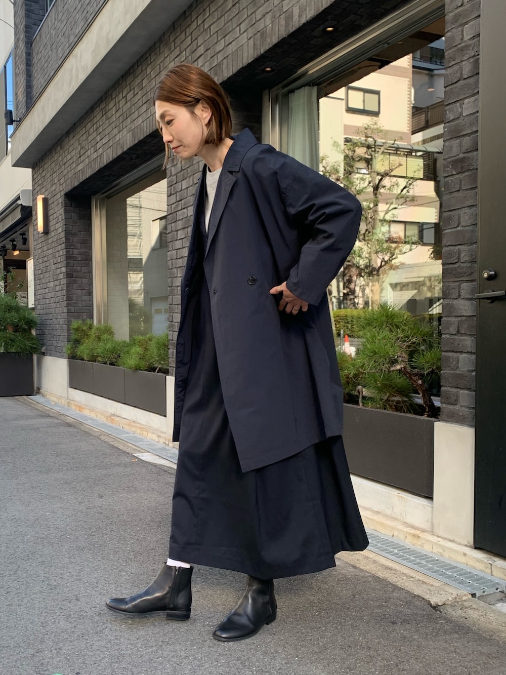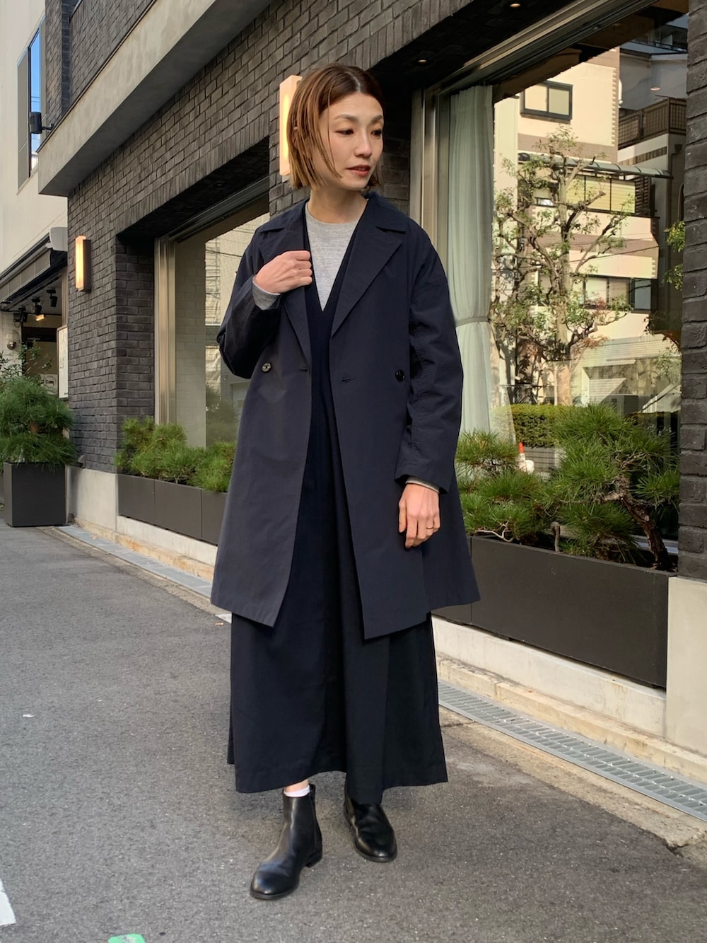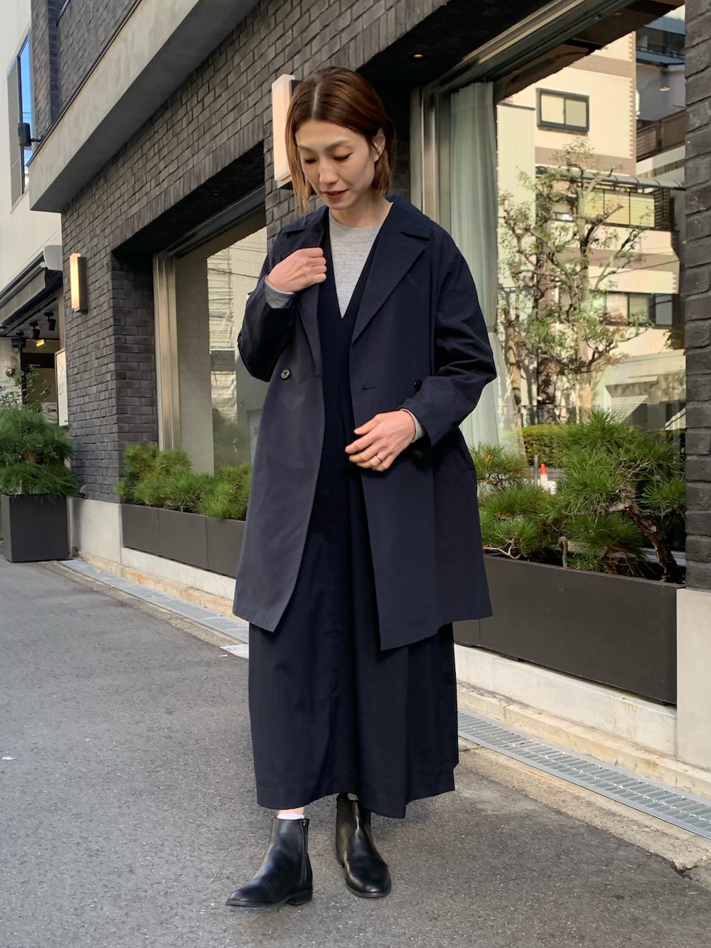 ミドル丈のアウターは、ジャンパースカートにも合わせられる優れもの。