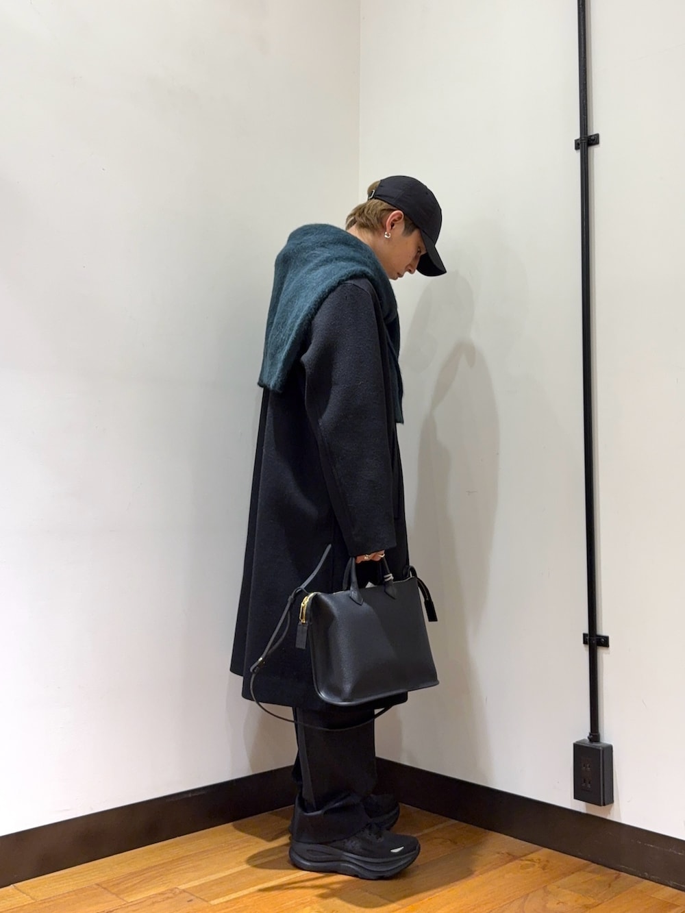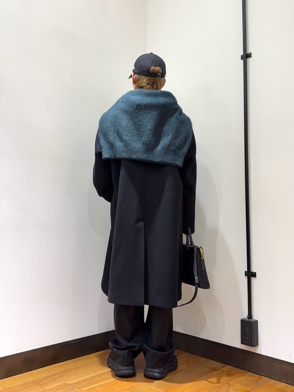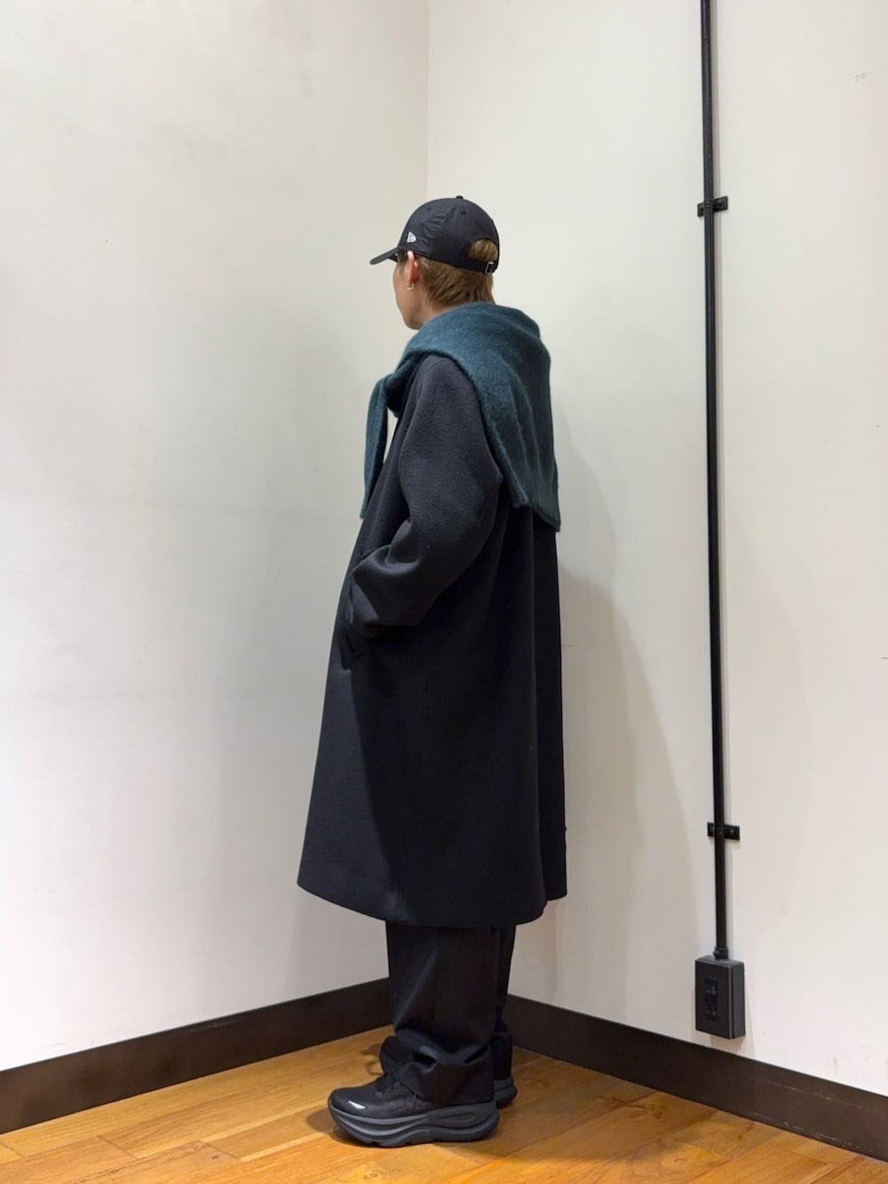 フォックスカシミヤのニットを肩にかけてロンドンスタイルにしてみました。素材感の違いと、ダークグリーンが渋みを出してくれます。黒のキレイめでまとめていますが、キャップとボリュームのあるスニーカーでガツンと外しを入れています。