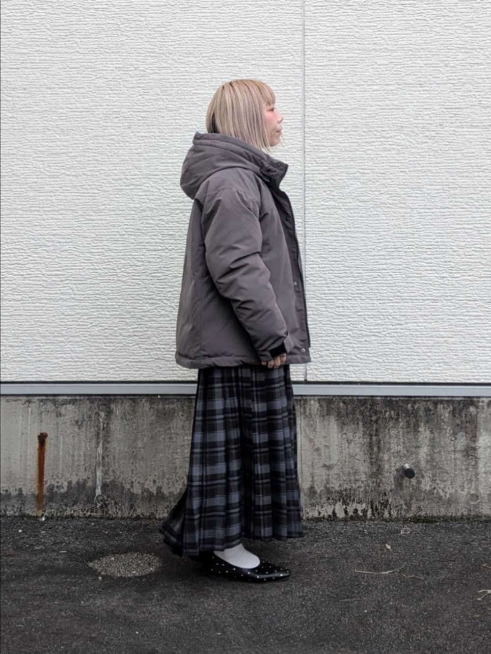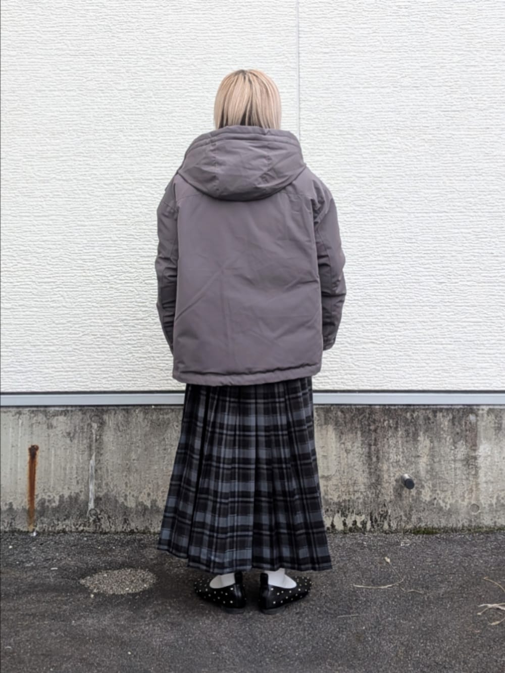 ガーリーなスタイリングにフードダウンを合わせて可愛くなりすぎないコーディネートにしてみました。