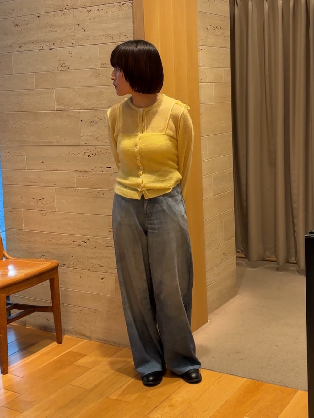 シアーモヘヤカーディガンは透け感がめちゃくちゃ可愛いです。ボタンを閉じて1枚でトップスにしても良いし、開けてカーディガンでも使えるので助かります〜