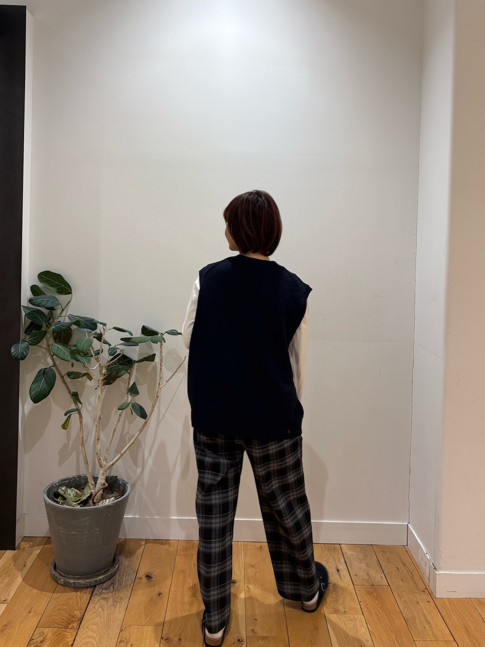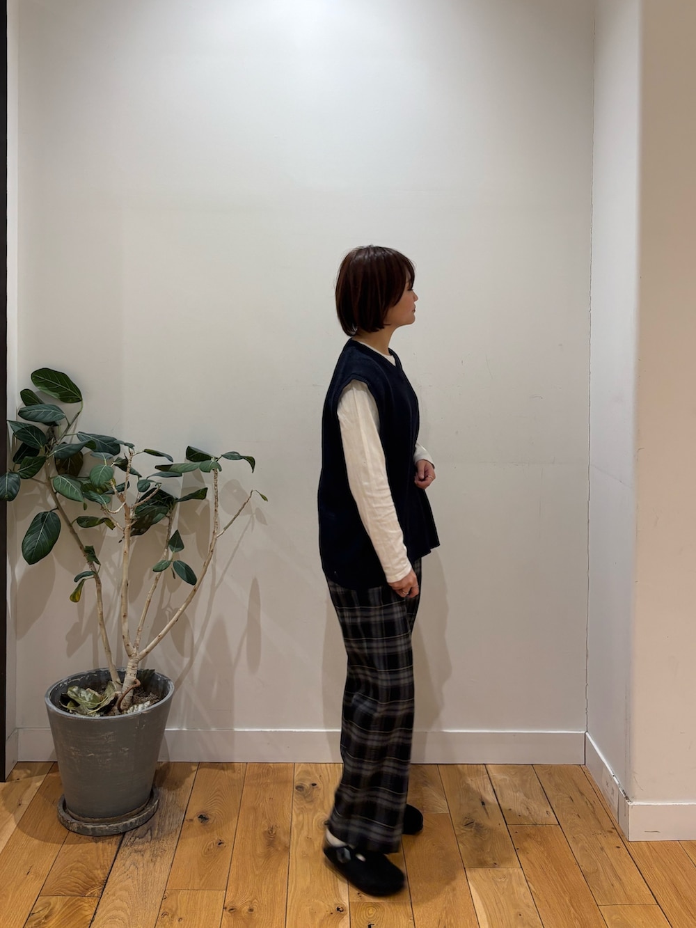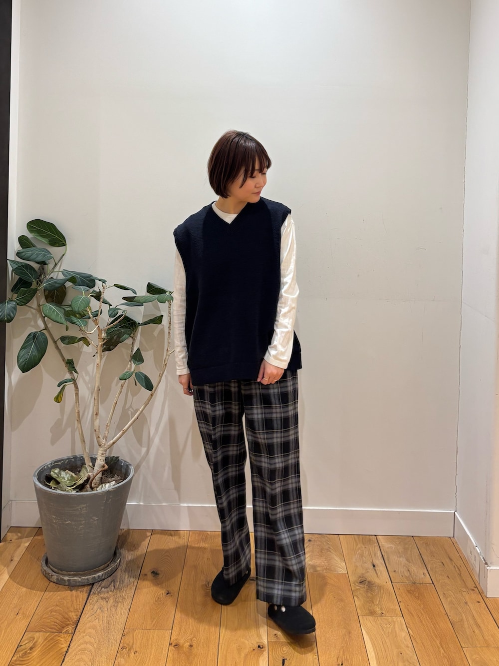 冬アイテムに飽きてきた方、今から着れるベストがおすすめですよ!深すぎないVネックや腰回りが隠れる丈感がカジュアルな印象になりますね◎