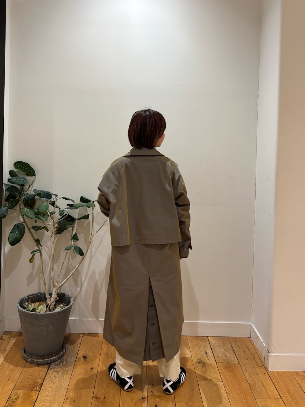 春アウターのステンカラーコートはカーキのお色ですが光り方が虹のような発色になっています!前からみても後ろから見てもデザインが可愛いのでコーディネートの主役になりますよ!