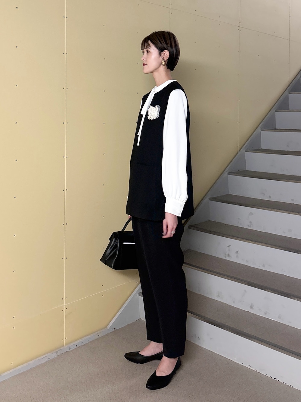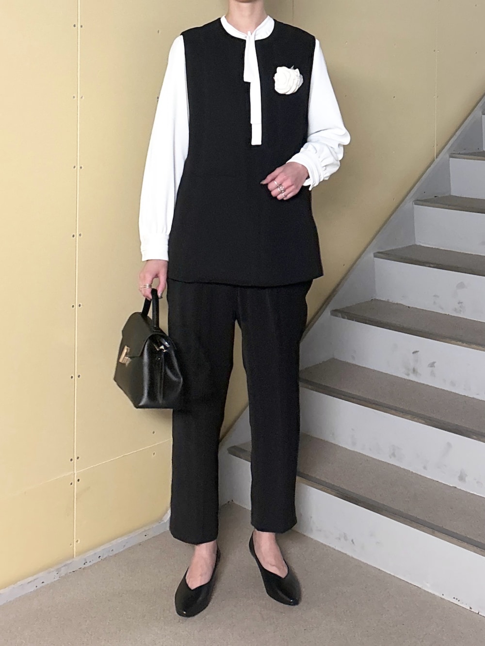 ブラウスとコサージュを白で、そのほかのアイテムを黒でまとめると統一感が出て引き締まります✨