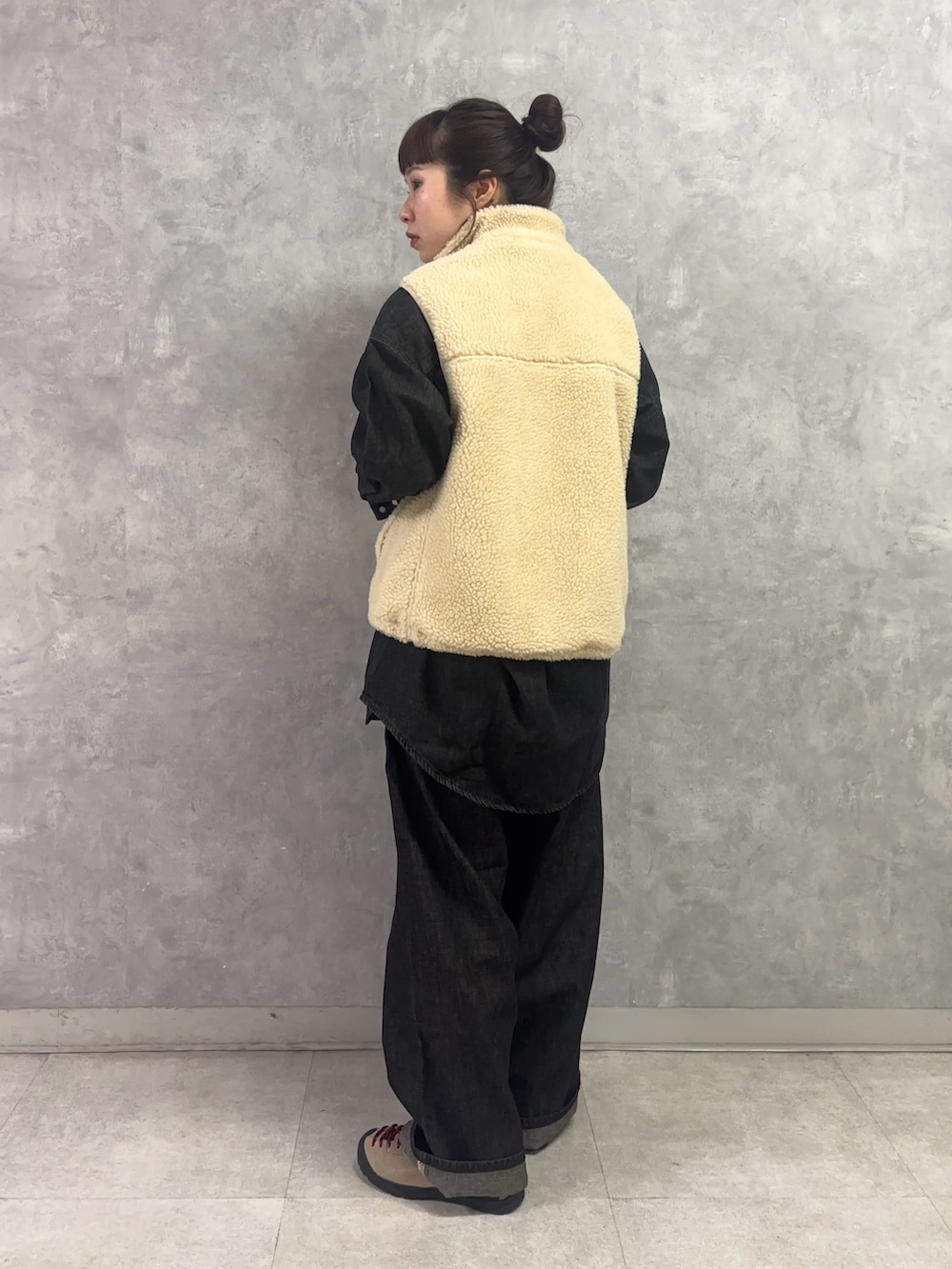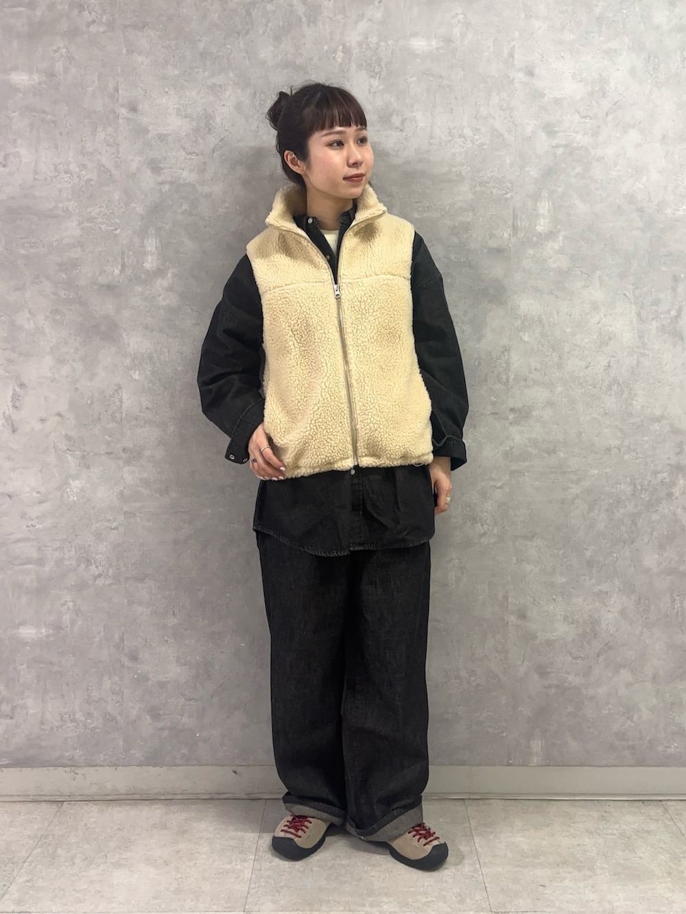 まだまだ寒いのでボアベストを重ねて。