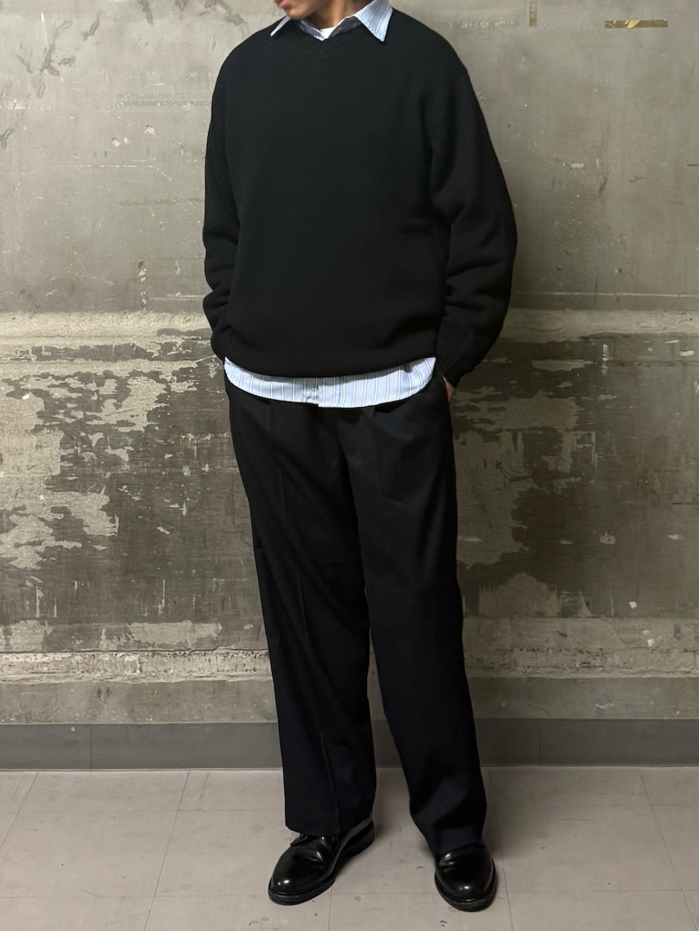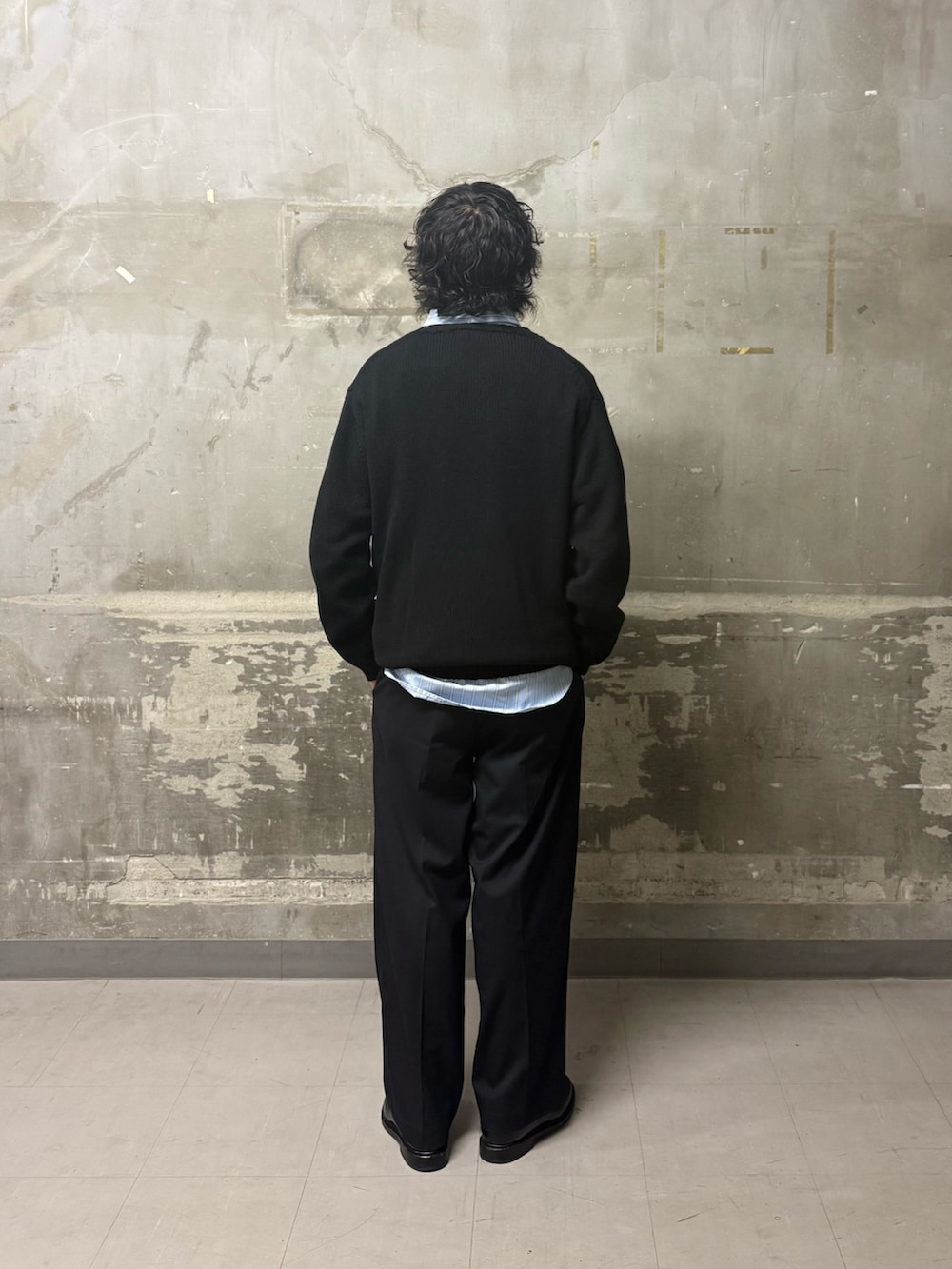 いつもご覧いただきありがとうございます!ジャストサイズではなく、肩の落ちたオーバーサイズのニットと、センタープレスの入ったワイドスラックスの組み合わせにしてみました!