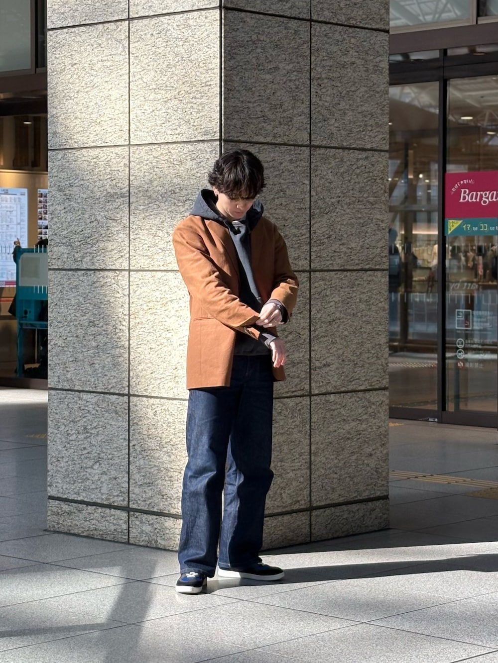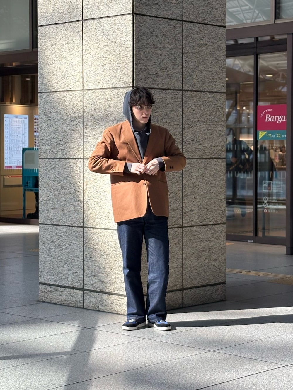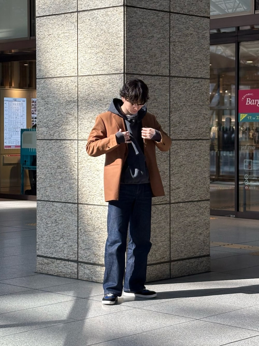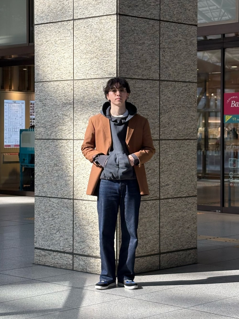 パンツもストレートのデニム、スニーカーもスケートシューズを合わせ、ストリートのコーデではありますが、semohのジャケットが効いてますね〜。