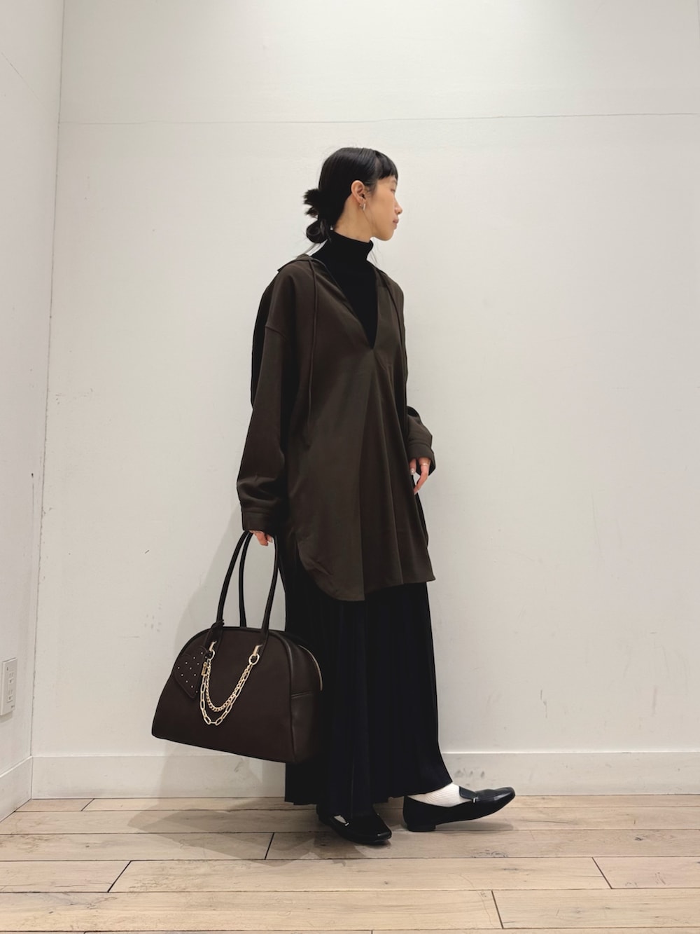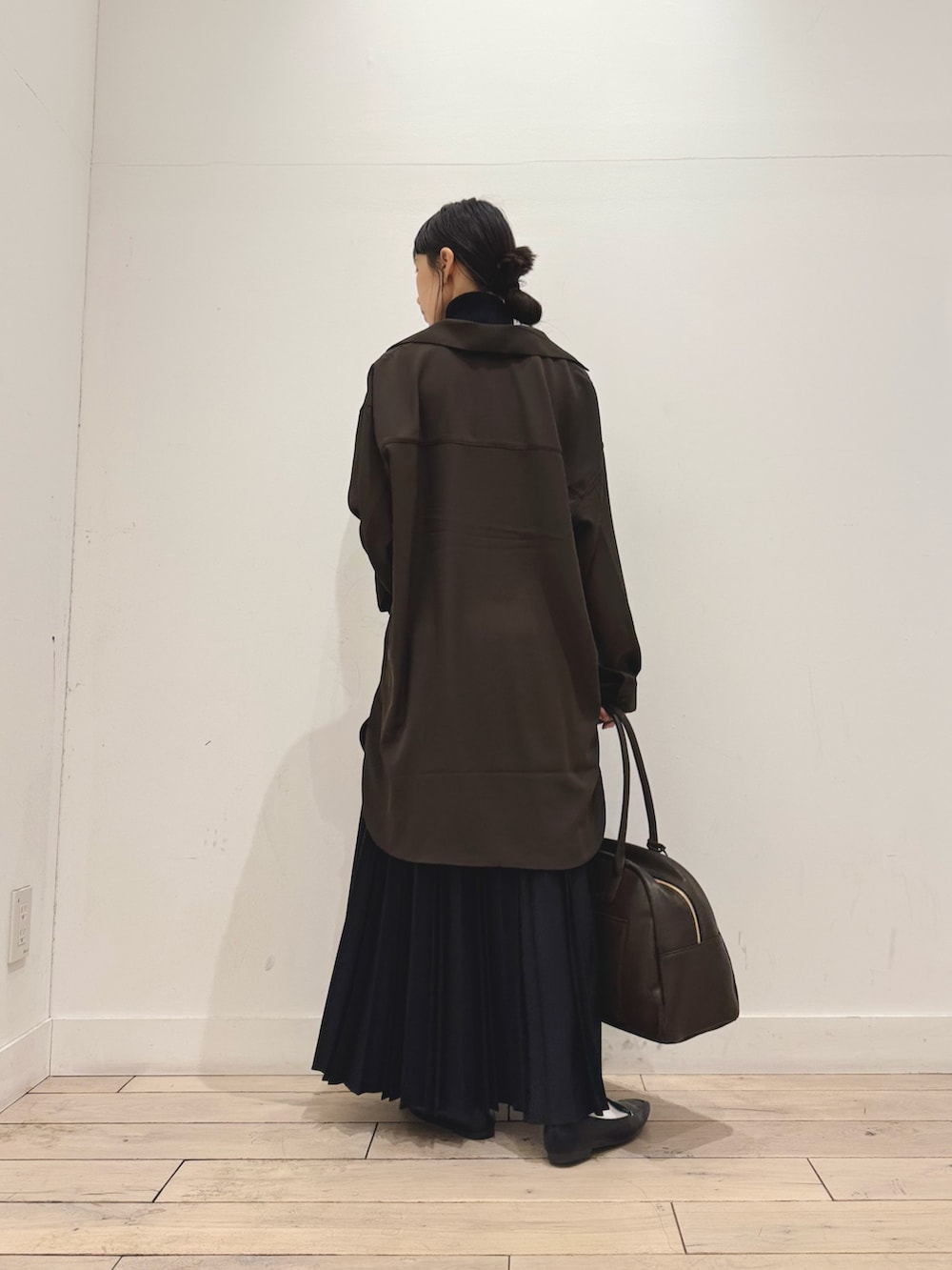 バッグはブラウスと色味を合わせてブラウンに。デザインがとてもかわいいのはもちろんですが、大きいので荷物がたくさん入ります‼︎
