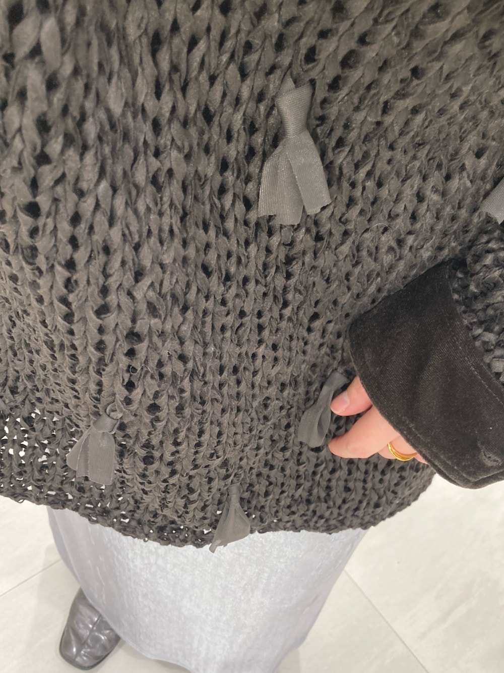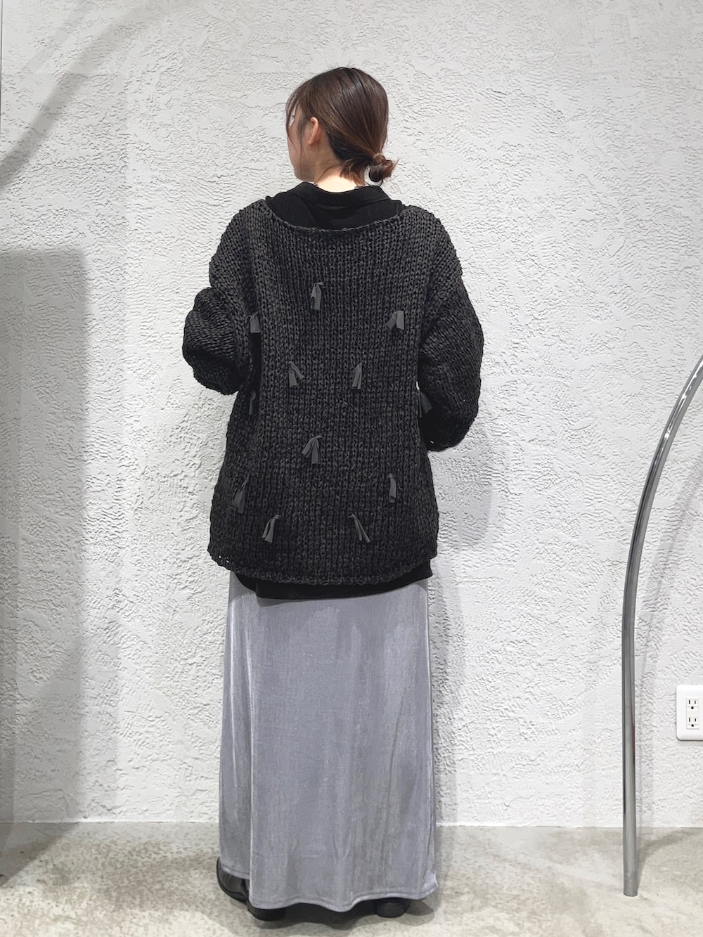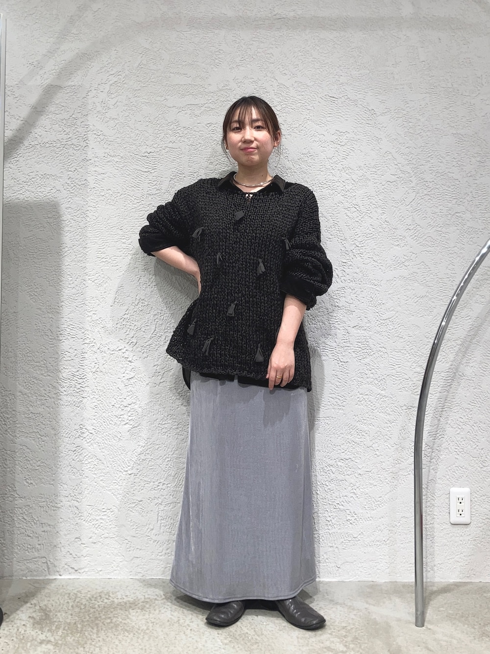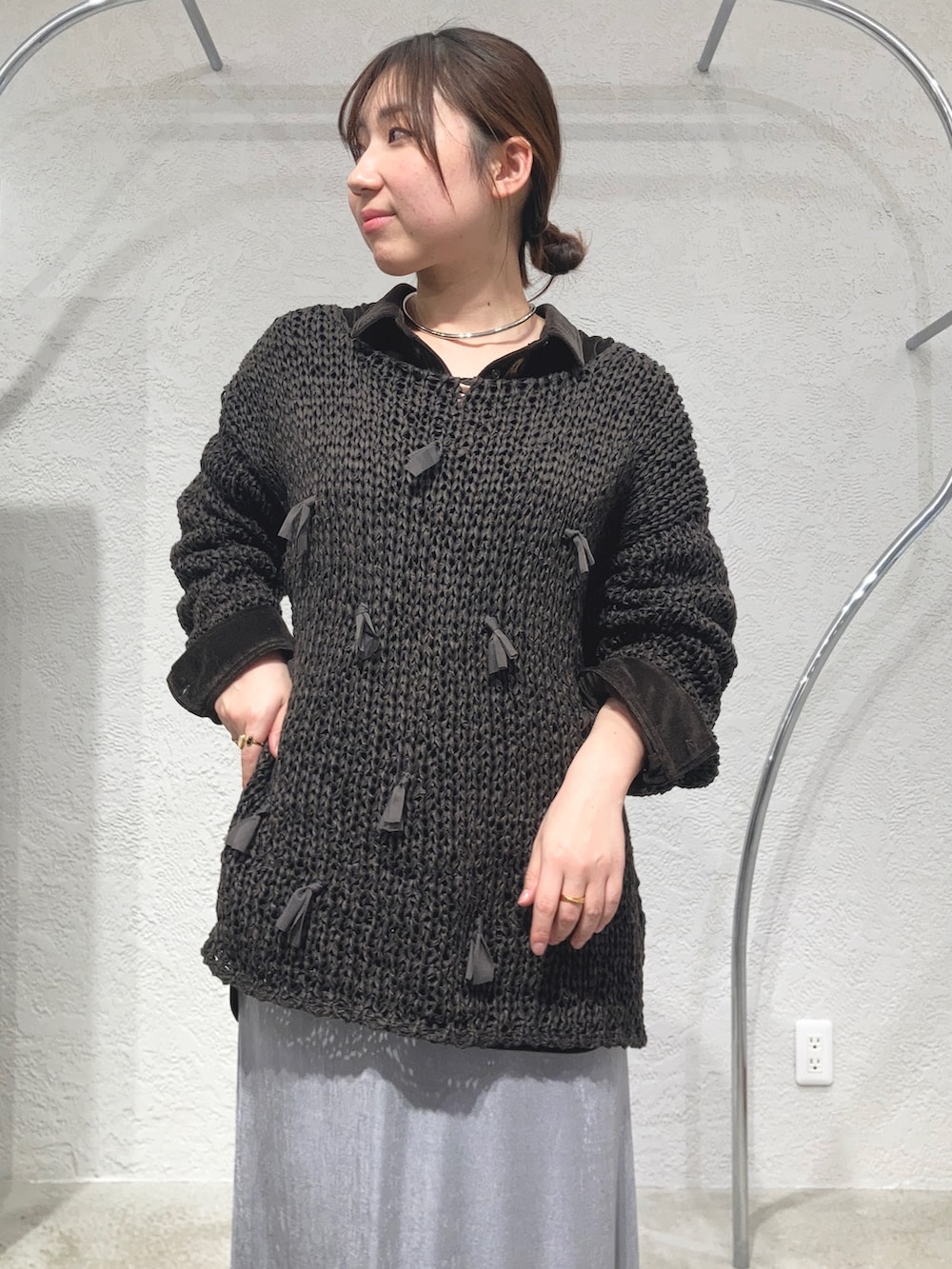 柔らかい着心地のベロアシャツは、首元のボタンを開けると開襟シャツのようなシルエットになり、横に広く開いたニットの首元に馴染んでくれます!