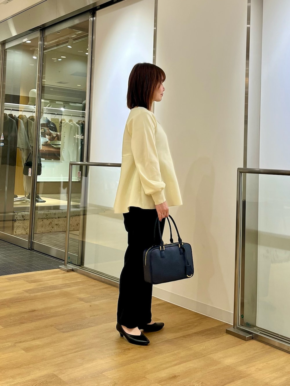 ペプラムニットはお腹周りをすっきりカバーしてくれます。