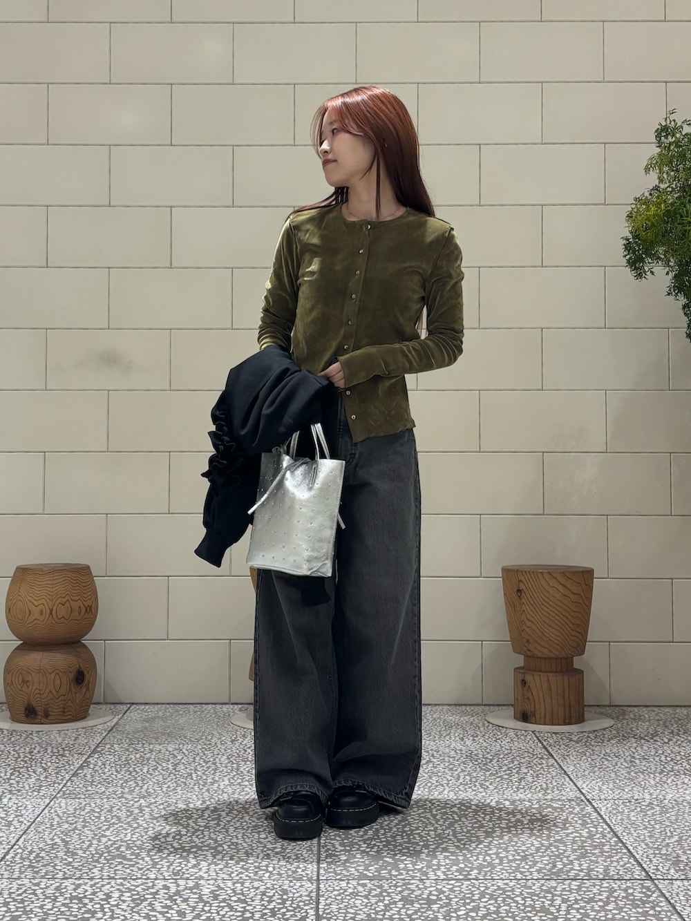 柔らかく、ストレッチ性のあるシアーフロッキーカーディガンです。ボタンを開けて抜け感の出る着こなしがおすすめです。
