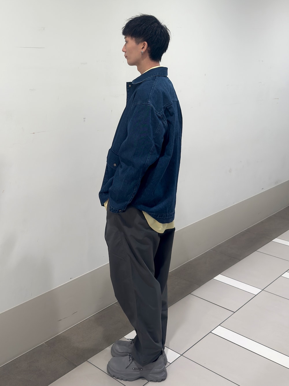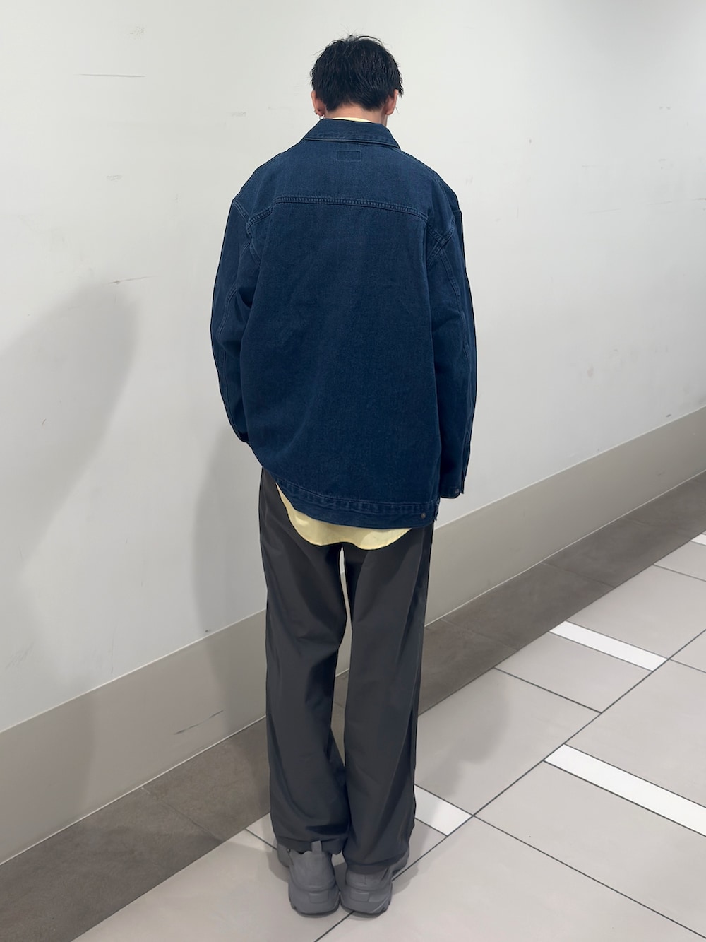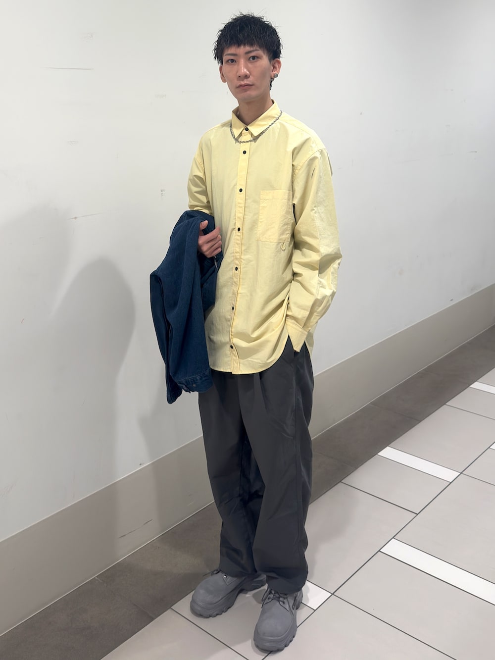 UR TECHナイロンタッサーLSシャツのイエロー色にEKALのデニムカバーオールを合わせました