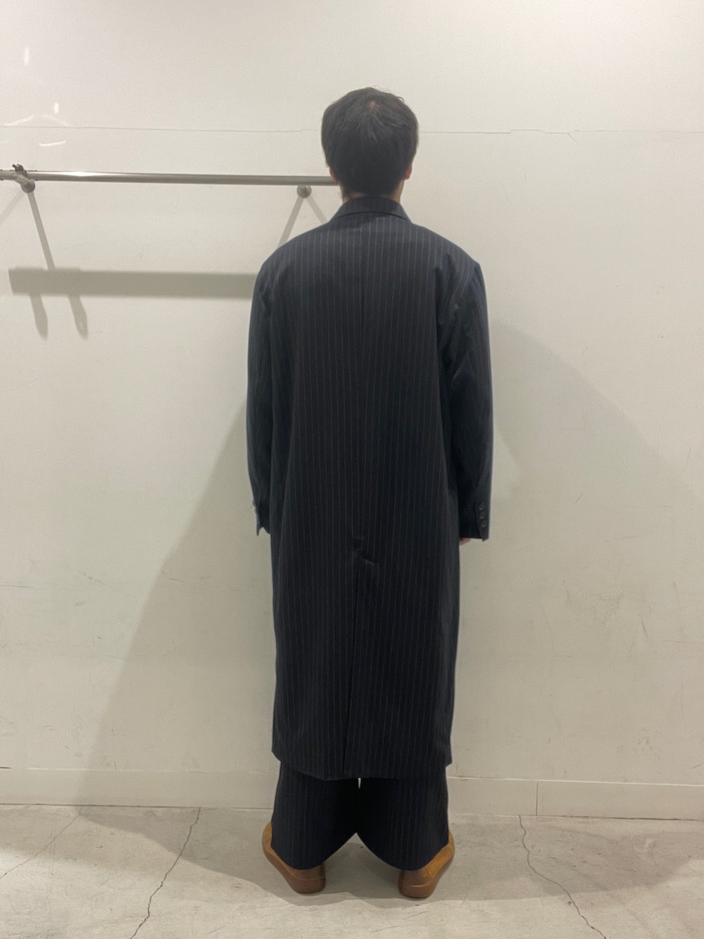 ネイビーのストライプ柄ロングコートと同柄のパンツを合わせたセットアップコーデ!