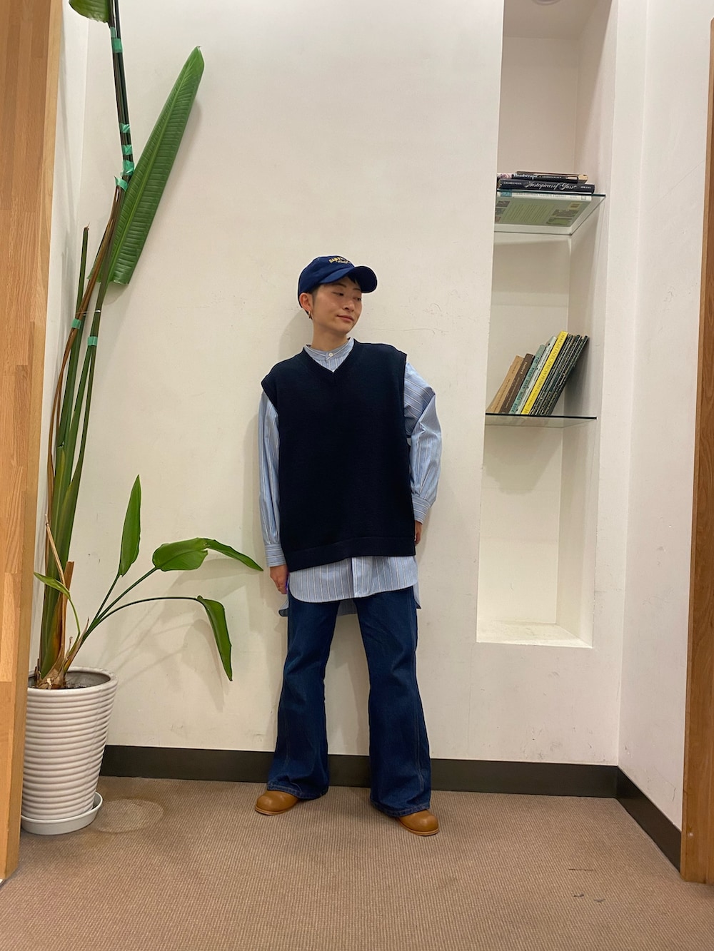 おじっぽくならないようにパンツはフレアパンツで足元はブーツにして可愛らしさを出しています。