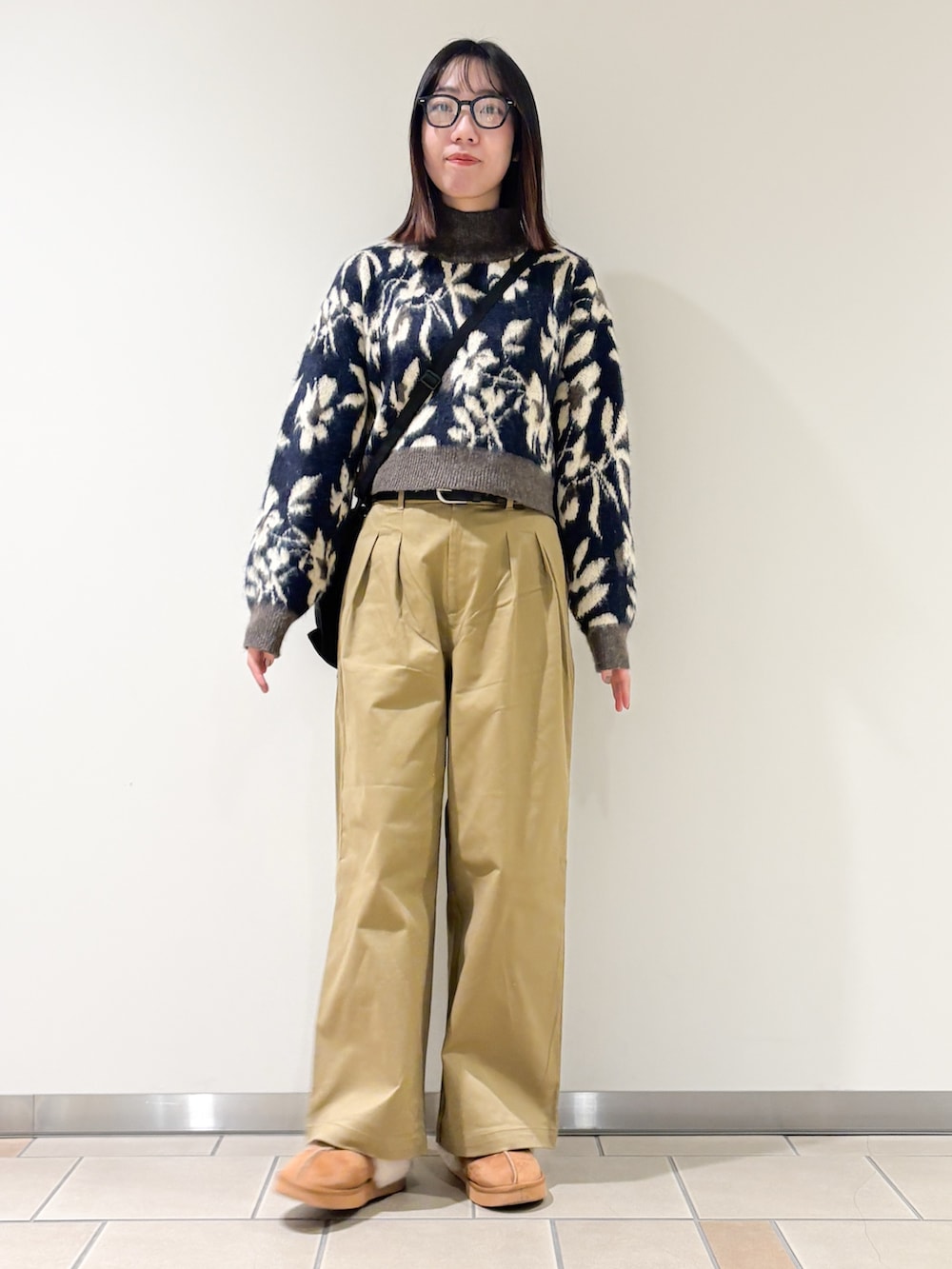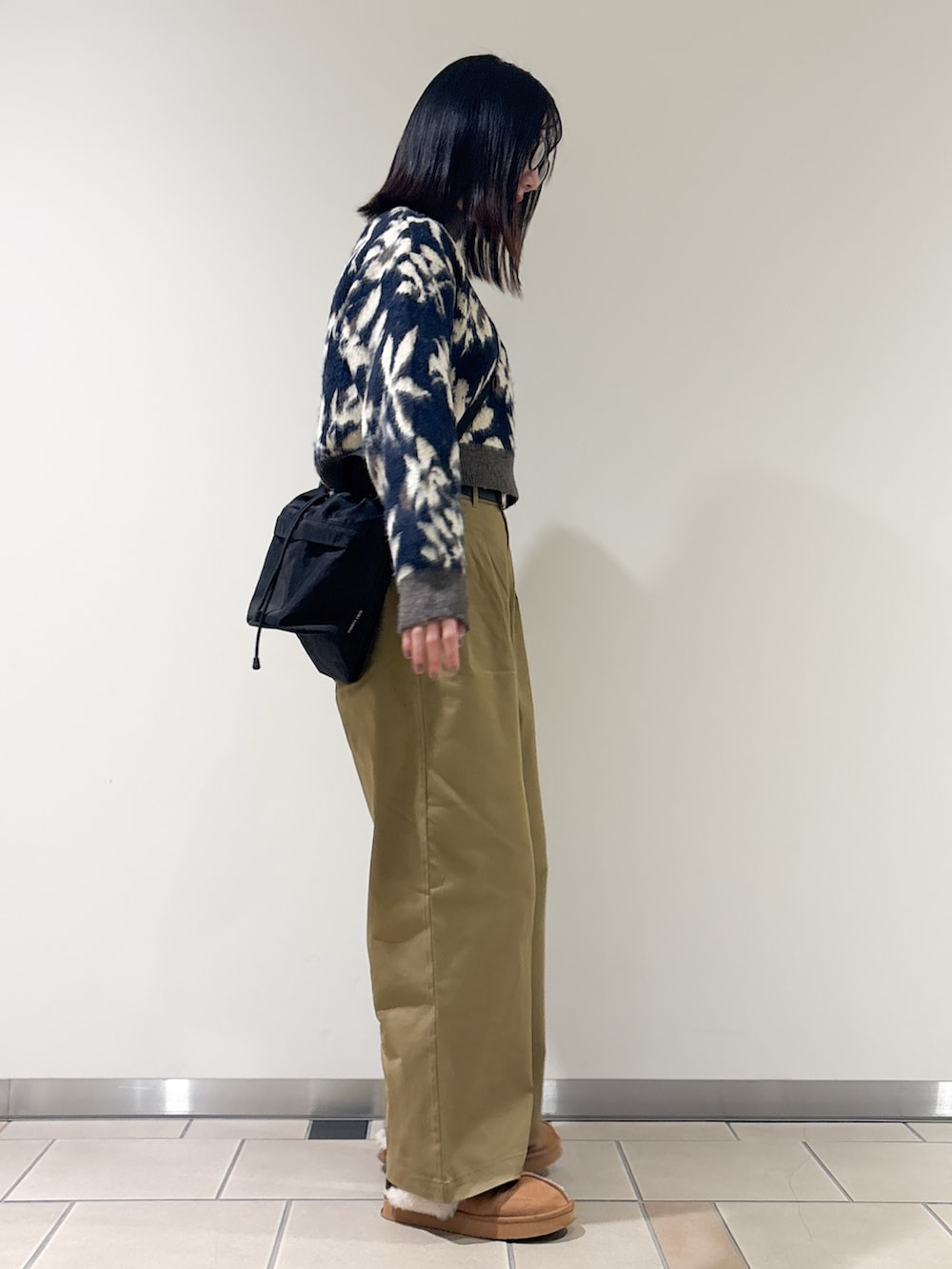 ボトムはカジュアルスタイルの定番チノパンツ。ワイドシルエットで気になる部分もカバーできます^^