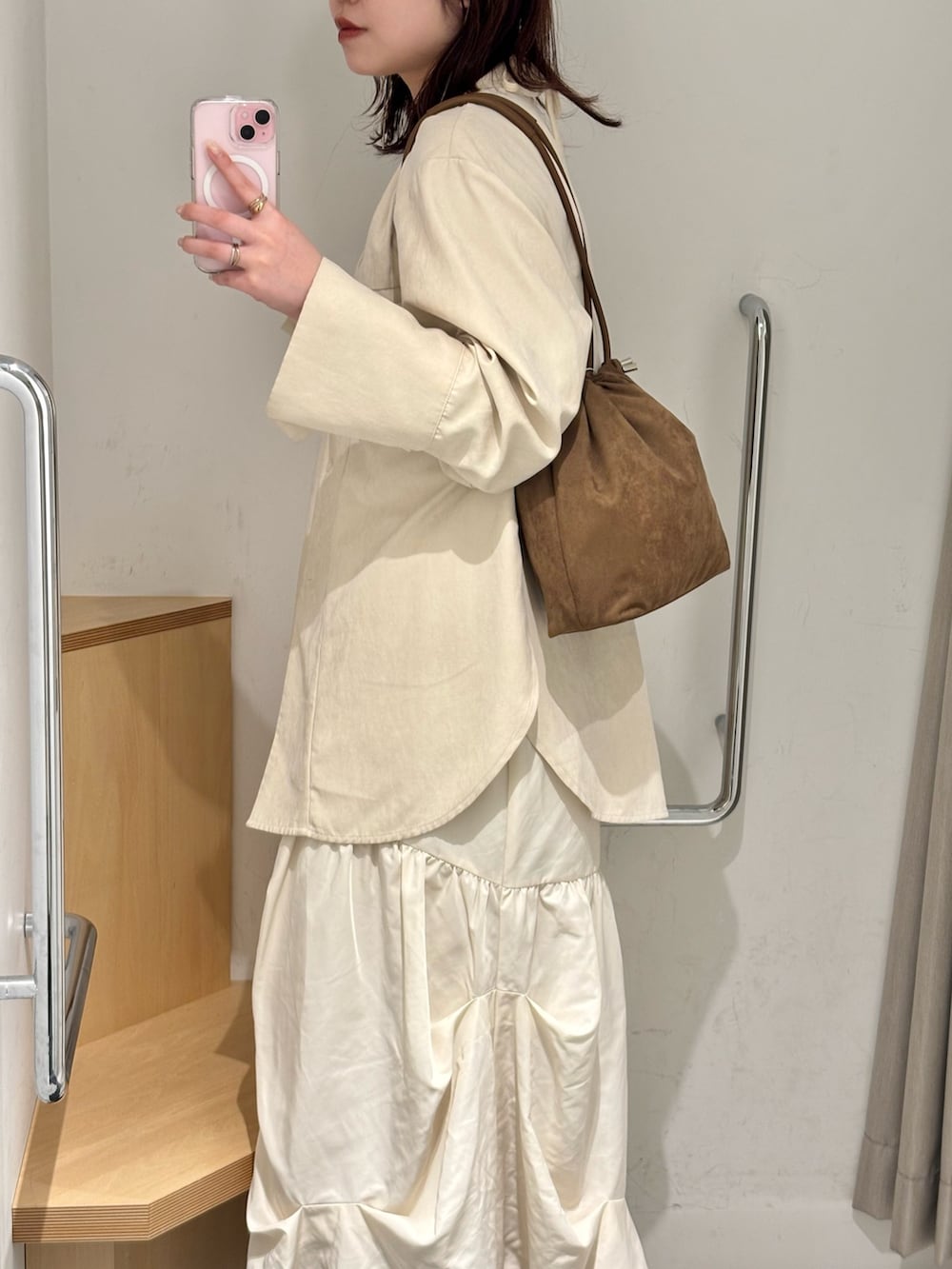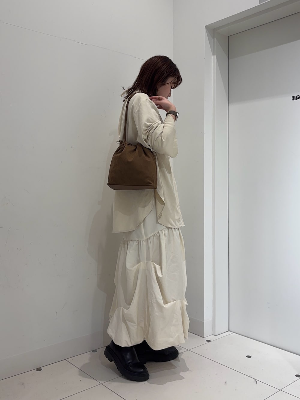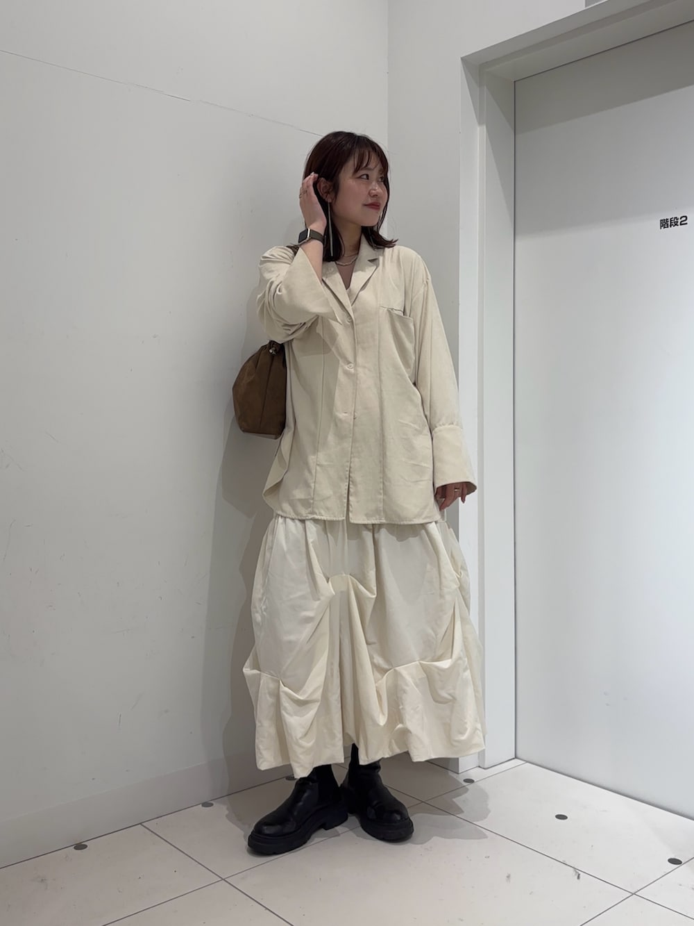 ボリュームのあるスカートにゆるっとシャツを合わせてルーズな春のスタイリングに。
