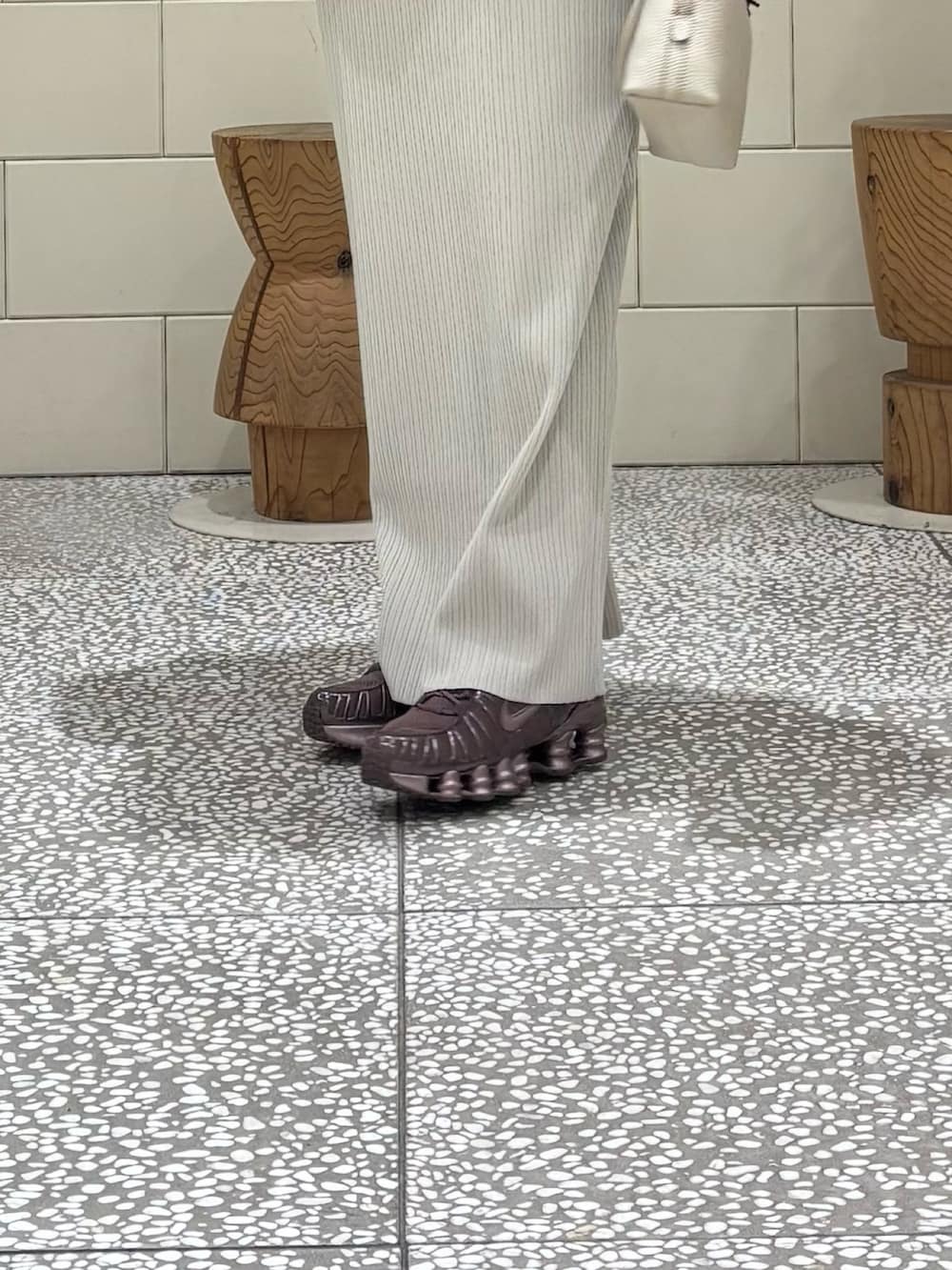 NIKE SHOXのブラウンスニーカーです。履き心地は軽く、ゴツさが可愛い存在感のある一足です。サイズはいつもより大きめを選ぶのがおすすめです。