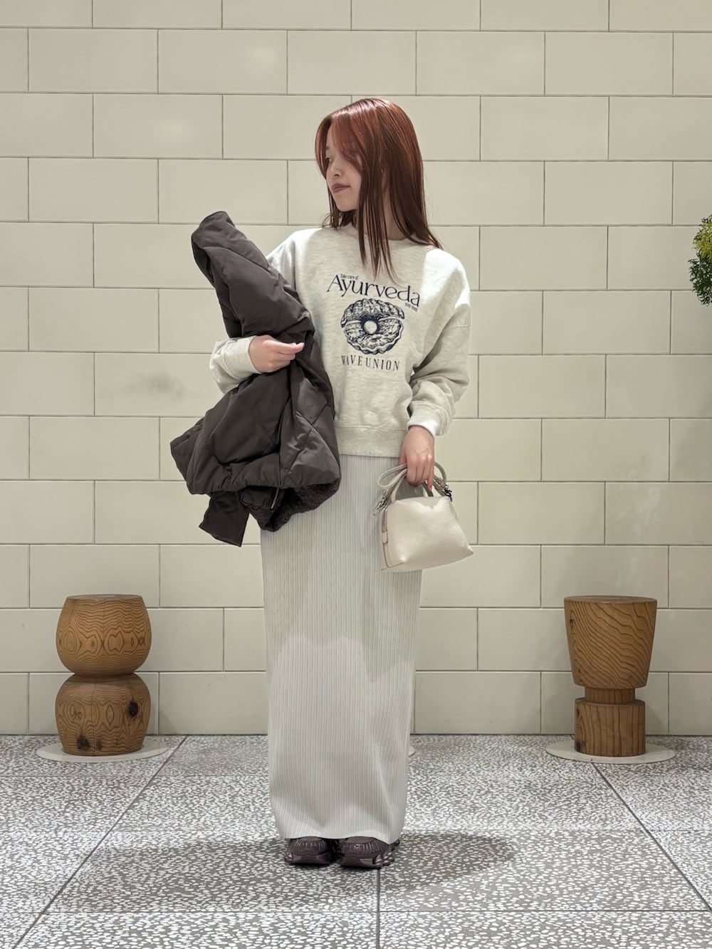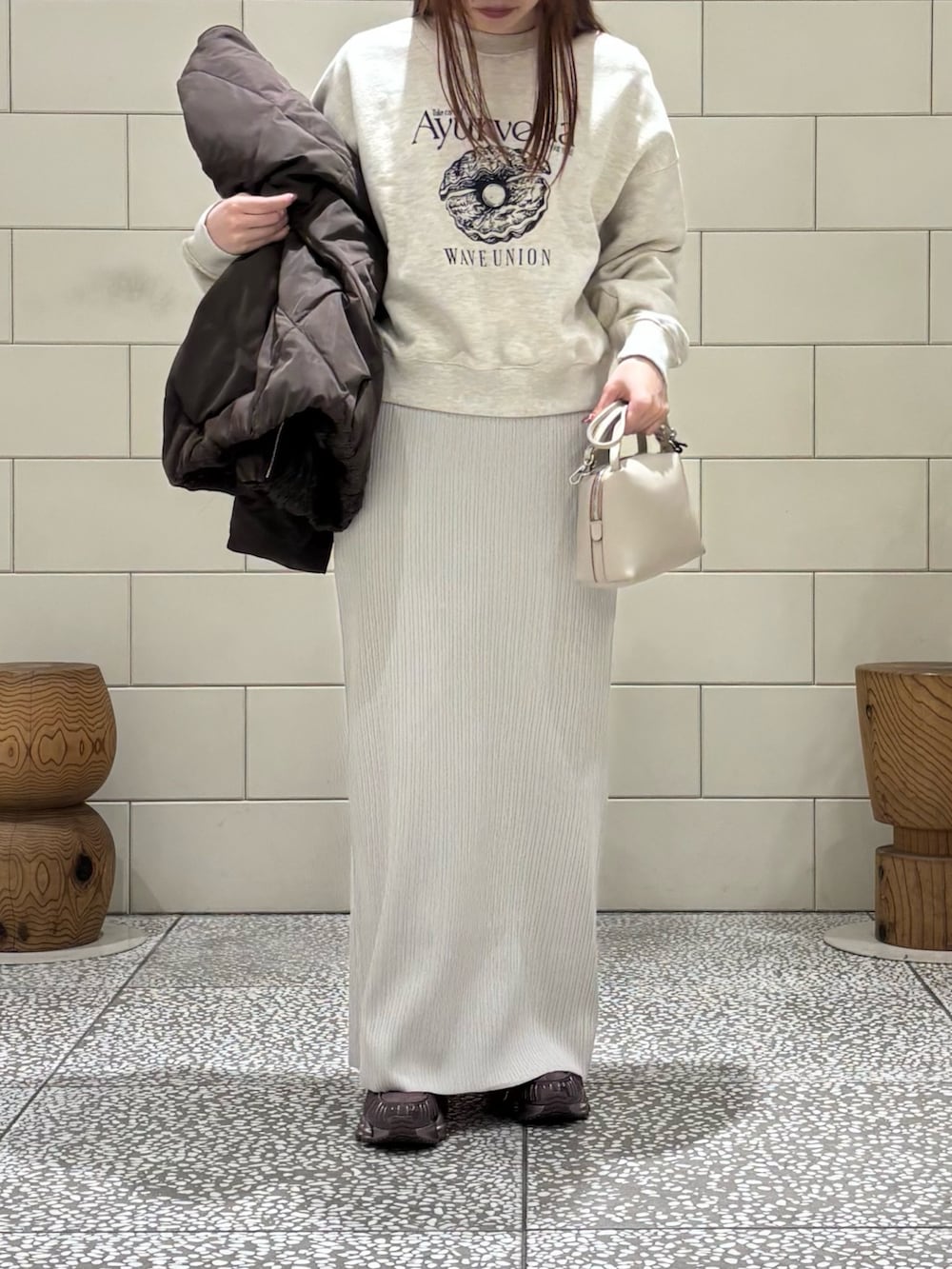 しっかりとした生地感のリブスカートです。縦のラインがしっかりと出るのでスッキリとした着こなしができます。