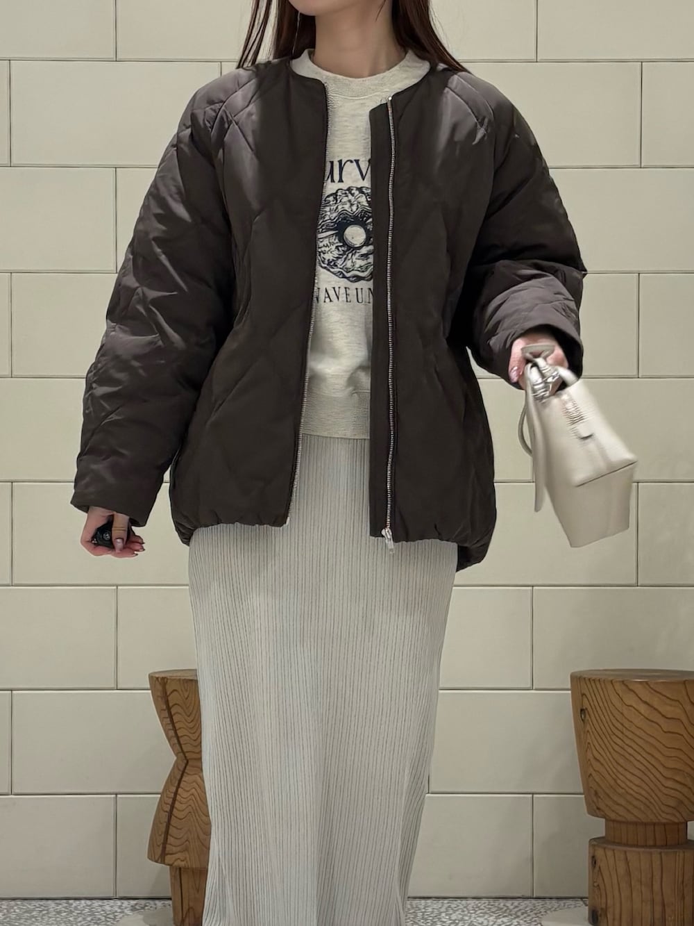 軽くて羽織りやすい薄手のキルティングダウンです。キレイめなスタイリングにも合わせやすいデザインで春先まで長く使っていただけます。