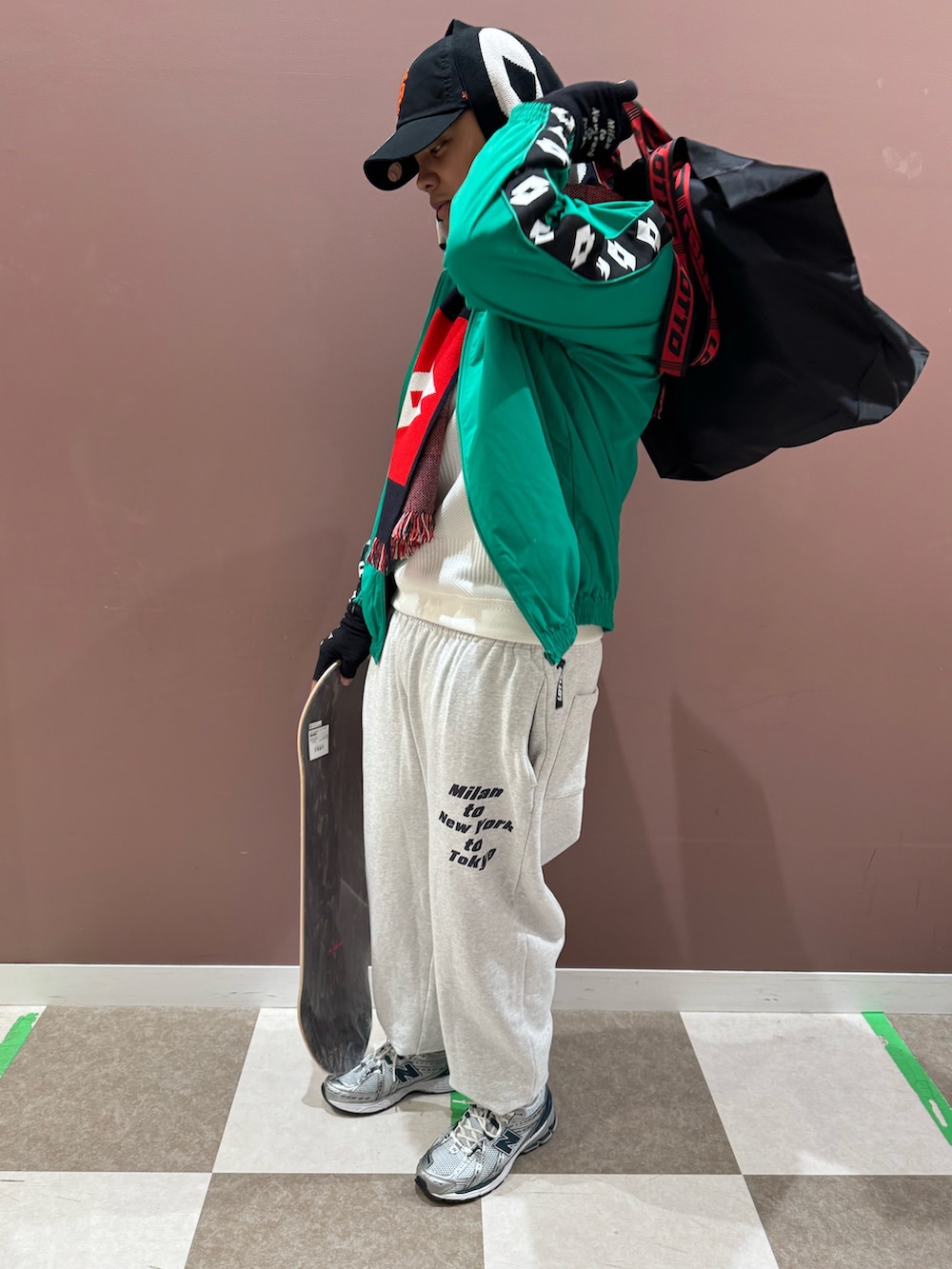 鮮やかなグリーンのLottoナイロンジャケットは、90sライクな配色とロゴテープが程よい存在感を放ち、都会的でありながらストリート感のある印象に仕上げています。インナーにはスウェットとマフラーを重ね、スケートカルチャーらしいラフさと防寒性を両立。