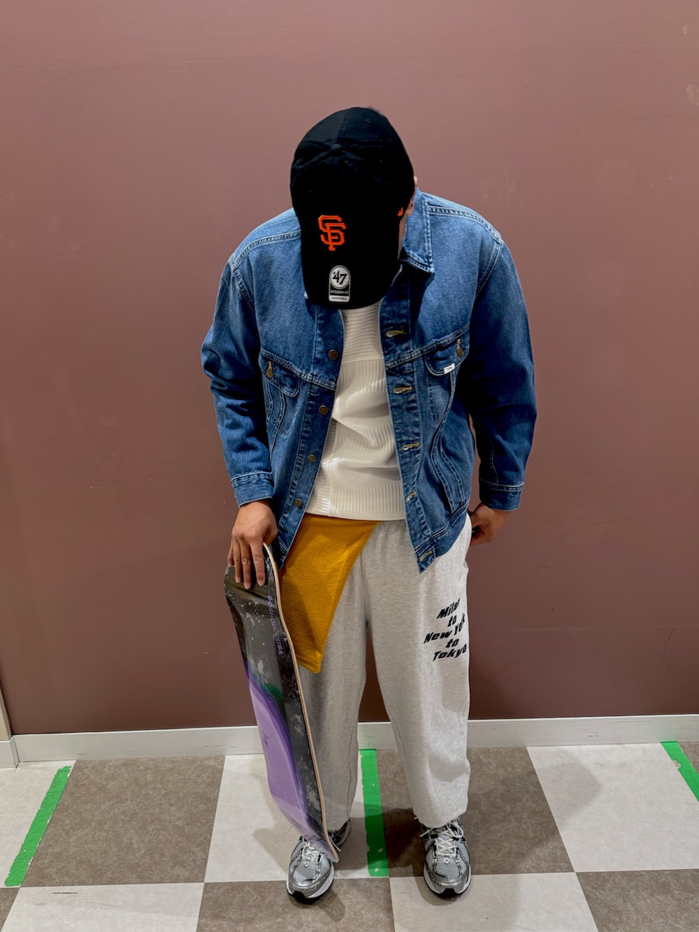 インナーにはシンプルなトップスを合わせ、デニムジャケットの存在感を際立たせる構成に。ボトムスはワイドシルエットのスウェットパンツを選び、90sらしいリラックス感と動きやすさを意識しました。腰元にさりげなく差し色を入れることで、ストリートらしい遊び心もプラス。