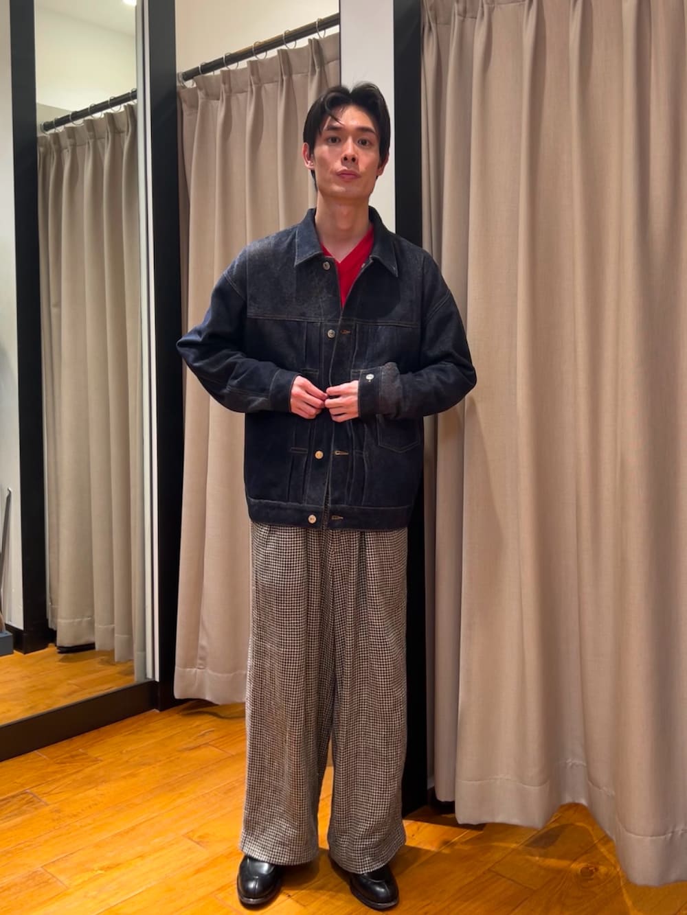 合わせ方はデニムジャケットと同じ感覚で合わせていただければバッチリハマると思いますが、デニムには品の良さ、大人っぽさはこのジャケットにしか出せません。