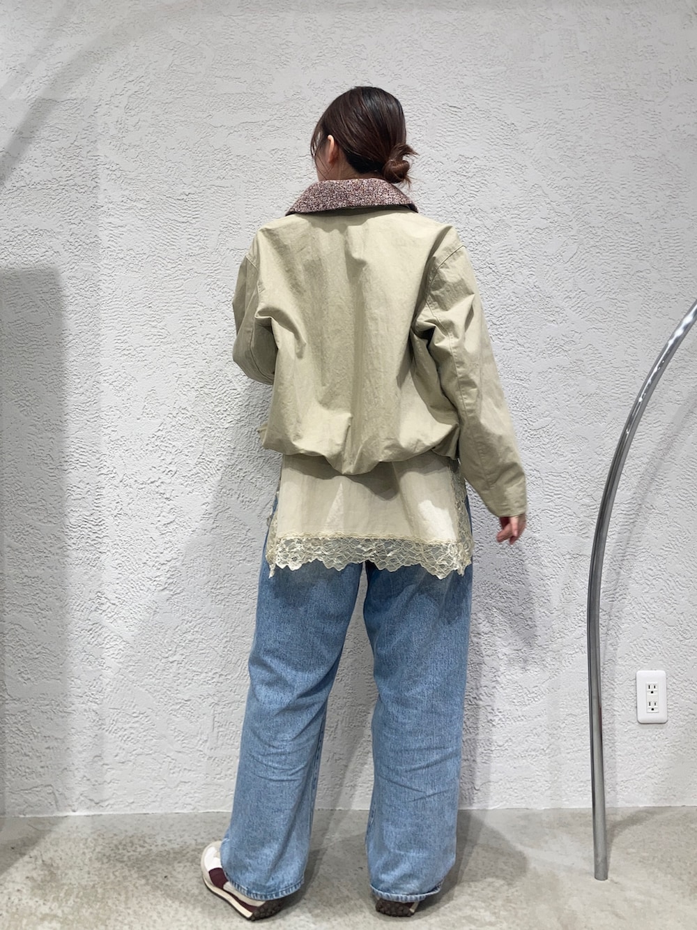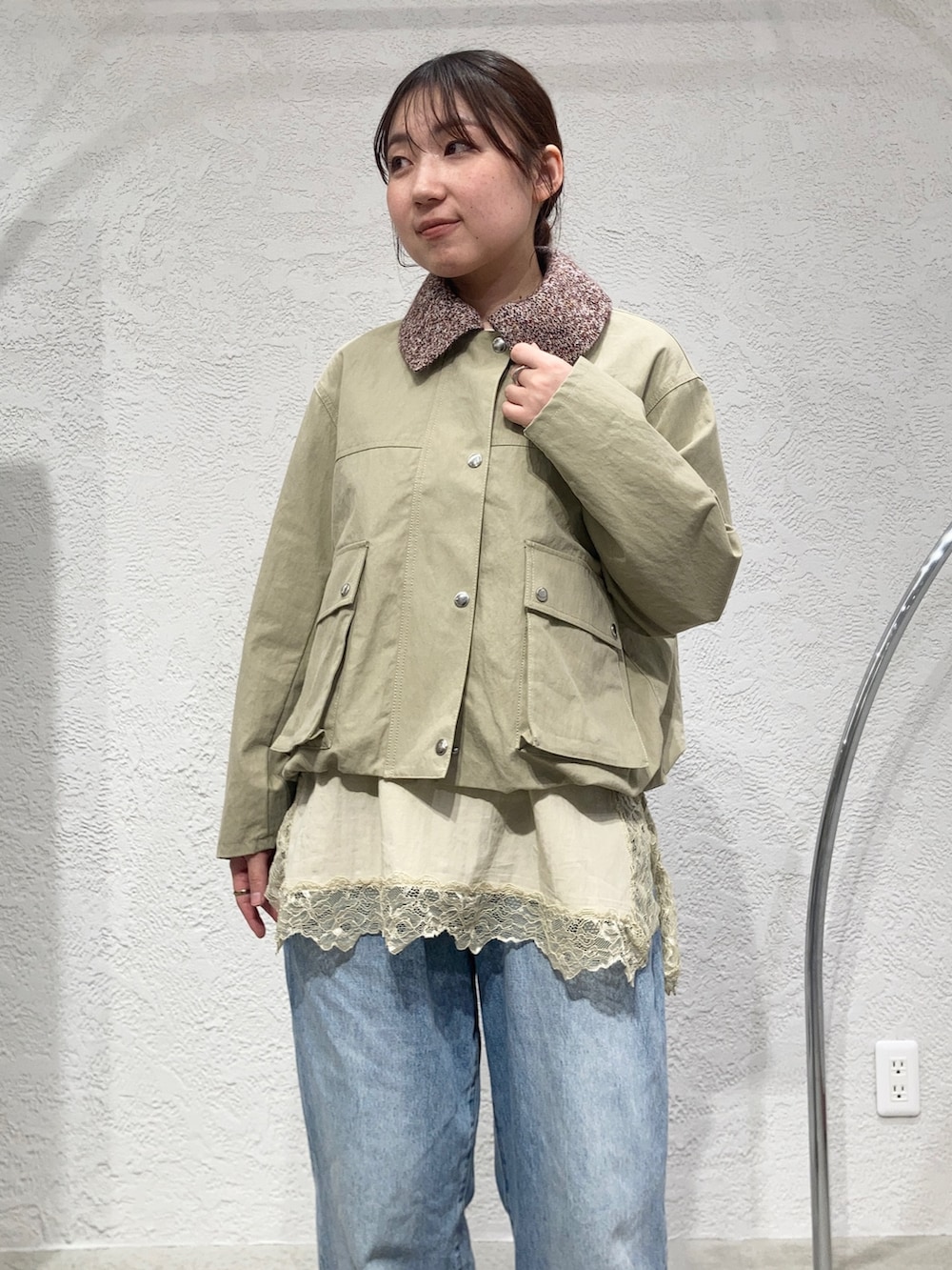 ブルゾンとデニムだとカジュアルコーデなので、レディライクなバランスにしたくてレースキャミを重ねました✨