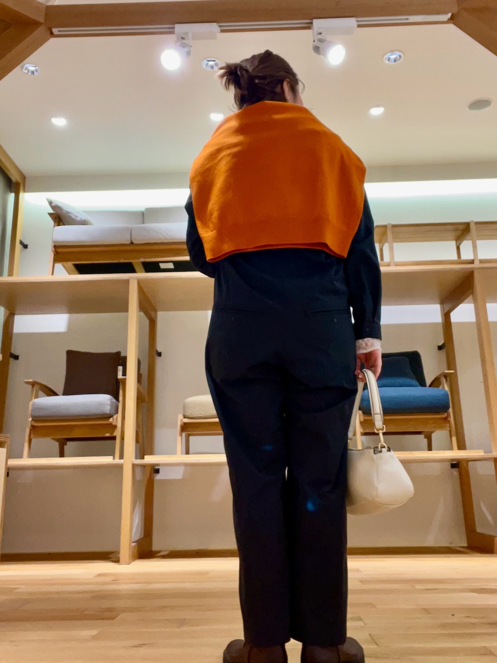 クールなアイテムなので肩掛けにオレンジカラーを差し色にしラフな要素をプラスしました‼︎