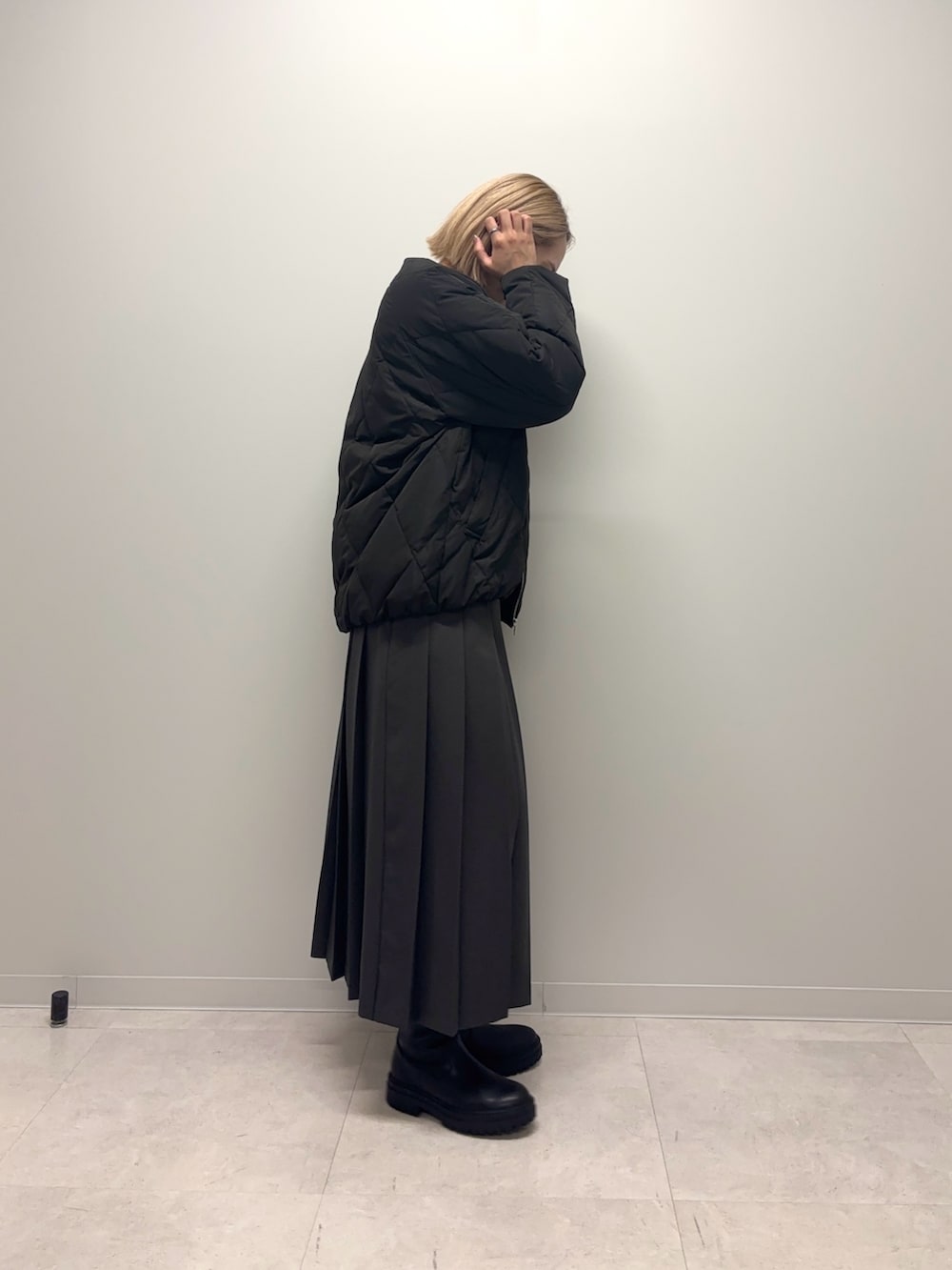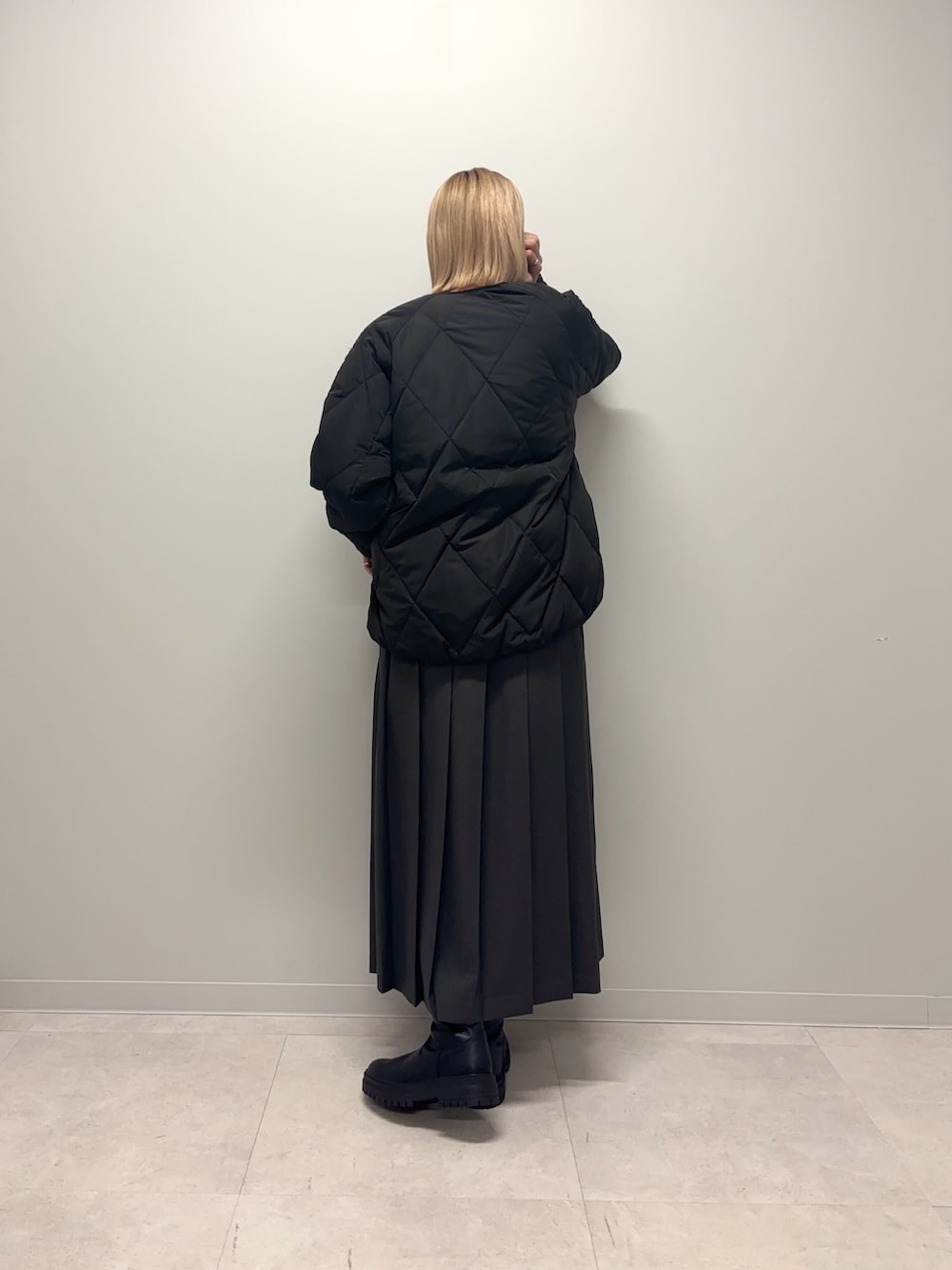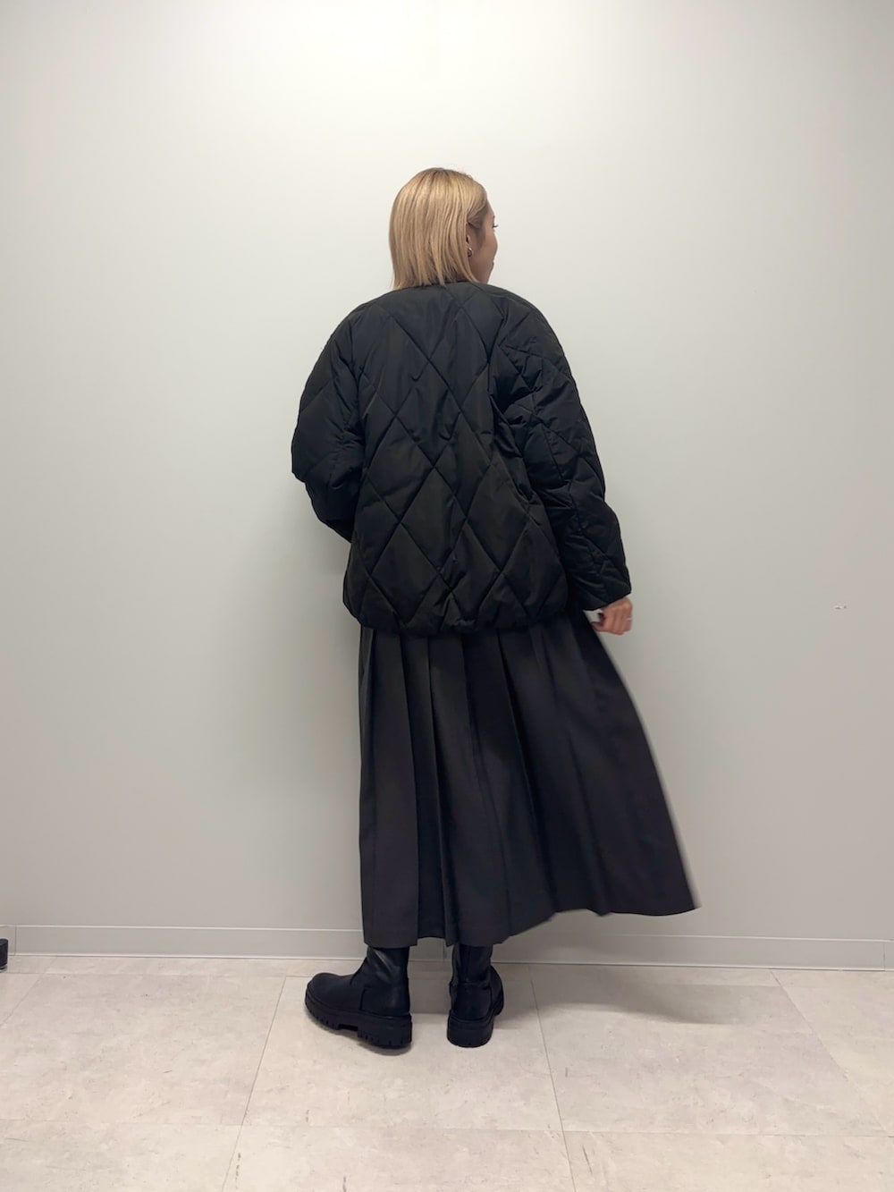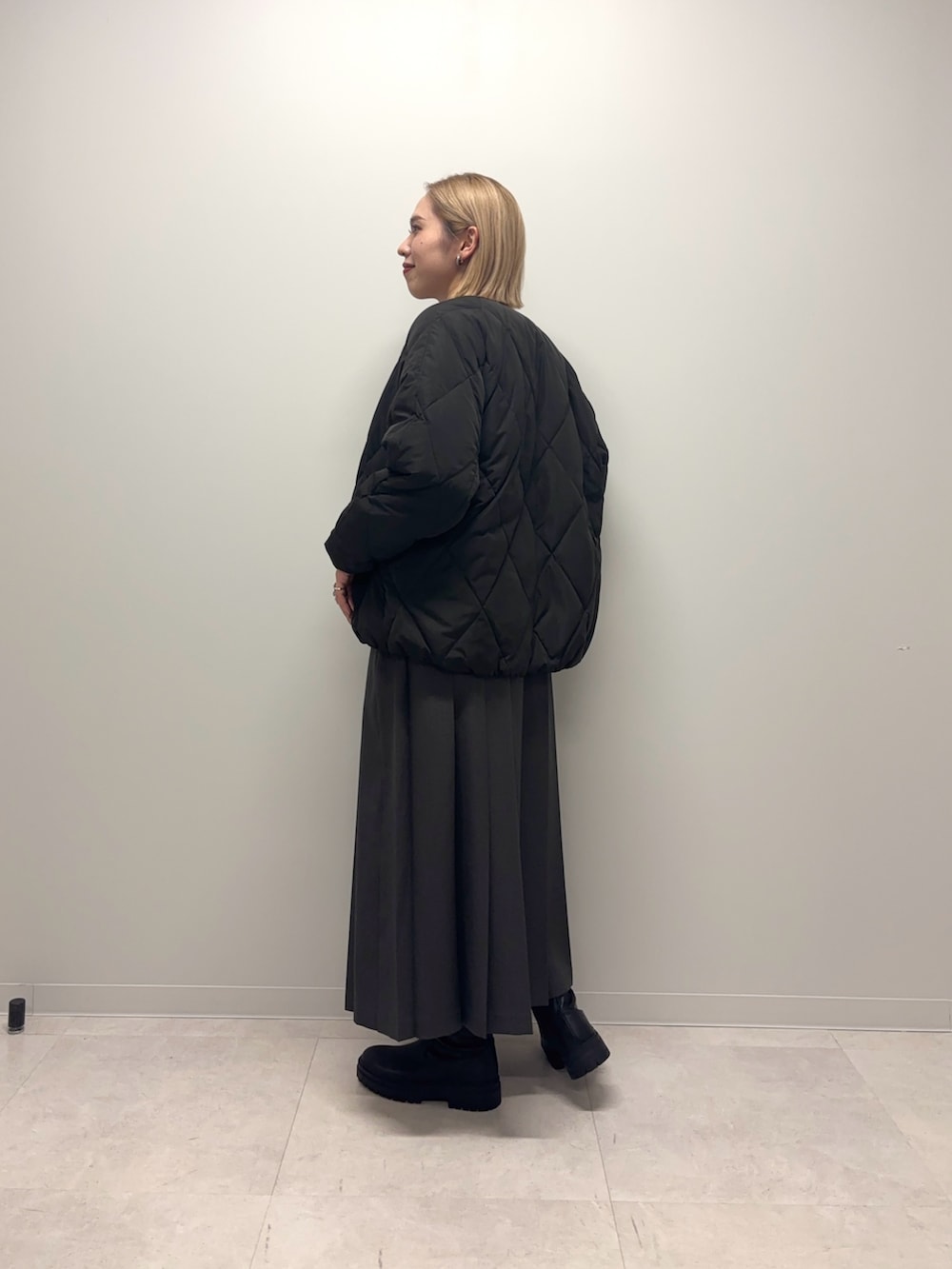 ダウンは裾が絞ってあり少し丸みがあるコクーンシルエットがポイントです◎ノーカラーでお顔周りがスッキリしていて中物を合わせやすいです◎程よくゆとりもあり楽な着心地+テイスト問わず合わせやすいデザインでおすすめです♪