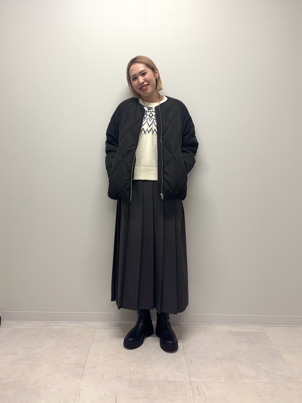 ニットはノルディックデザインが目を惹くので1枚でサマになります!アウターから覗くだけでも存在感のあるニットです♪