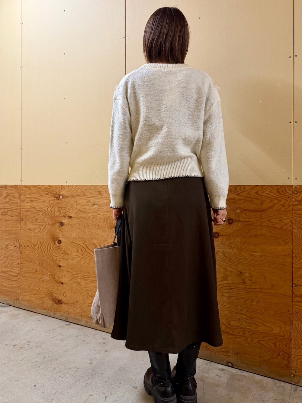 ニットのフリンジが華やかです。丈感は腰骨あたりです。