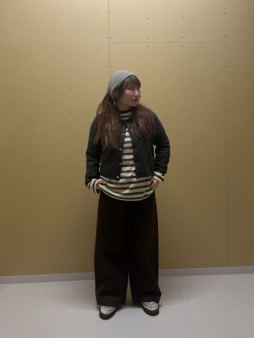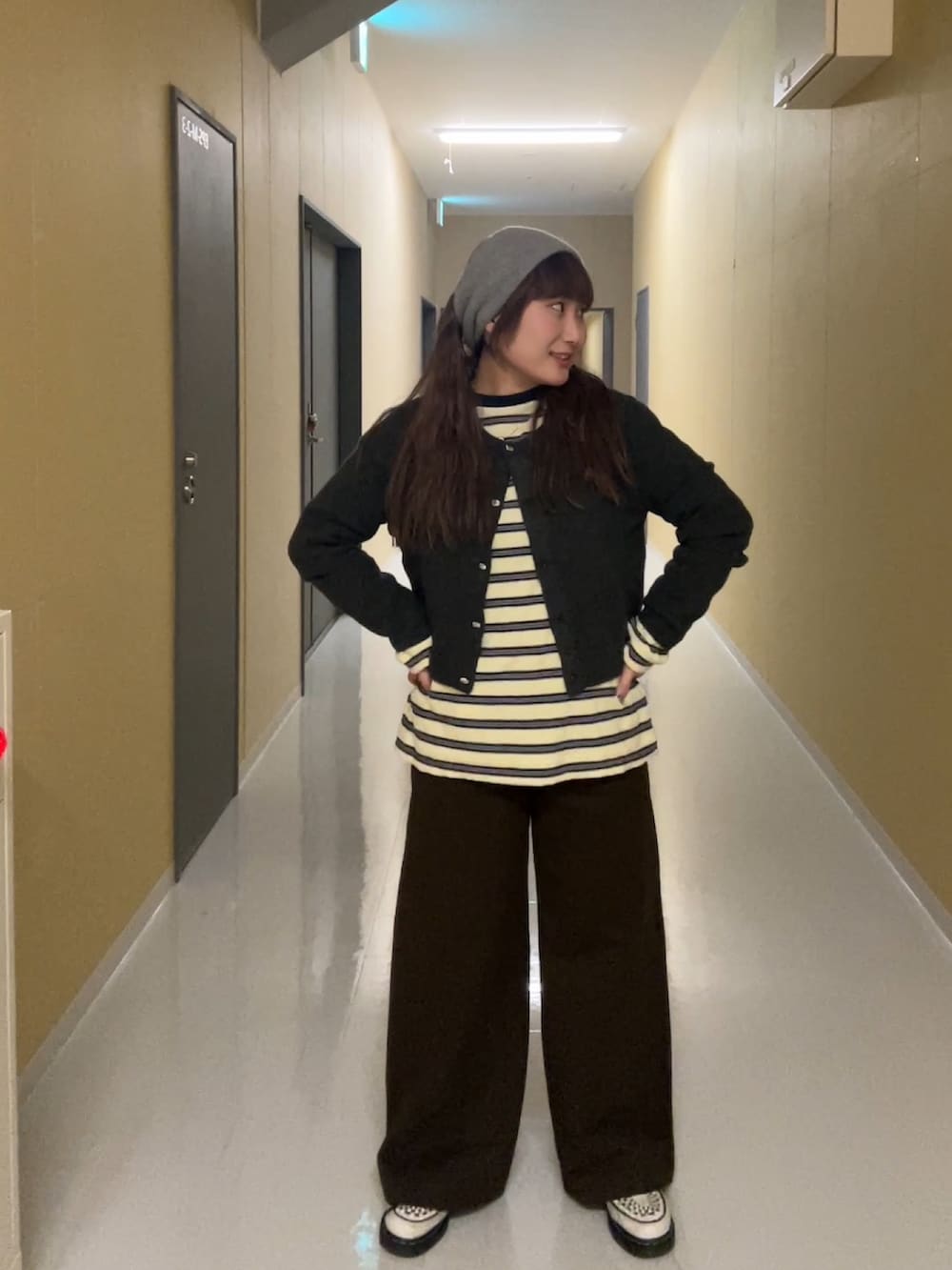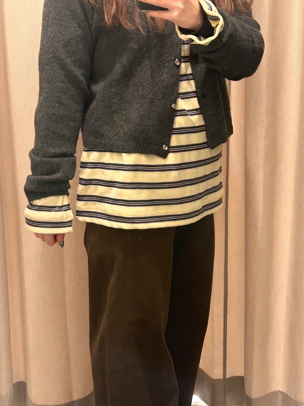 ベロアボーダーTシャツだけだと、カジュアル過ぎるので、チャコールのカーディガンと合わせてみました😋😋