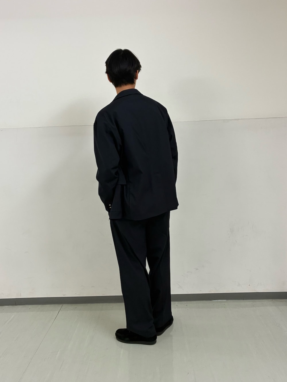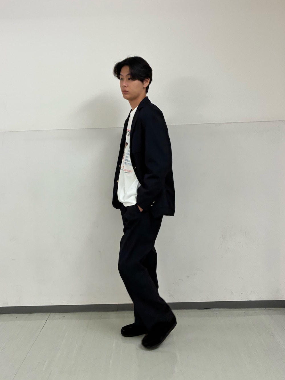 テーラードをベースにしつつ、身幅に程よいゆとりを持たせているのがポイント。ワイドめなスラックスと合わせることで、旬なセットアップ風の着こなしにしました。金ボタンがアクセントになるので、モノトーンでまとめても地味にならず、これ一着でコーディネートがバシッと決まります。