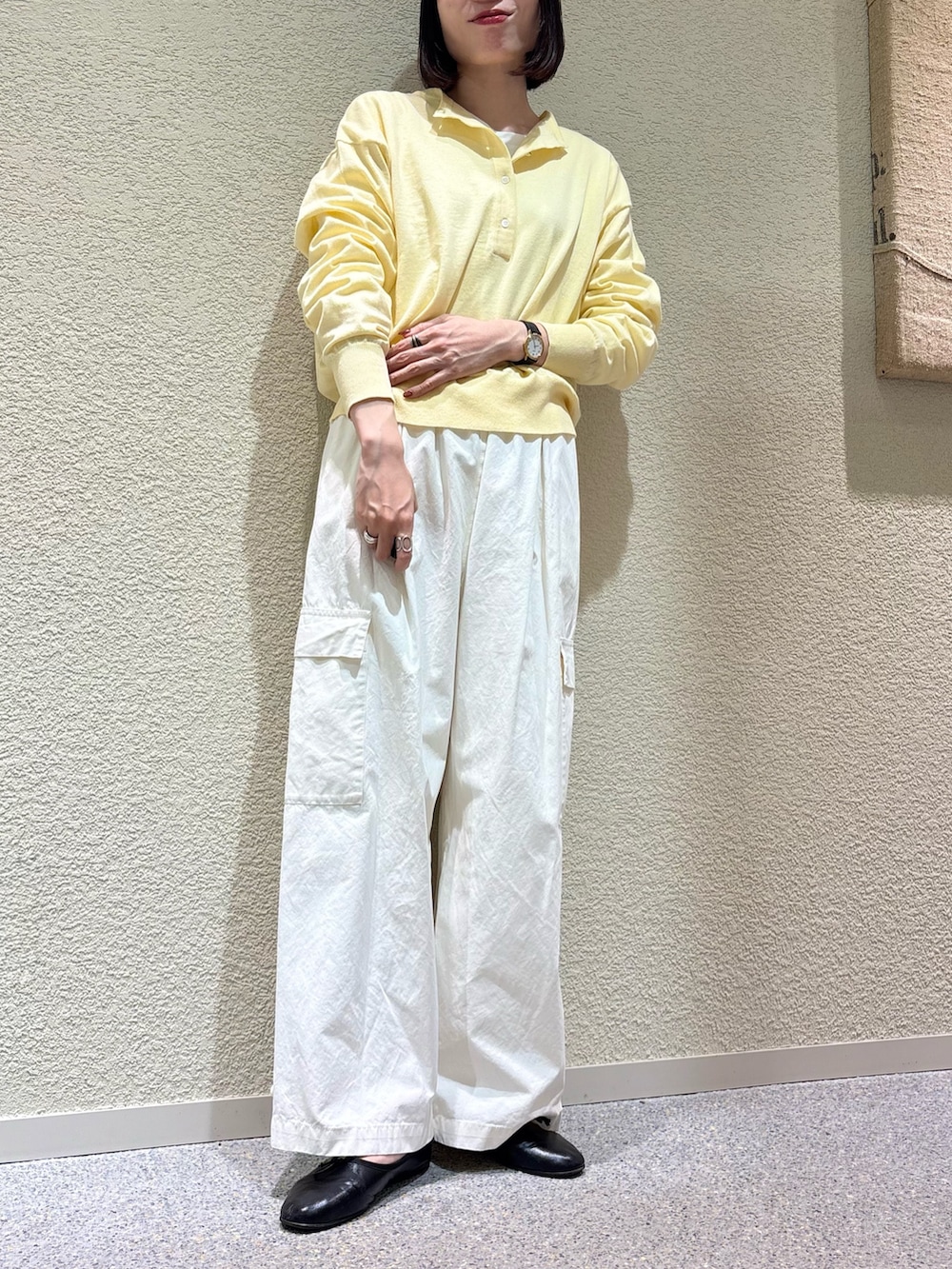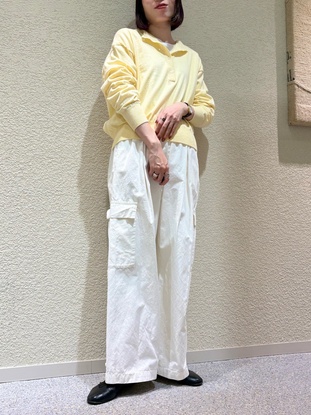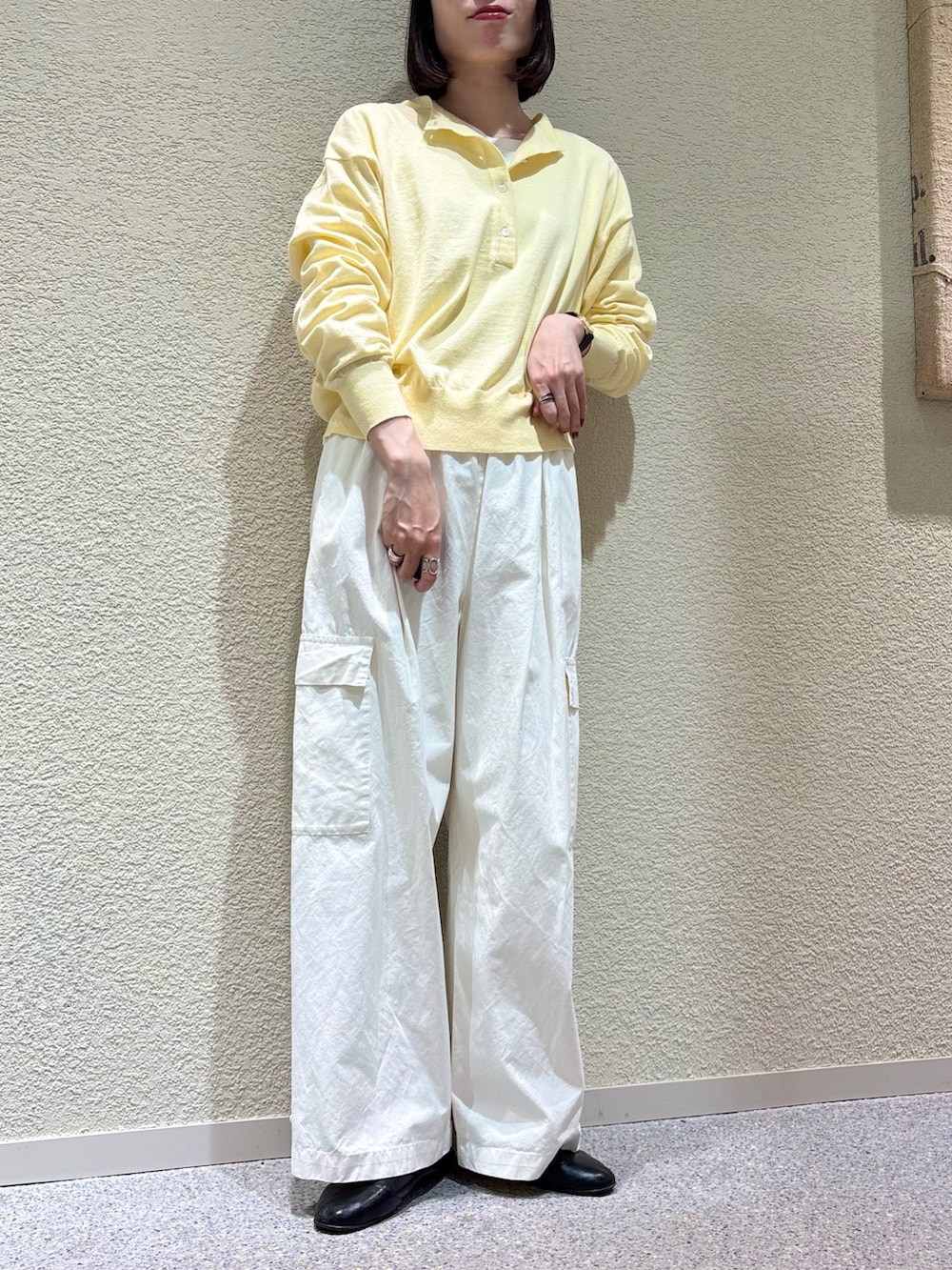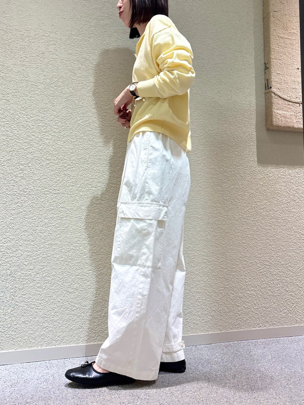 裾のボタン位置をかえるとテーパードシルエットに早変わりします。