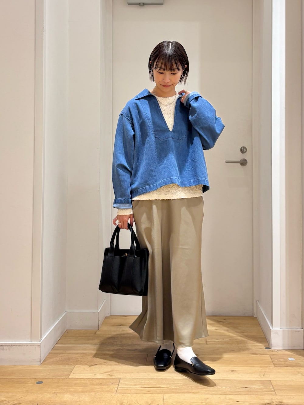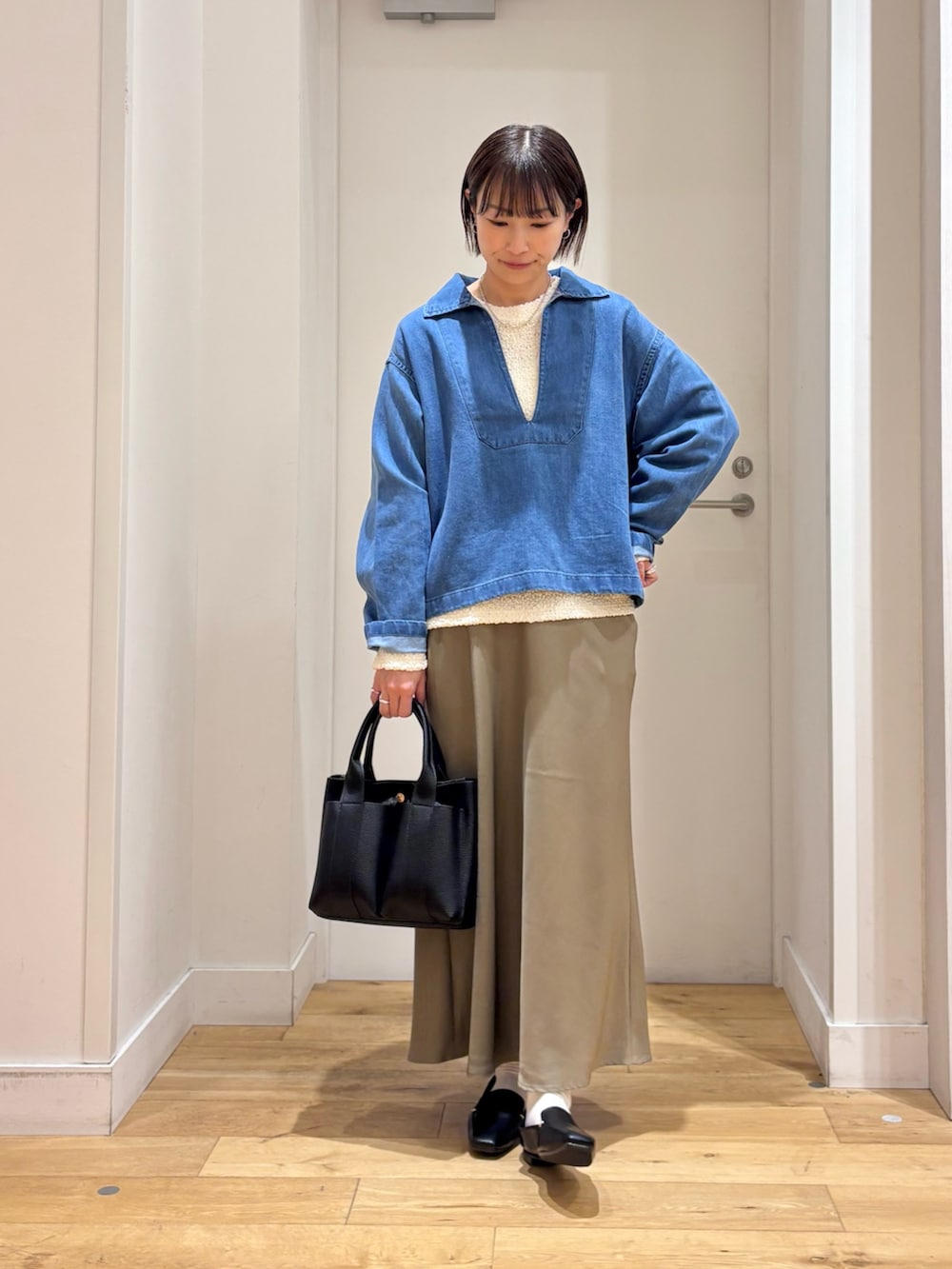 スキッパーネックがポイントのデニムシャツは、首元がスッキリなので合わせるインナーで雰囲気も変えて着回しも楽しめます♪