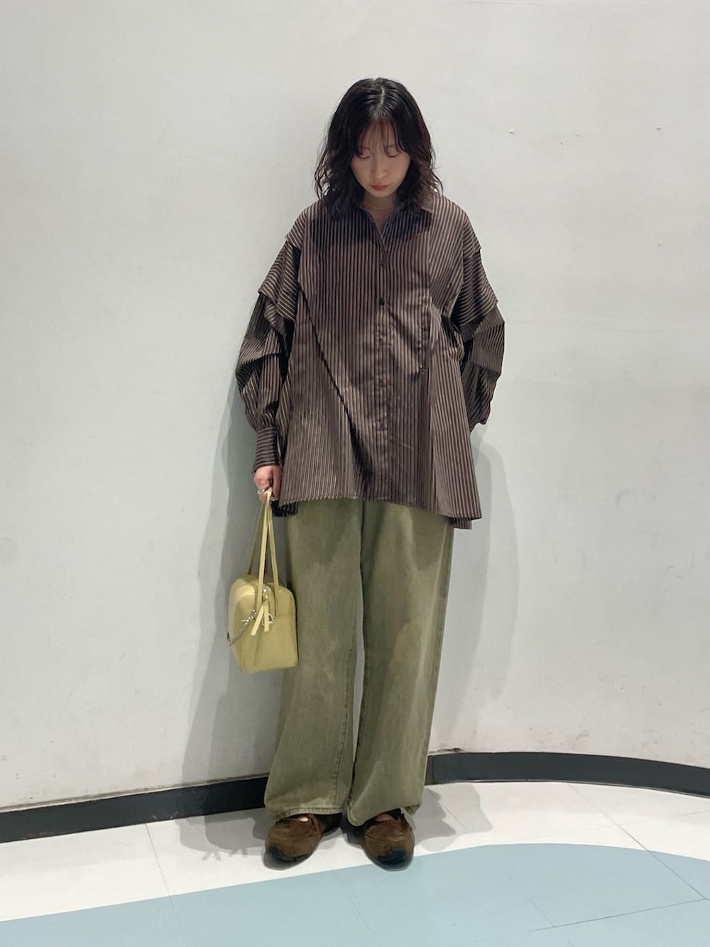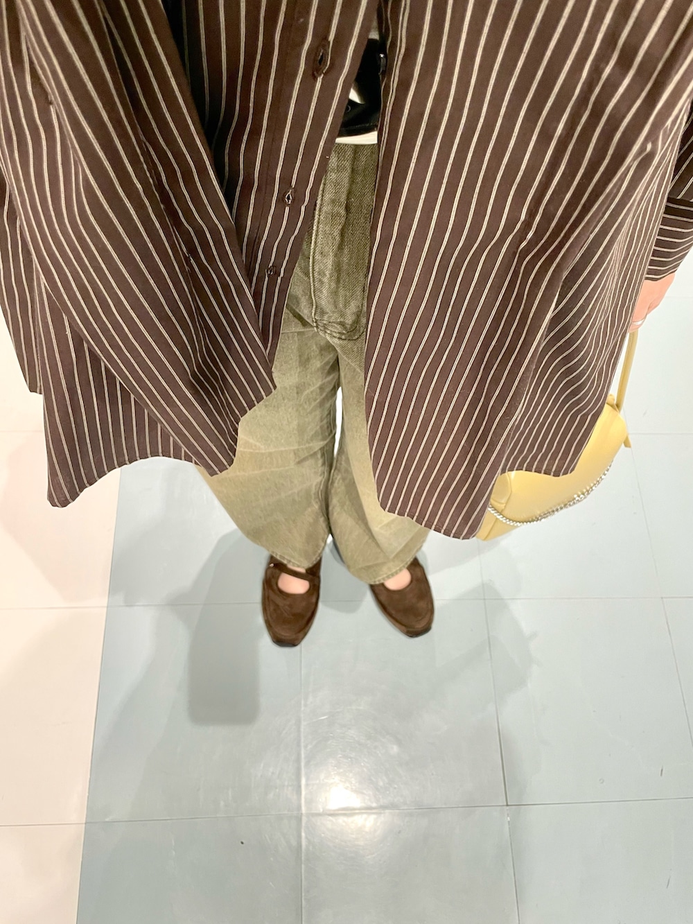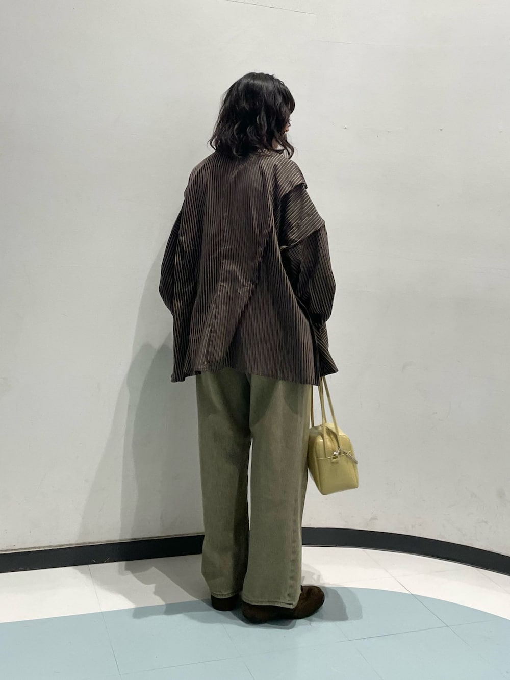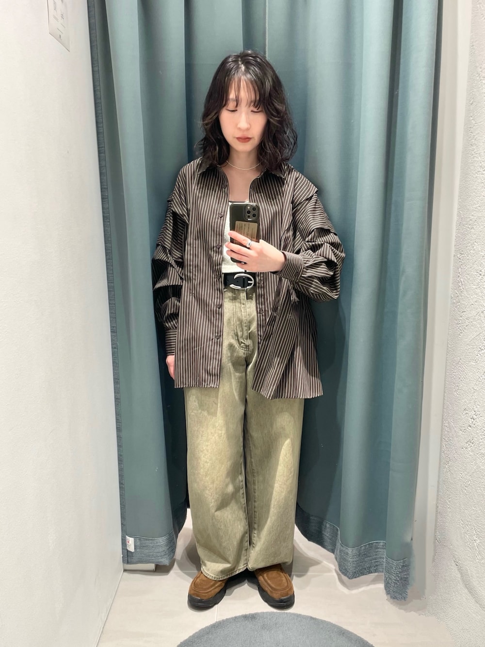 BIGポケットデザインデニムは普段ゆるっと36サイズで履くのが好みですが、トップスが大きめの場合はワンサイズ下げて34サイズにします。