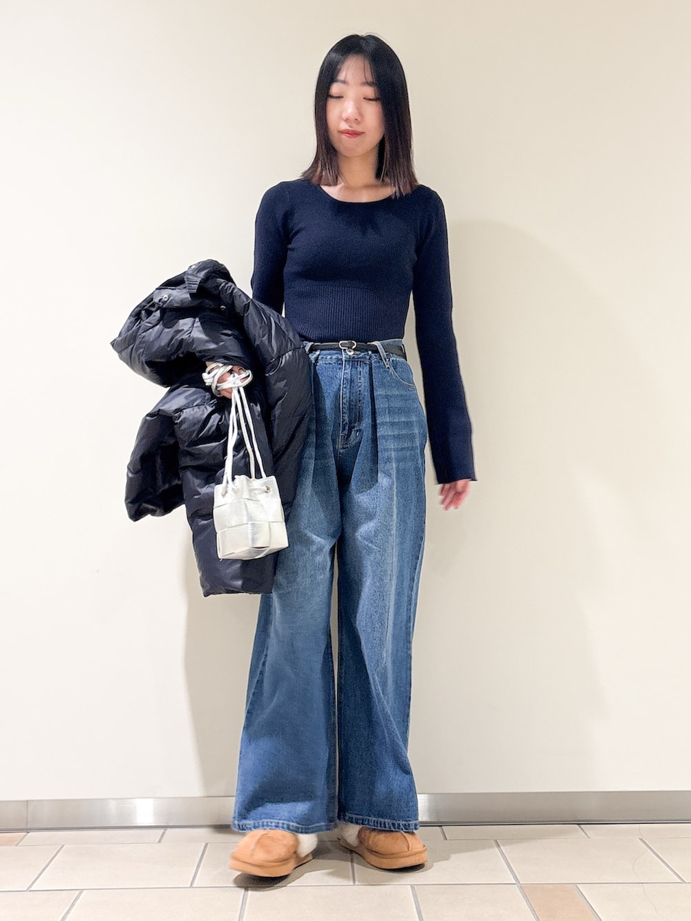 中に合わせたニットは黒宮2色買いしました!!コンパクトめなサイズに見えますが、実はストレッチがすごく効いてて着脱も楽ちんなんです!!