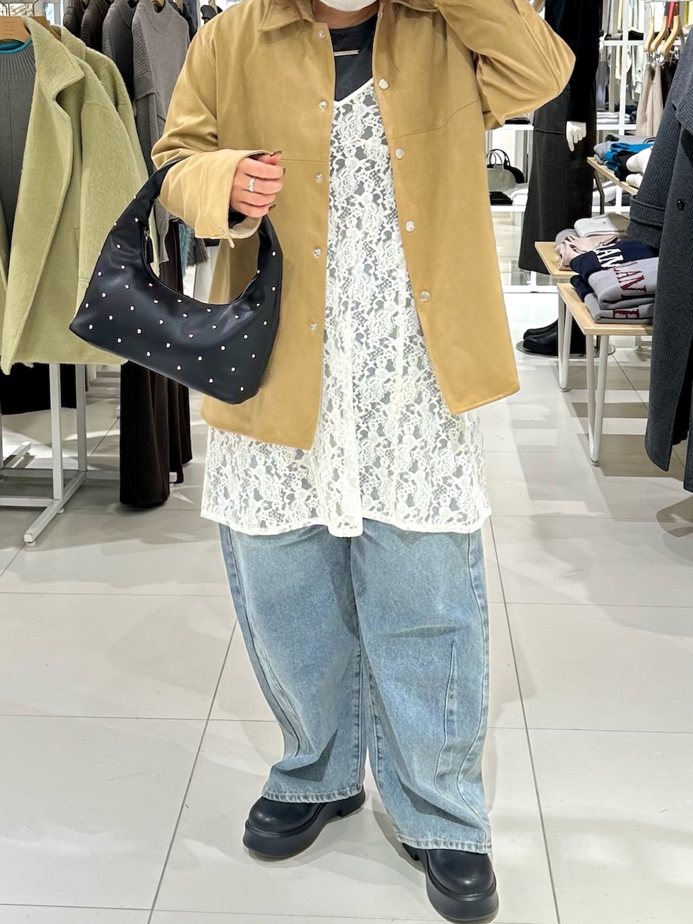 中のレースキャミと、スタッズのバッグを取り入れて個性を出して、ゆるっと甘めに合わせるのがオススメです✨